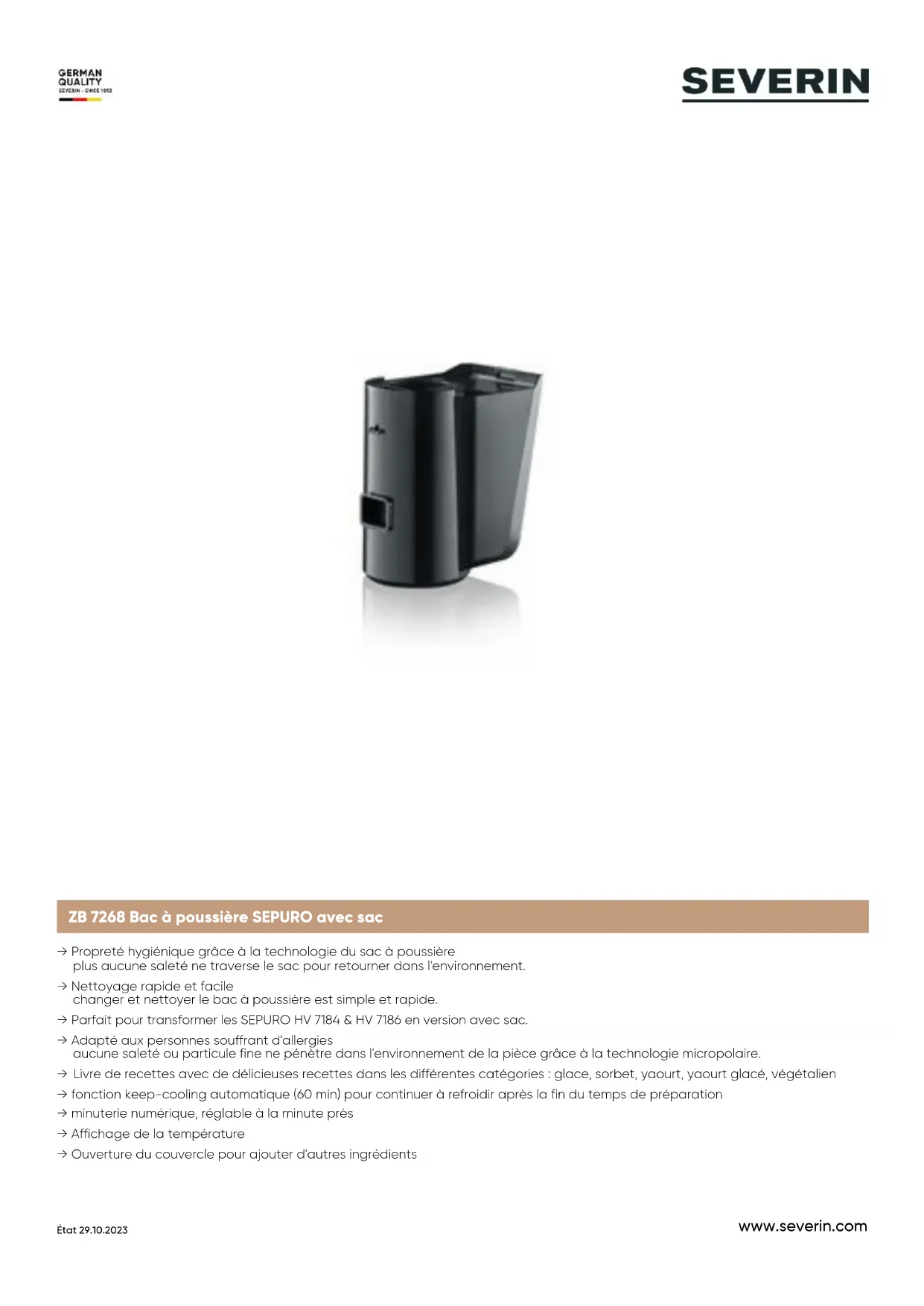 - Parfait pour transformer les SEPURO HV 7184 & HV 7186 en version avec sac.