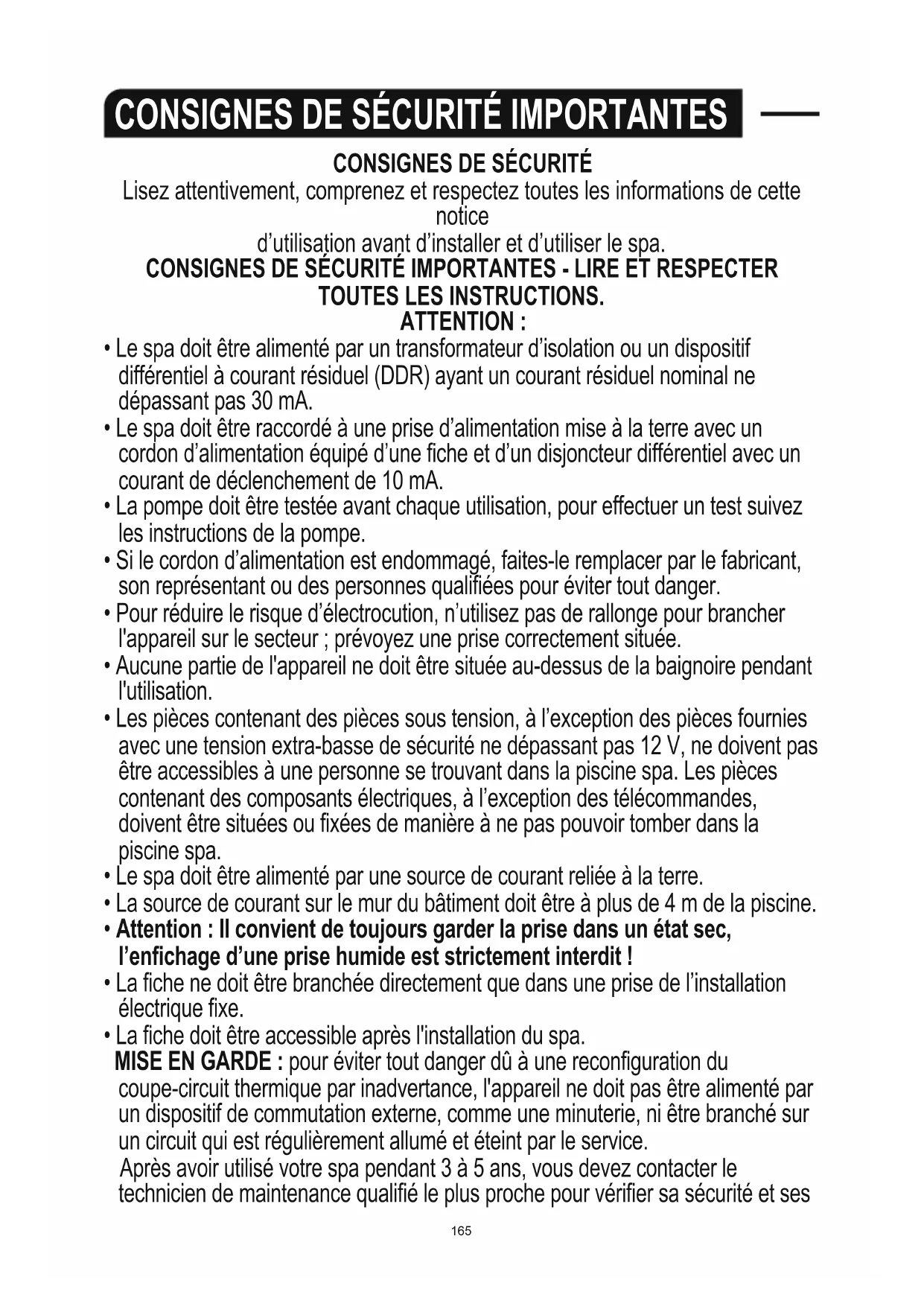 - Ces mises en garde, instructions et consignes de sécurité traitent de certains risques courants liés aux loisirs aquatiques, mais ils ne peuvent en aucun cas couvrir tous les risques et dangers. Prenez toujours des précautions et faites preuve de bon sens quand vous pratiquez des activités aquatiques. Conservez ces informations afin de pouvoir les consulter en cas de besoin. De plus, les informations suivantes peuvent être fournies en fonction du type de spa : Sécurité des personnes ne sachant pas nager - La surveillance continue, active et vigilante des personnes ne sachant pas nager ou ne nageant pas très bien par un adulte expérimenté est toujours nécessaire, notamment dans les spas fitness (en n'oubliant pas que les enfants de moins de 5 ans courent le plus de risques de noyade). - Désignez un adulte expérimenté pour surveiller le spa à chaque fois qu’il est utilisé. - Les personnes ne sachant pas nager ou nageant mal doivent porter un équipement de protection individuelle, notamment lorsqu’elles utilisent le spa fitness. - Quand le spa n’est pas utilisé ou surveillé, enlevez tous les jouets du spa et de ses alentours pour éviter d’attirer les enfants vers le spa. Dispositifs de sécurité - Une bâche de sécurité ou un autre dispositif de protection de la sécurité doit être utilisé, ou toutes les portes ou fenêtres (le cas échéant) doivent être fermées pour prévenir tout accès non autorisé au spa. - Les barrières, les bâches, les alarmes ou autres dispositifs de sécurité similaires sont utiles mais ne peuvent pas remplacer la surveillance continue et expérimentée d’un adulte. Équipement de sécurité - Il est recommandé de conserver un équipement de sauvetage (par ex. une bouée) près du spa (le cas échéant). - Conservez un téléphone en état de marche et une liste de numéros de téléphone de secours à proximité du spa. Utilisation du spa en toute sécurité - Incitez tous les utilisateurs, en particulier les enfants, à apprendre à nager. - Apprenez les gestes de premiers secours (réanimation cardio-pulmonaire - RCP) et rafraîchissez vos connaissances régulièrement. Cela peut faire une différence vitale en cas d’urgence. - Enseignez à tous les utilisateurs du spa, y compris les enfants, ce qu’il faut faire en cas d’urgence. - Ne plongez jamais dans une eau peu profonde. Cela peut provoquer des blessures graves voire mortelles. - N’utilisez pas le spa quand vous buvez de l’alcool ou que vous prenez des médicaments car cela peut nuire à vos capacités d’utiliser le spa en toute sécurité. - Quand vous utilisez des bâches, enlevez-les complètement de la surface de l'eau avant de pénétrer dans le spa. - Protégez les occupants du spa des maladies liées à l'eau en traitant l'eau du spa et en ayant une bonne hygiène. Consultez les consignes pour le traitement de l'eau dans la notice d'utilisation. - Rangez les produits chimiques et les accessoires hors de portée des enfants. - Installez les panneaux fournis sur le spa ou à une distance de 2 000 mm du spa de manière clairement visible. - Une fois retirées, les échelles amovibles doivent être conservées de manière sûre pour que les enfants ne puissent y grimper DEMANDEZ CONSEIL À VOTRE MÉDECIN. ATTENTION :