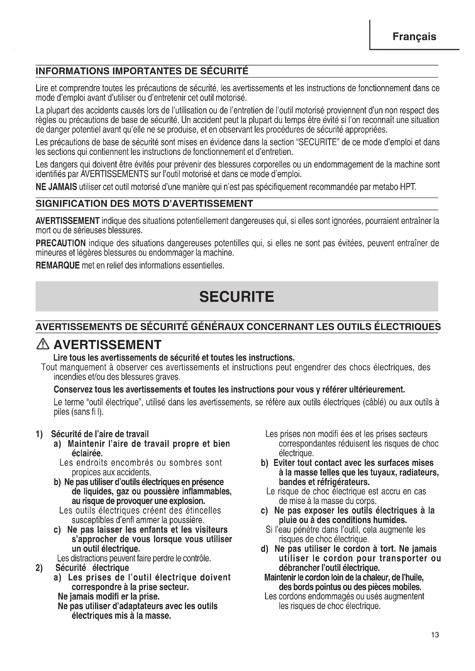 Lire et comprendre toutes les précautions de sécurité, les avertissements et les instructions de fonctionnement dans ce mode d’emploi avant d’utiliser ou d’entretenir cet outil motorisé. La plupart des accidents causés lors de l’utilisation ou de l’entretien de l’outil motorisé proviennent d’un non respect des règles ou précautions de base de sécurité. Un accident peut la plupart du temps être évité si l’on reconnaît une situation de danger potentiel avant qu’elle ne se produise, et en observant les procédures de sécurité appropriées. Les précautions de base de sécurité sont mises en évidence dans la section “SECURITE” de ce mode d’emploi et dans les sections qui contiennent les instructions de fonctionnement et d’entretien. Les dangers qui doivent être évités pour prévenir des blessures corporelles ou un endommagement de la machine sont identifi és par AVERTISSEMENTS sur l’outil motorisé et dans ce mode d’emploi. NE JAMAIS utiliser cet outil motorisé d’une manière qui n’est pas spécifi quement recommandée par metabo HPT.