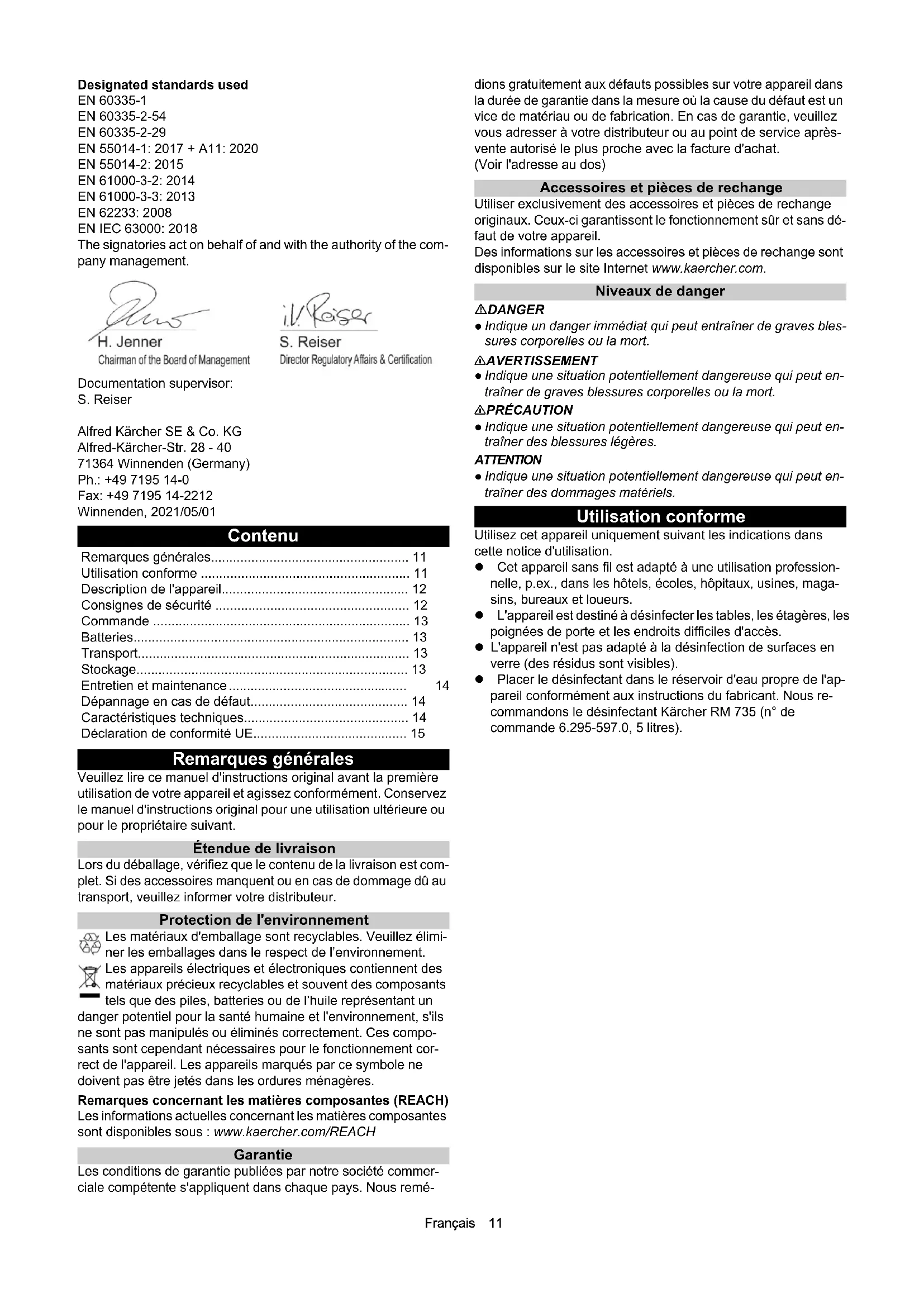 Consignes de sécurité Consignes de sécurité générales DANGER ● Risque d'asphyxie. Ne laissez pas les matériaux d'emballage à la portée des enfants. 몇 AVERTISSEMENT ● Utilisez l'appareil uniquement confor- mément à l’usage prévu. Respectez les conditions locales et por- tez attention aux tiers, en particulier aux enfants, lors de travaux avec l’appareil. ● Les personnes dont les capacités physiques sensorielles ou mentales sont réduites ou qui manquent d'expé- rience ou de connaissance peuvent utiliser l'appareil, si elles sont correctement surveillées ou si elles ont été instruites sur l'utilisa- tion sûre de l'appareil et comprennent les dangers qui en ré- sultent. ● Seules les personnes instruites dans la manipulation de l’appareil ou ayant prouvé leurs compétences pour la com- mande et étant expressément chargées de son utilisation sont habilitées à utiliser l’appareil. ● Les enfants ne sont pas autorisés à utiliser l’appareil. ● Surveillez les enfants pour s’assurer qu’ils ne jouent pas avec l’appareil. 몇 PRÉCAUTION ● Les dispositifs de sécurité servent à assurer votre sécurité. Ne modifiez ou ne dérivez jamais les dispositifs de sécurité. Risque d'électrocution DANGER ● Ne raccordez des appareils de la classe de protection I qu'à des sources de courant mises à la terre correc- tement. ● Les indication de la tension sur la plaque signalétique doivent correspondre à la tension de la source de courant. ● Ne touchez jamais aux fiches secteur et prises de courant avec les mains mouillées. 몇 AVERTISSEMENT ● Mettez immédiatement l'appareil hors tension en cas de fuites. ● Avant chaque utilisation, vérifiez que le câble d'alimentation avec prise murale n'est pas endommagé. N'utilisez pas un appareil dont le câble d'alimentation est endom- magé. Faites immédiatement remplacer un câble d'alimentation endommagé par le SAV autorisé / un électricien spécialisé. ● N'utilisez qu’un câble d'alimentation électrique prescrit par le fabricant. Fonctionnement DANGER ● Lors de l’utilisation de l’appareil dans des zones dangereuses (p.ex. stations service), respectez les consignes de sécurité correspondantes. ● L'utilisation dans des zones sou- mises à des risques d'explosion est interdite. ● Ne vaporisez ja- mais de liquides explosifs, comme de l'essence, du diluant pour peinture ou de fioul, qui peuvent former avec l’air des vapeurs ou mélanges explosifs. Ne vaporisez pas d'acétone, d'acides non di- lués, de solvants ou de substances hautement corrosives telles que le chlore actif car ils attaquent les matériaux utilisés sur l'ap- pareil. ● N'utilisez pas l'appareil pour désinfecter des appareils électriques, p. ex. four, hotte d'aspiration, micro-ondes, télévi- sion, lampe, sèche-cheveux, chauffage électrique, etc. 몇 PRÉCAUTION ● Vérifiez le bon état et la sécurité du fonction- nement de l’appareil et des accessoires, en particulier du câble d'alimentation électrique, de la fermeture de sécurité et du flexible vapeur, avant chaque fonctionnement. En cas de dom- mage, débranchez la fiche secteur et n'utilisez pas l'appareil. ATTENTION ● N'utilisez pas l'appareil à des températures infé- rieures à 0 °C. ● Pour les appareils professionnels utilisés sur dif- férents sites, observez les contrôles de sécurité selon les directives locales en vigueur Utilisation d’un agent désinfectant 몇 PRÉCAUTION ● Conservez l’agent désinfectant hors de la portée des enfants. ● N’utilisez pas les agents désinfectants re- commandés non dilués. Respectez toujours toutes les informa-Français 13 tions sur l'étiquette du produit. En cas de contact de l’agent désinfectant avec les yeux, rincez-les aussitôt à l'eau et en cas d'ingestion d’agent désinfectant, consultez un médecin immédia- tement. ● Utilisez uniquement les agents désinfectants recom- mandés par le fabricant et respectez les instructions d'application, d'élimination et d'avertissement des fabricants d’agents désinfectants. ● Assurez-vous que la zone de travail est suffisamment ventilée pour éviter l’inhalation d’aérosols. Portez une protection respiratoire appropriée dans les pièces mal venti- lées. Entretien et maintenance 몇 AVERTISSEMENT ● Avant le nettoyage, la maintenance et le remplacement de pièces, désactiver l’appareil. Débranchez la fiche secteur des appareils fonctionnant sur secteur. Sur les ap- pareils fonctionnant sur batterie, débranchez la batterie. 몇 PRÉCAUTION ● Faites réaliser les réparations uniquement par le point de service après-vente autorisé ou par des spécia- listes du domaine familiarisés avec toutes les consignes de sécu- rité importantes. ATTENTION ● Court-circuits ou autres dommages. Ne nettoyez pas l'appareil avec un flexible ou jet d’eau sous forte pression. Commande Mise en service DANGER Agents désinfectants inappropriés Risque de blessures N'utiliser que des produits KÄRCHER. Ne remplissez jamais de solvants, de liquides inflammables (p. ex. essence, acétone, diluant) ou d’agent désinfectants à base d'alcool. Utiliser des gants et des lunettes de protection lors de la manipu- lation du détergent désinfectant. Eviter le contact avec les yeux et la peau. Respectez les consignes de sécurité et de manipulation figurant sur les étiquettes du produit ou dans les fiches de données de sé- curité de l’agent désinfectant. 몇 AVERTISSEMENT Risque de blessures Vérifiez l'état impeccable de l'appareil, des accessoires, des conduites d'alimentation et des raccordements. N'utilisez pas l'appareil s'il n'est pas dans un état impeccable. 1 Vérifier l'état de charge de la batterie sur l'indicateur de charge de la batterie sur l'appareil. Voyant vert - aucune charge de batterie requise Voyant jaune - charge de la batterie recommandée Voyant rouge - chargez la batterie Pour plus d'inform