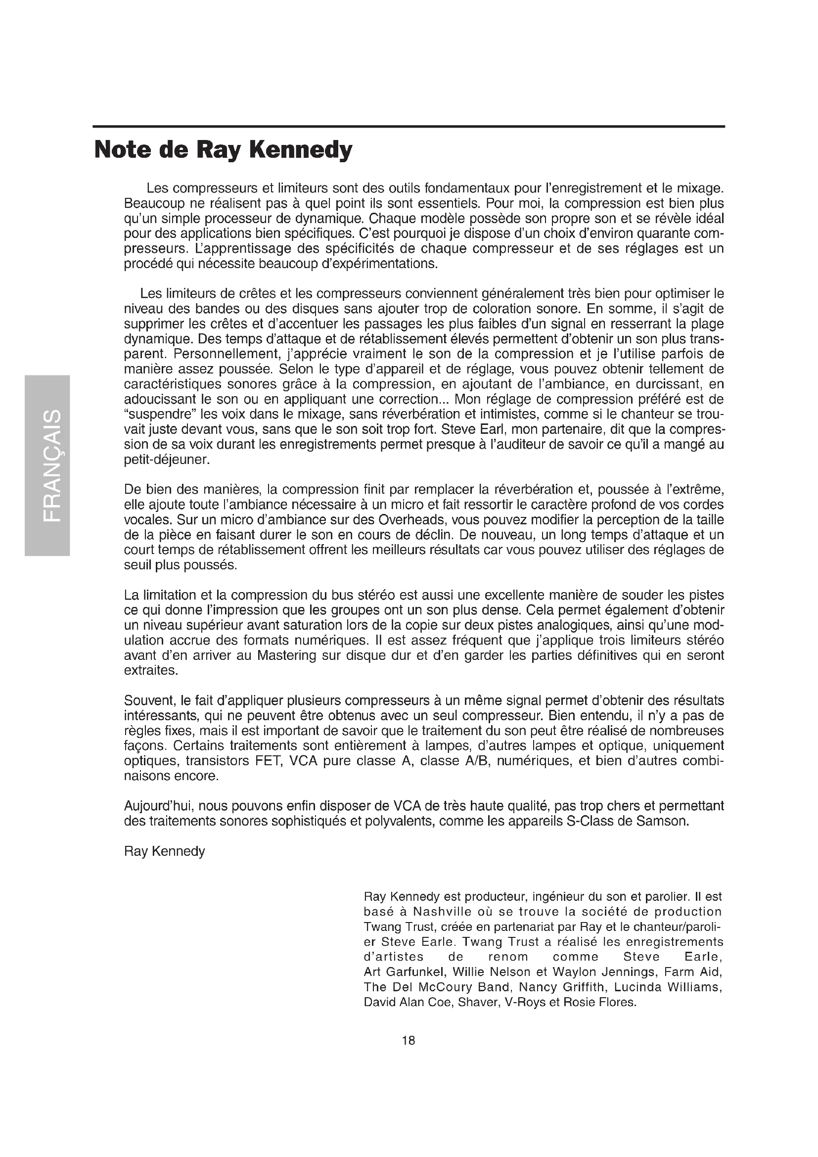Signal (tip)Signal (ring)Signal (tip)Signal (ring)Ring (signal)Sleeve (ground)GroundGround IN-LINE In live sound operation the S•com plus can be installed in-line between a mixer and equalizer or power amplifier. For these applications the S•com plus provides both 1/4" TRS connectors and XLR connectors to easily interface with most any professional audio device. Follow the wiring examples below for your particular installation. Balanced TRS 1/4” Connector ENGLISH18 FRANÇAIS Note de Ray Kennedy Les compresseurs et limiteurs sont des outils fondamentaux pour l’enregistrement et le mixage. Beaucoup ne réalisent pas à quel point ils sont essentiels. Pour moi, la compression est bien plus qu’un simple processeur de dynamique. Chaque modèle possède son propre son et se révèle idéal pour des applications bien spécifiques. C’est pourquoi je dispose d’un choix d’environ quarante com- presseurs. L’apprentissage des spécificités de chaque compresseur et de ses réglages est un procédé qui nécessite beaucoup d’expérimentations. Les limiteurs de crêtes et les compresseurs conviennent généralement très bien pour optimiser le niveau des bandes ou des disques sans ajouter trop de coloration sonore. En somme, il s’agit de supprimer les crêtes et d’accentuer les passages les plus faibles d’un signal en resserrant la plage dynamique. Des temps d’attaque et de rétablissement élevés permettent d’obtenir un son plus trans- parent. Personnellement, j’apprécie vraiment le son de la compression et je l’utilise parfois de manière assez poussée. Selon le type d’appareil et de réglage, vous pouvez obtenir tellement de caractéristiques sonores grâce à la compression, en ajoutant de l’ambiance, en durcissant, en adoucissant le son ou en appliquant une correction... Mon réglage de compression préféré est de “suspendre” les voix dans le mixage, sans réverbération et intimistes, comme si le chanteur se trou- vait juste devant vous, sans que le son soit trop fort. Steve Earl, mon partenaire, dit que la compres- sion de sa voix durant les enregistrements permet presque à l’auditeur de savoir ce qu’il a mangé au petit-déjeuner. De bien des manières, la compression finit par remplacer la réverbération et, poussée à l’extrême, elle ajoute toute l’ambiance nécessaire à un micro et fait ressortir le caractère profond de vos cordes vocales. Sur un micro d’ambiance sur des Overheads, vous pouvez modifier la perception de la taille de la pièce en faisant durer le son en cours de déclin. De nouveau, un long temps d’attaque et un court temps de rétablissement offrent les meilleurs résultats car vous pouvez utiliser des réglages de seuil plus poussés. La limitation et la compression du bus stéréo est aussi une excellente manière de souder les pistes ce qui donne l’impression que les groupes ont un son plus dense. Cela permet également d’obtenir un niveau supérieur avant saturation lors de la copie sur deux pistes analogiques, ainsi qu’une mod- ulation accrue des formats numériques. Il est assez fréquent que j’applique trois limiteurs stéréo avant d’en arriver au Mastering sur disque dur et d’en garder les parties définitives qui en seront extraites. Souvent, le fait d’appliquer plusieurs compresseurs à un même signal permet d’obtenir des résultats intéressants, qui ne peuvent être obtenus avec un seul compresseur. Bien entendu, il n’y a pas de règles fixes, mais il est important de savoir que le traitement du son peut être réalisé de nombreuses façons. Certains traitements sont entièrement à lampes, d’autres lampes et optique, uniquement optiques, transistors FET, VCA pure classe A, classe A/B, numériques, et bien d’autres combi- naisons encore. Aujourd’hui, nous pouvons enfin disposer de VCA de très haute qualité, pas trop chers et permettant des traitements sonores sophistiqués et polyvalents, comme les appareils S-Class de Samson. Ray Kennedy Ray Kennedy est producteur, ingénieur du son et parolier. Il est basé à Nashville où se trouve la société de production Twang Trust, créée en partenariat par Ray et le chanteur/paroli- er Steve Earle. Twang Trust a réalisé les enregistrements d’artistes de renom comme Steve Earle, Art Garfunkel, Willie Nelson et Waylon Jennings, Farm Aid, The Del McCoury Band, Nancy Griffith, Lucinda Williams, David Alan Coe, Shaver, V-Roys et Rosie Flores.19 Caractéristiques du S•com plus Le processeur de dynamique Samson S com Plus utilise une technologie de pointe en matière de gestion du gain. Voici quelques-unes de ses principales caractéristiques :