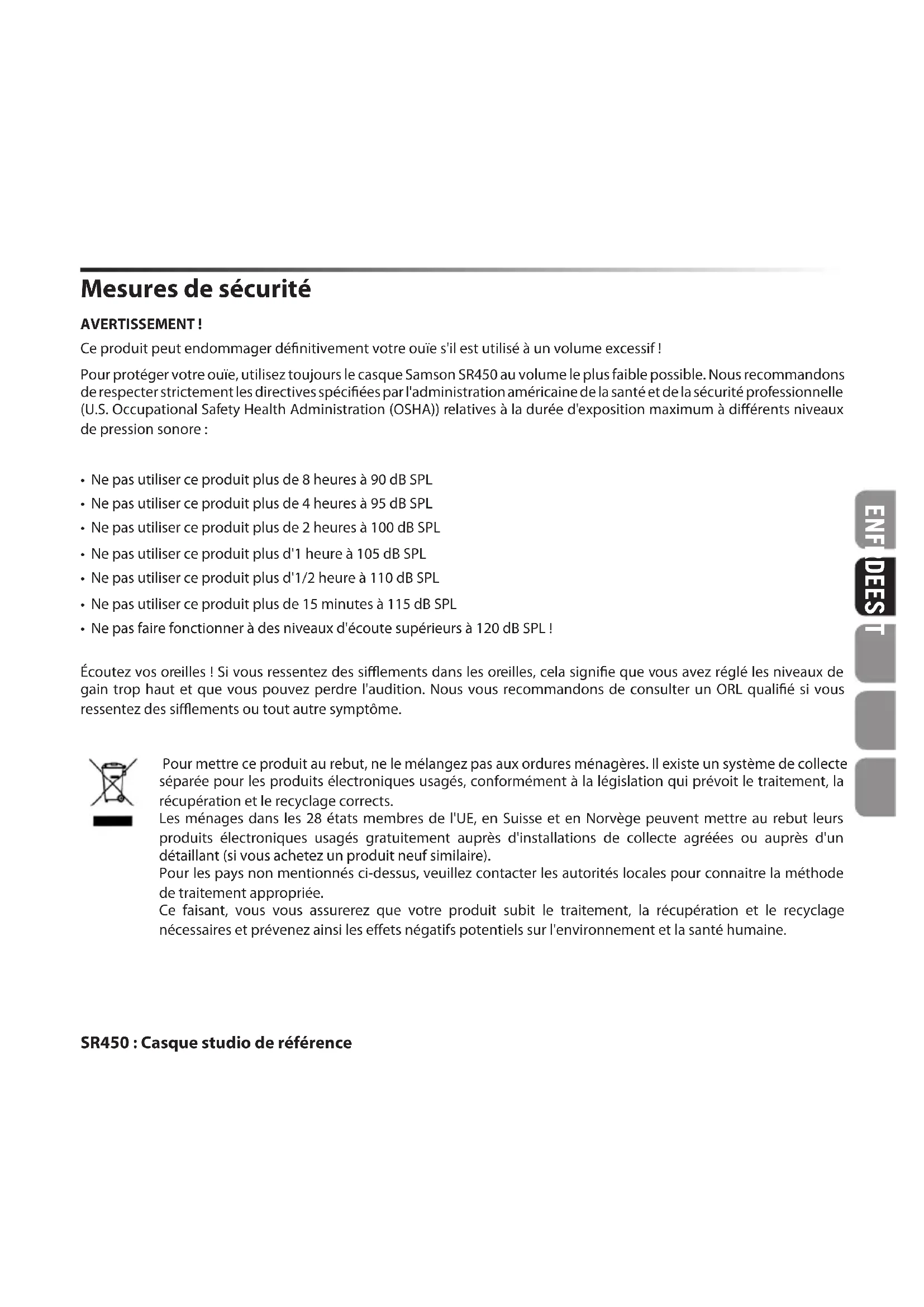 - Includes 1/8” to 1/4” gold-plated adapterDriver type Dynamic Type Supra-aural, Closed-Back Driver Unit 40 mm Neodymium magnet Frequency response 20 Hz - 20 kHz Impedance 32 ±10% Sensitivity 110 dB / 1 mW ±3 dB Connector Gold-plated ⁄” (3.5 mm) stereo mini connector with 1/8” (3.5 mm) to 1/4” (6.3 mm) adapter Cable 8.25’ (2.5 m) long Weight 5.64 oz (160 g) Specications subject to change without notice. SpecicationsSR450: Casque studio de référence EN FR DE ES IT Mesures de sécurité AVERTISSEMENT! Ce produit peut endommager dénitivement votre ouïe s'il est utilisé à un volume excessif! Pour protéger votre ouïe, utilisez toujours le casque Samson SR450 au volume le plus faible possible. Nous recommandons de respecter strictement les directives spéciées par l'administration américaine de la santé et de la sécurité professionnelle (U.S. Occupational Safety Health Administration (OSHA)) relatives à la durée d'exposition maximum à diérents niveaux de pression sonore: