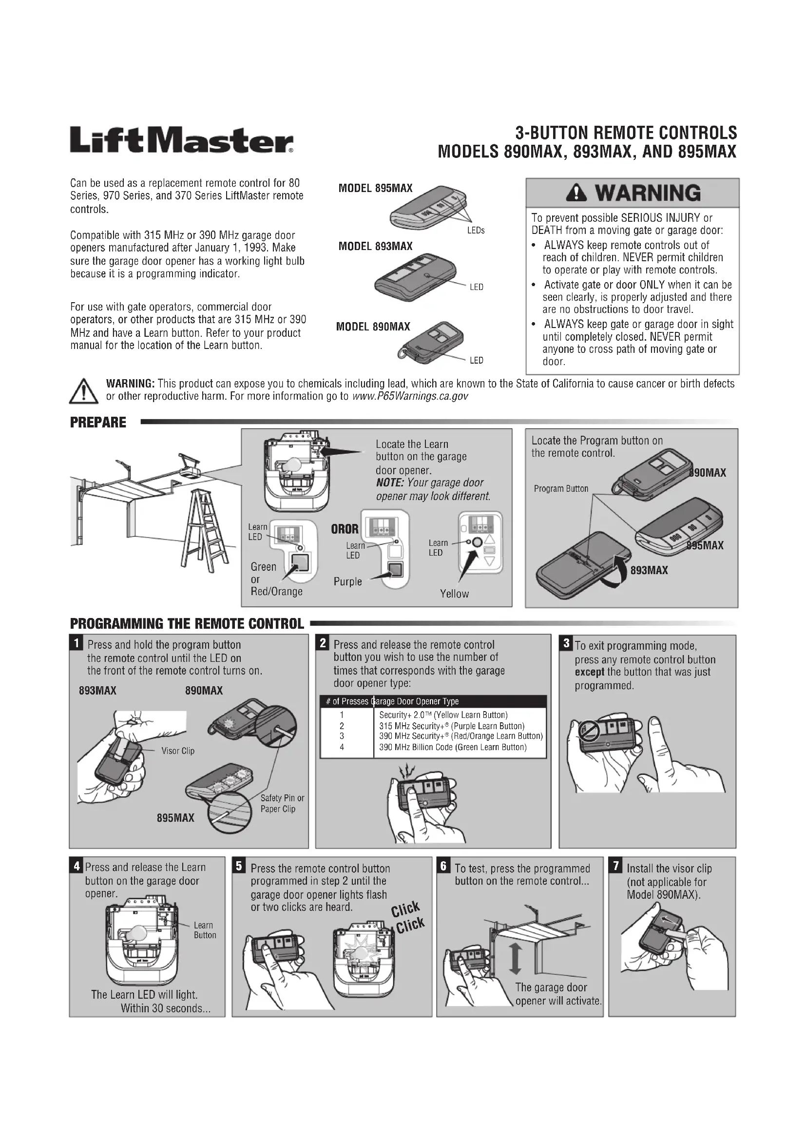 895MAX Voyants DEL 890MAX 895MAX 893MAX Utilisation possible en tant que télécommande de remplacement aux télécommandes LiftMaster séries 80, 970 et 370.Compatibles avec les ouvre-portes de garage 315 MHz ou 390 MHz, fabriqués après le 1er janvier 1993. S’assurer que l’éclairage de l’ouvre-porte de garage fonctionne, dans la mesure où il s’agit d’un témoin de programmation.Pour une utilisation avec des actionneurs de barrière, des actionneurs commerciaux de porte ou d’autres produits fonctionnant à une fréquence de 315 MHz ou 390 MHz et équipés de bouton « Learn ». Reportez-vous au manuel de votre produit pour connaître l’emplacement du bouton « Learn ». AVERTISSEMENT : Ce produit peut vous exposer à des produits chimiques comme le plomb, reconnu par l’État de la Californie comme cause de cancers, d’anomalies congénitales et d’autres problèmes liés à la reproduction. Pour plus d’informations, visitez www.P65Warnings.ca.govPILE Le ou les voyants DEL de la télécommande s’arrêtent de clignoter lorsque la pile est faible et doit être remplacée. Pour remplacer la pile, ouvrir le boîtier, comme illustré. Insérer la pile avec le côté positif vers le haut (+). Remplacer la pile uniquement avec des piles boutons 3V CR2032 ou 3V CR2016 (selon le modèle). Se débarrasser de la pile usagée convenablement. Pour prévenir d’éventuelles BLESSURES GRAVES ou LA MORT :