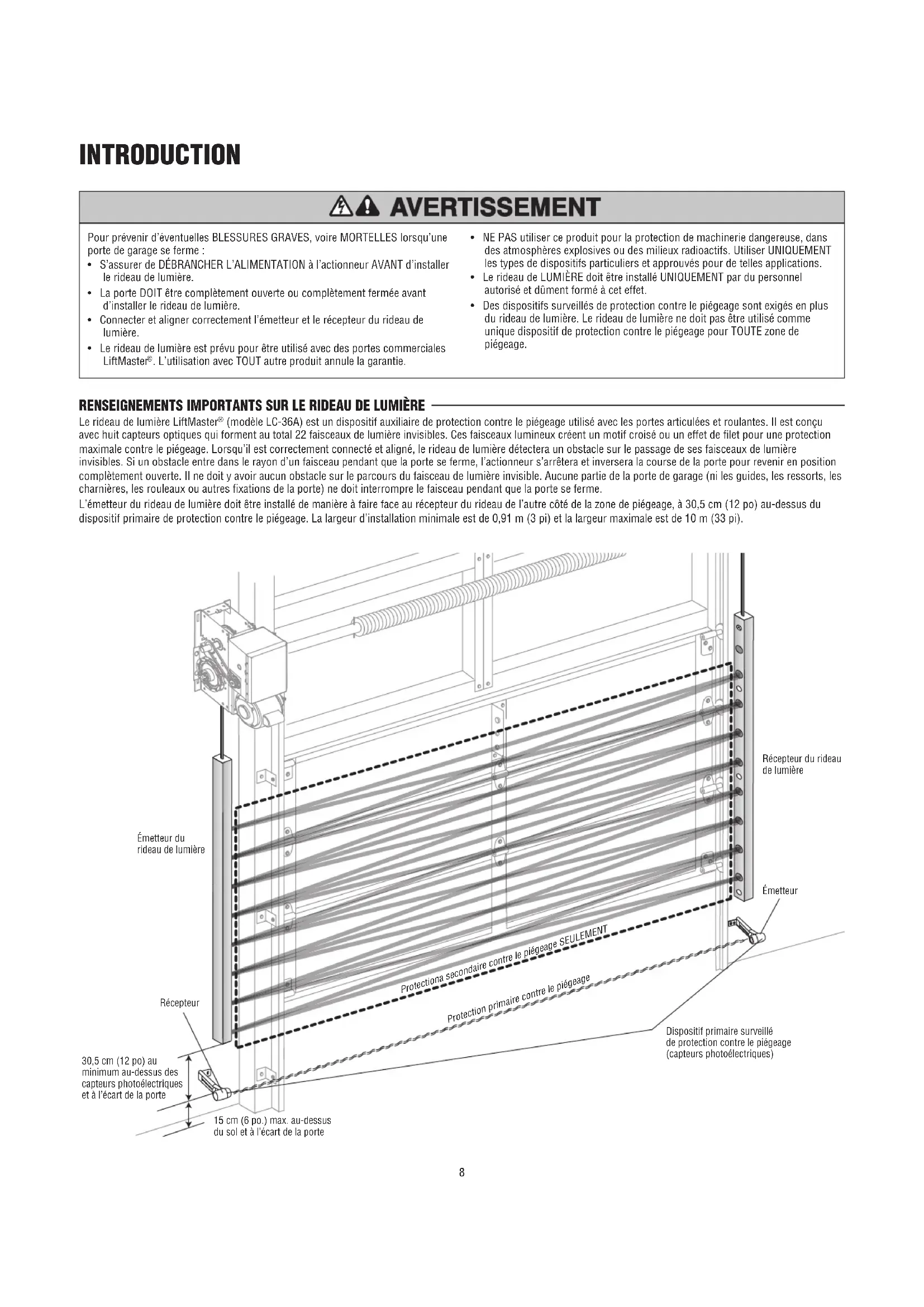 - Des dispositifs surveillés de protection contre le piégeage sont exigés en plus du rideau de lumière. Le rideau de lumière ne doit pas être utilisé comme unique dispositif de protection contre le piégeage pour TOUTE zone de piégeage. ATTENTION AVERTISSEMENT AVERTISSEMENT AVERTISSEMENT 15 cm (6 po.) max. au-dessus du sol et à l’écart de la porteRécepteur du rideau de lumièreÉmetteur du rideau de lumière30,5cm (12po) au minimum au-dessus des capteurs photoélectriques et à l’écart de la porteDispositif primaire surveillé de protection contre le piégeage (capteurs photoélectriques)Protectiona secondaire contre le piégeage SEULEMENT Protection primaire contre le piégeage RécepteurÉmetteur RENSEIGNEMENTS IMPORTANTS SUR LE RIDEAU DE LUMIÈRE Le rideau de lumière LiftMaster
