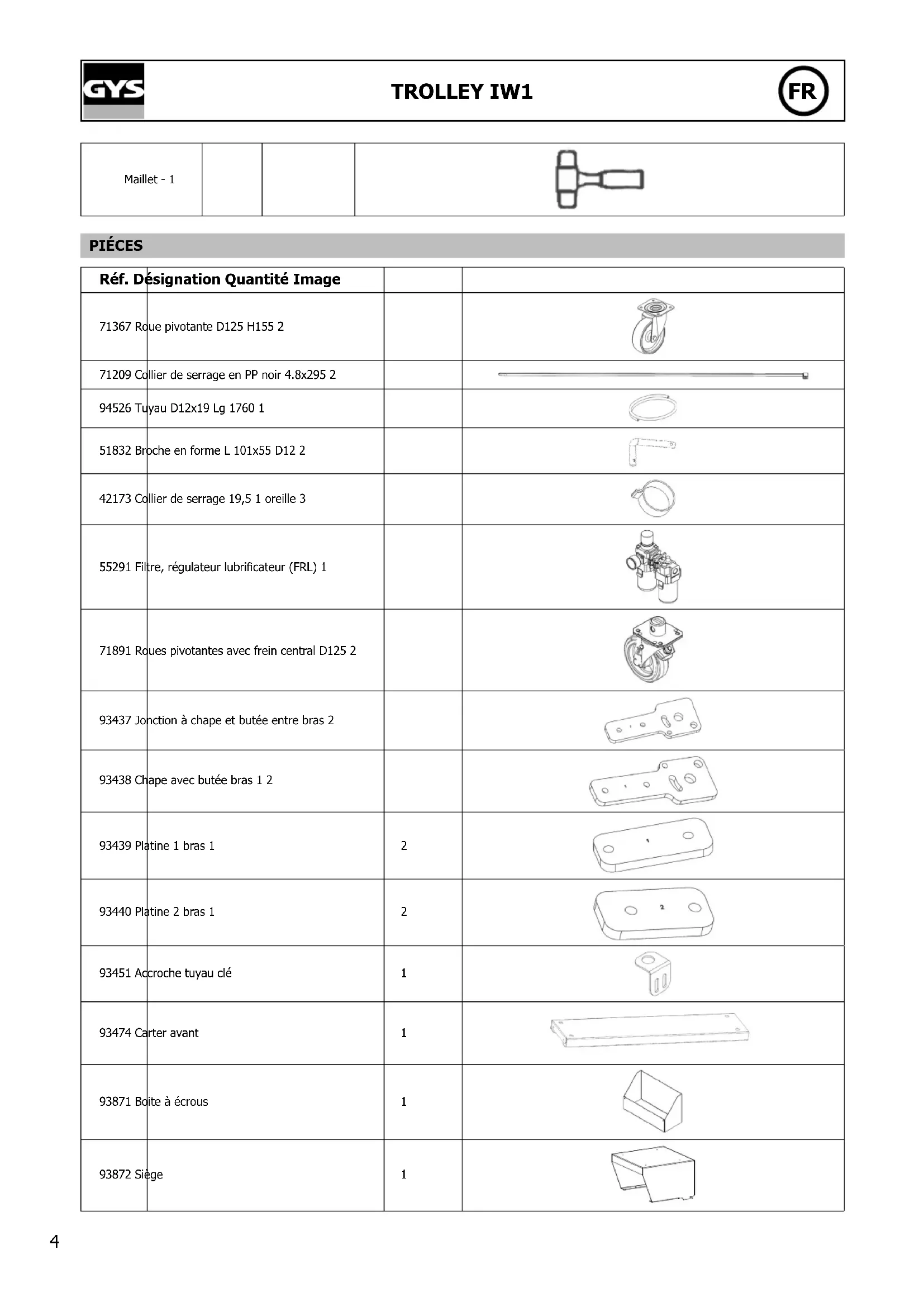 Maillet - 1 PIÉCES Réf. Désignation Quantité Image 71367 Roue pivotante D125 H155 2 71209 Collier de serrage en PP noir 4.8x295 2 94526 Tuyau D12x19 Lg 1760 1 51832 Broche en forme L 101x55 D12 2 42173 Collier de serrage 19,5 1 oreille 3 55291 Filtre, régulateur lubricateur (FRL) 1 71891 Roues pivotantes avec frein central D125 2 93437 Jonction à chape et butée entre bras 2 93438 Chape avec butée bras 1 2 93439 Platine 1 bras 1 2 93440 Platine 2 bras 1 2 93451 Accroche tuyau clé 1 93474 Carter avant 1 93871 Boite à écrous 1 93872 Siège 1