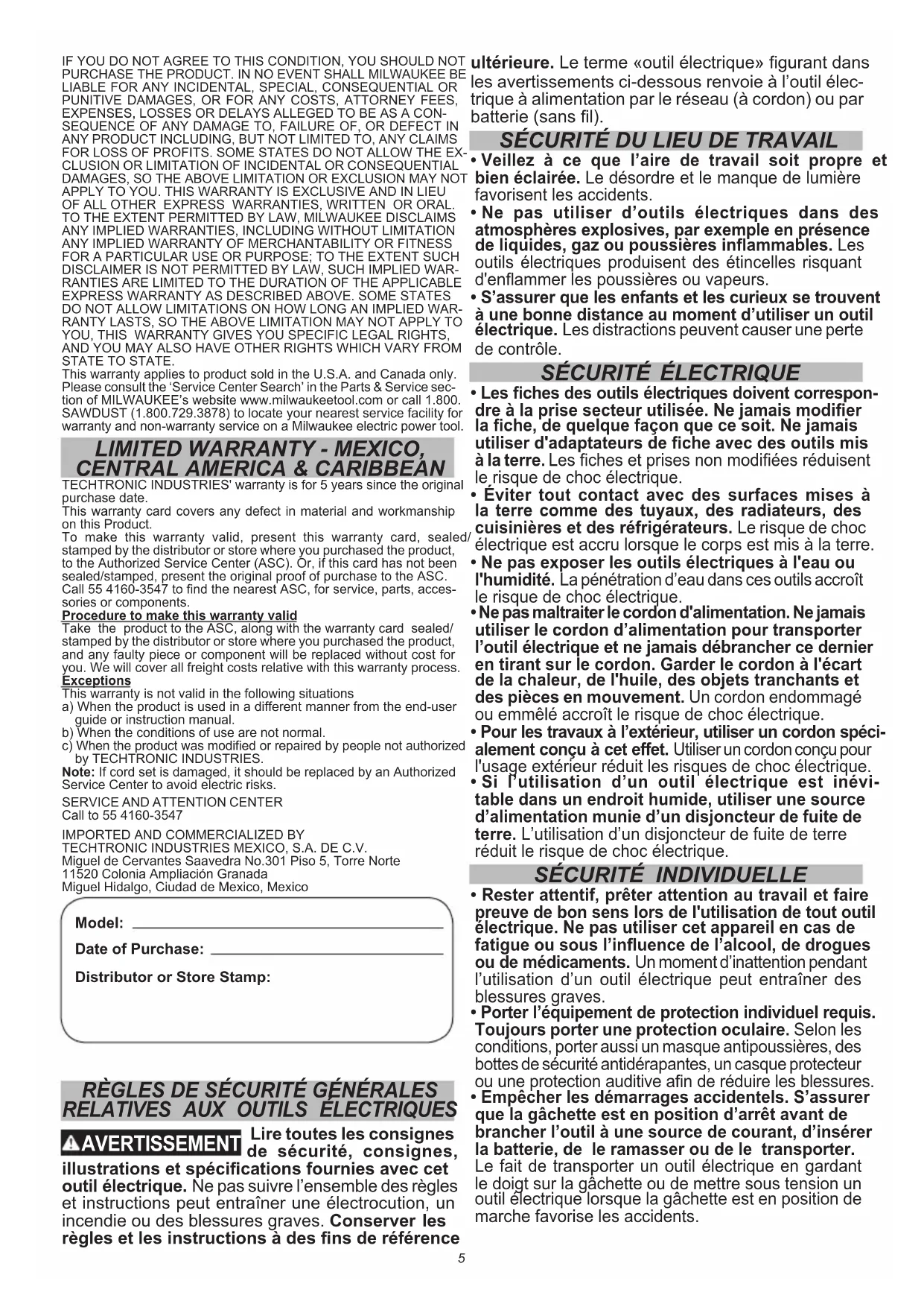 TECHTRONIC INDUSTRIES' garantit le produit pendant 5 ans à partir de la date d’achat d’origine. Le présent bon de garantie couvre tous les vices de matériau et de fabrication que peut afcher ce produit. Pour assurer la validité de la présente garantie, veuillez présenter ce bon de garantie, estampillé du sceau du distributeur ou du magasin où le produit a été acheté, au centre de réparations agréé. Si le bon de garantie n’a pas été estampillé, veuillez fournir la preuve d’achat d’origine au centre de réparations agréé. Pour un entretien des pièces, des accessoires ou des composants, composer 55 4160-3547 an d’obtenir les coordonnées du centre de réparations agréé le plus près. Procédure pour assurer la validité de la garantie Présenter le produit au centre de réparations agréé, accompagné du bon de garantie estampillé du sceau du distributeur ou du magasin où le produit a été acheté. Toute pièce défectueuse ou tout composant défectueux sera remplacé(e) sans frais. Milwaukee assume tous les frais de transport liés à ce processus de garantie. Exceptions9 Cette garantie ne s’applique pas dans les situations suivantes : a) Si le produit a été utilisé pour une n autre que celle indiquée dans le guide de l’utilisateur nal ou le manuel d’instructions. b) Si les conditions d’utilisations ne sont pas habituelles. c) Si le produit a été modié ou réparé par une personne non autorisée par TECHTRONIC INDUSTRIES. Remarque : Si le cordon électrique est endommagé, il doit être remplacé par un centre de réparations agréé pour éviter les risques d’électrocution. CENTRE DE RÉPARATIONS ET DE SERVICE Composer le 55 4160-3547