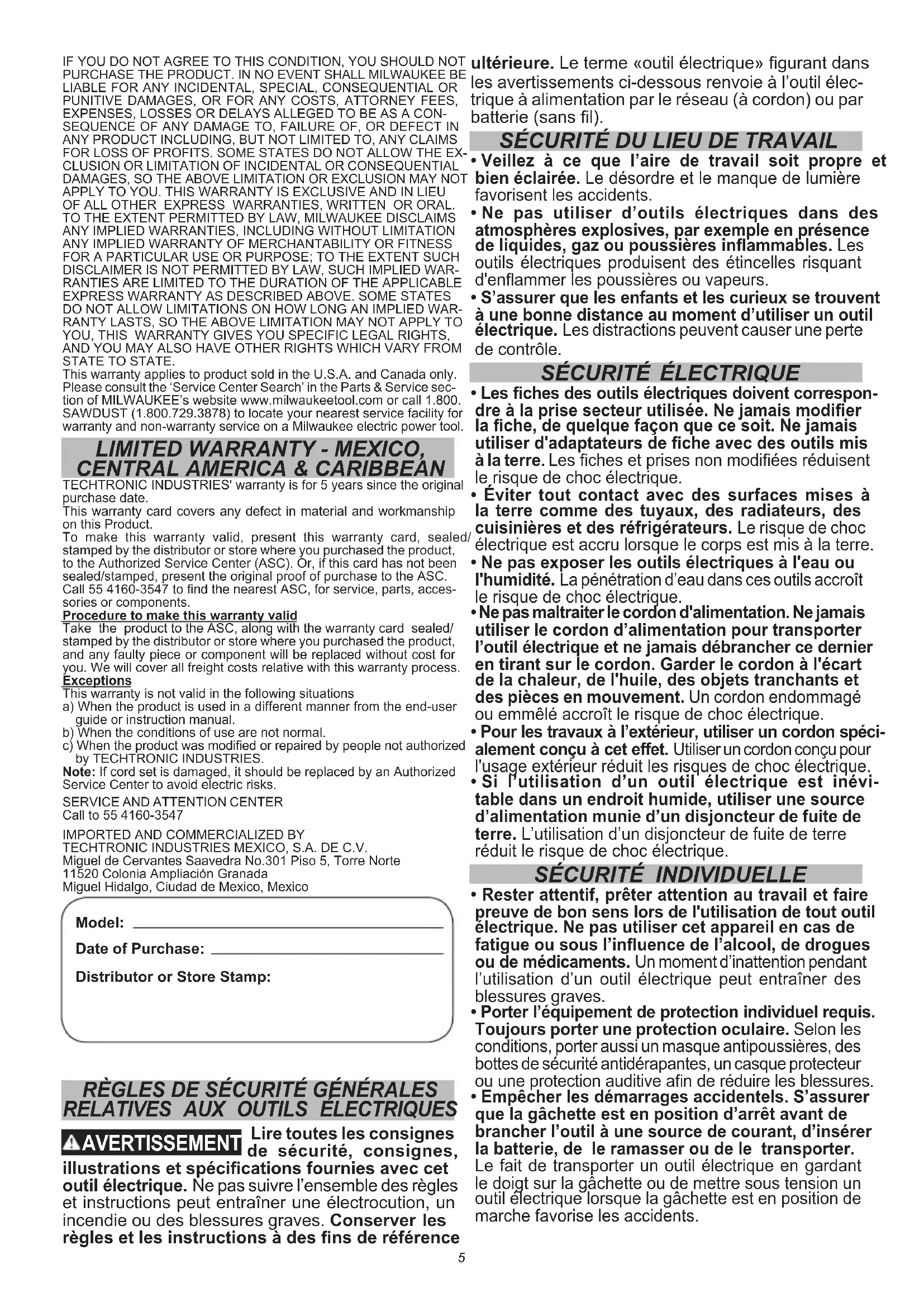 tion Pièces et Services du site Web de MILWAUKEE, à l’adresse www.milwaukeetool.com, ou composer le 1-800-SAWDUST (1-800-729-3878) an de trouver le centre de service de votre région le plus proche pour l’entretien, sous garantie ou non, de votre outil électrique Milwaukee. GARANTIE LIMITÉE – MEXIQUE,