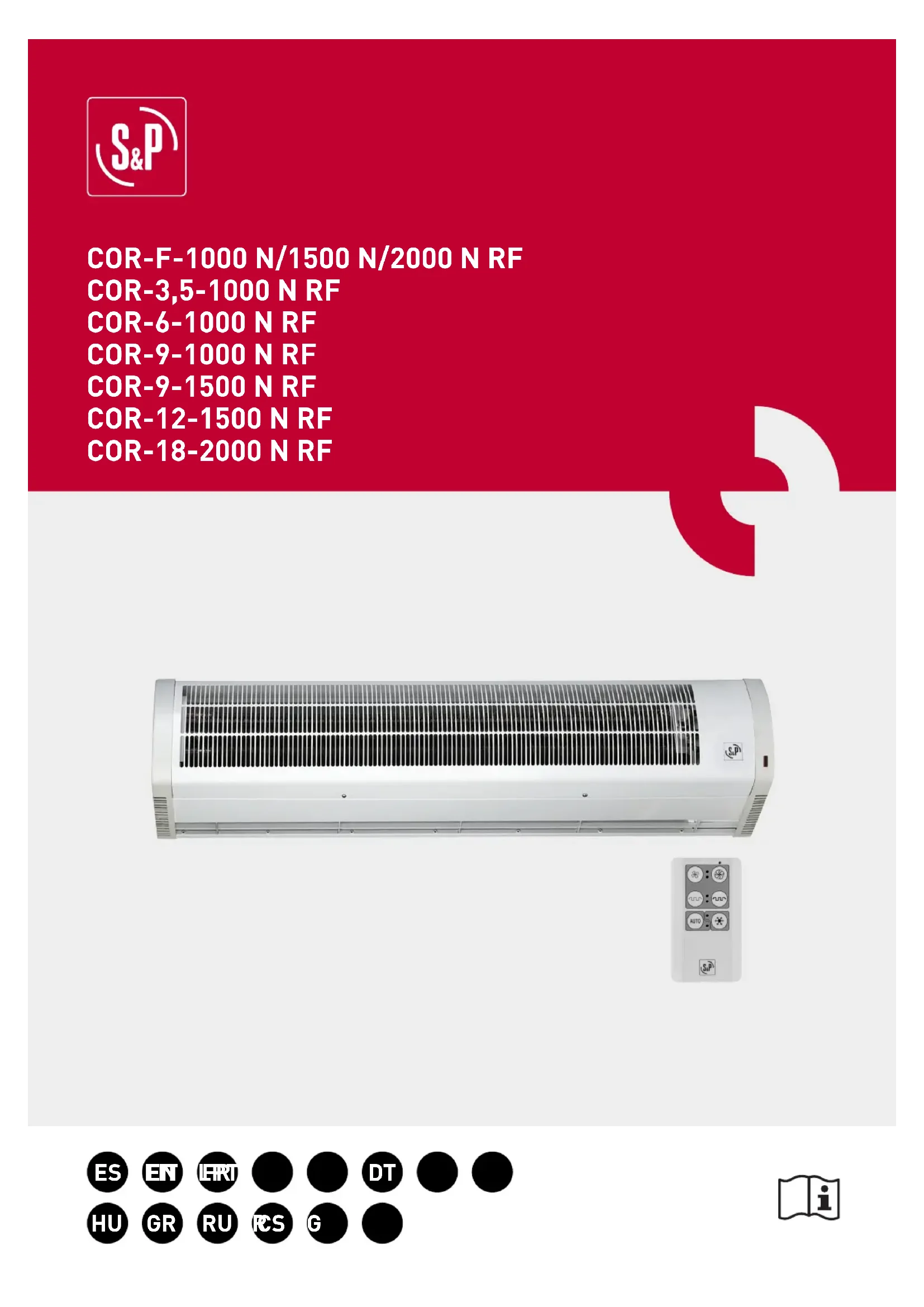 A part les modèles COR-F-1000 N, COR-F-1500 N et COR-F-2000 N, qui ne s’utilisent que comme rideaux d’air froid, les autres appareils de la gamme disposent de la double fonction rideau d’air froid et rideau d’air chaud. Vérifi er, dès l’avoir sorti de son emballage, le parfait état de l’appareil ainsi que son fonctionnement, étant donné que tout éventuel défaut d’origine est couvert par la garantie S&P.