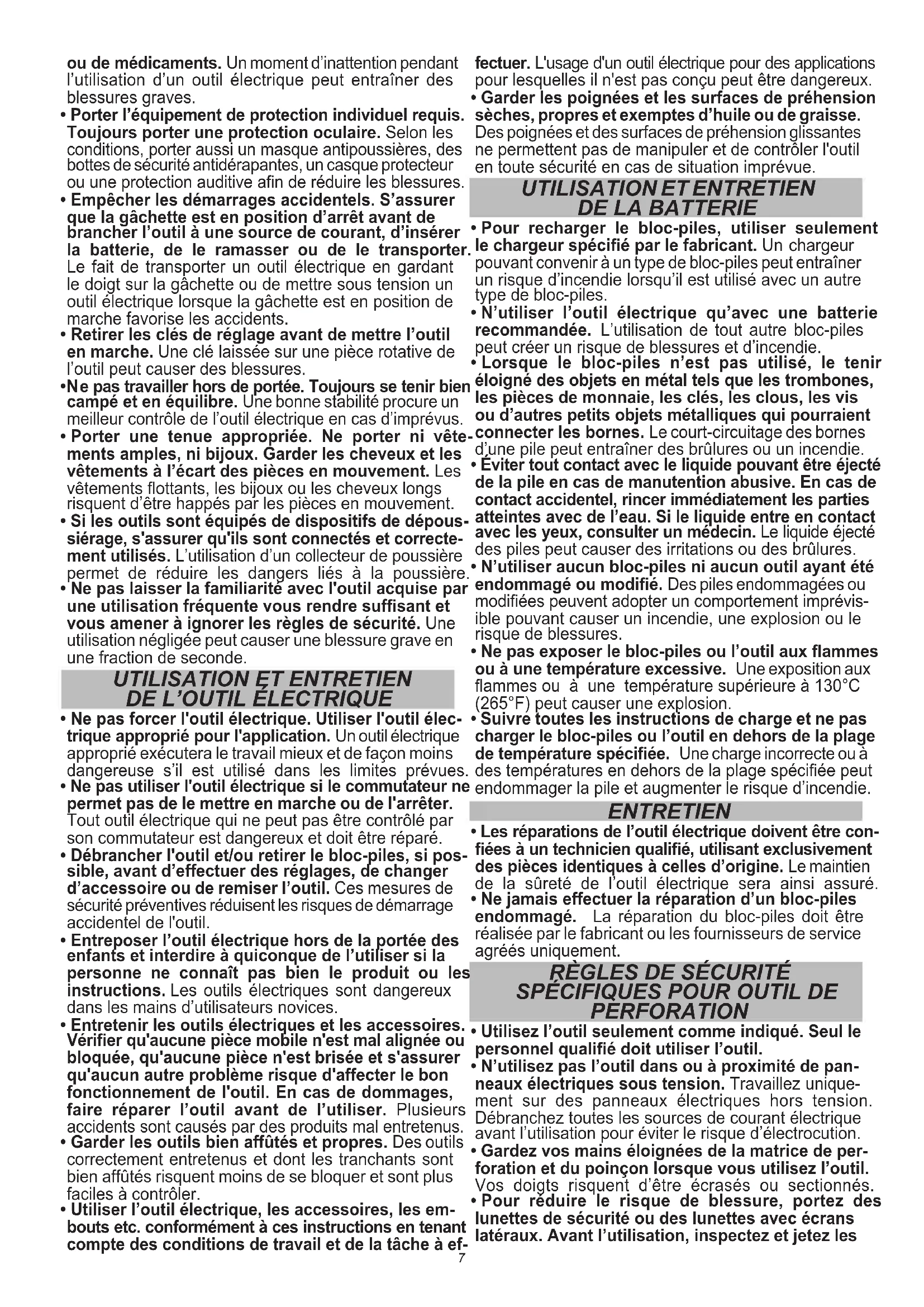 - Suivre toutes les instructions de charge et ne pas charger le bloc-piles ou l’outil en dehors de la plage de température spéciée. Une charge incorrecte ou à des températures en dehors de la plage spéciée peut endommager la pile et augmenter le risque d’incendie. ENTRETIEN