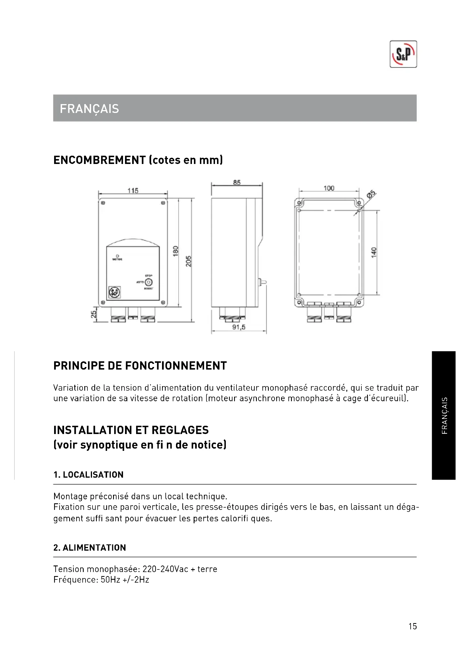 Type de variateur Intensité max moteur Fusible VAPZ-3 3A 5 x 20 mm 4A type F VAPZ-5 5A 5 x 20 mm 6.3A type F VAPZ-11 11A 6.3 x 32 mm 12.5A type F Protégé contre les surtensions; le fusible protège contre les surcharges et les court-circuits. Entrée analogique protégée contre l’inversion de polarité. Entrées isolées galvaniquement de la puissance.1919 FRANÇAIS Capacité de raccordement des bornes (conducteur “souple multibrins avec embout” ou “ri- gide”): 1 à 2.5 mm². Classe d’isolation électrique: 1. Boitier: Indice de protection: IP55. Matière: ABS V0. Couleur: RAL 7035. Fourni avec 4 presse-étoupes: 2 x Pg7 + 2 x Pg11. Stockage: -20°C à +60°C. Humidité relative: 30 à 90%. Environnement d’utilisation: Température: -10°C à +50°C Humidité relative: 30 à 95%. Entretien: sans; Il est conseillé de vérifi er à intervalles réguliers l’état et le serrage des con- nexions et que la température de voisinage se situe dans la plage acceptée par le variateur. Conformité aux normes: la déclaration CE de conformité est disponible. Le raccordement électrique doit être réalisé conformément à la norme relative à la sécurité des personnes NF C 15-100. pointes de mesure et trimmers pour réglages de Emin, Emax, Smin et Smax. De gauche à droite: switchs S1.1, S1.2 et S1.3. Alimentation 230V 50Hz (conforme à la NF C 15-100) Sortie moteur Relais EV gaz Vitesse maxi Marche/ Arrêt Ne pas oublier de raccorder la terre! L’installation doit être protégée en amont par un disjoncteur magnéto-thermique adapté.2020 FRANÇAIS ATTENTION! La mise en œuvre de cet appareil, les réglages et toute intervention doivent être effectués par un électricien professionnel appliquant les règles de l’art, les normes d’installation et les règlements de sécurité en vigueur. Avant la mise sous tension, vérifi er que la tension d’alimentation correspond bien aux in- dications portées sur le produit: le raccordement d’une tension différente peut mener à sa destruction. Sectionner l’alimentation avant intervention. Ne pas toucher les pièces sous tension. Dan- ger de mort ! Un raccordement électrique non conforme au schéma décrit sur la notice et/ ou aux règles d’installation en vigueur annule notre garantie contractuelle.2121 NEDERLANDS AFMETINGEN (in mm) WERKWIJZE Door de voedingsspanning van de aangesloten eenfasige ventilator te variëren, wijzigt de re- gulator de rotatiesnelheid van de ventilator (kooianker asynchrone eenfasemotor).