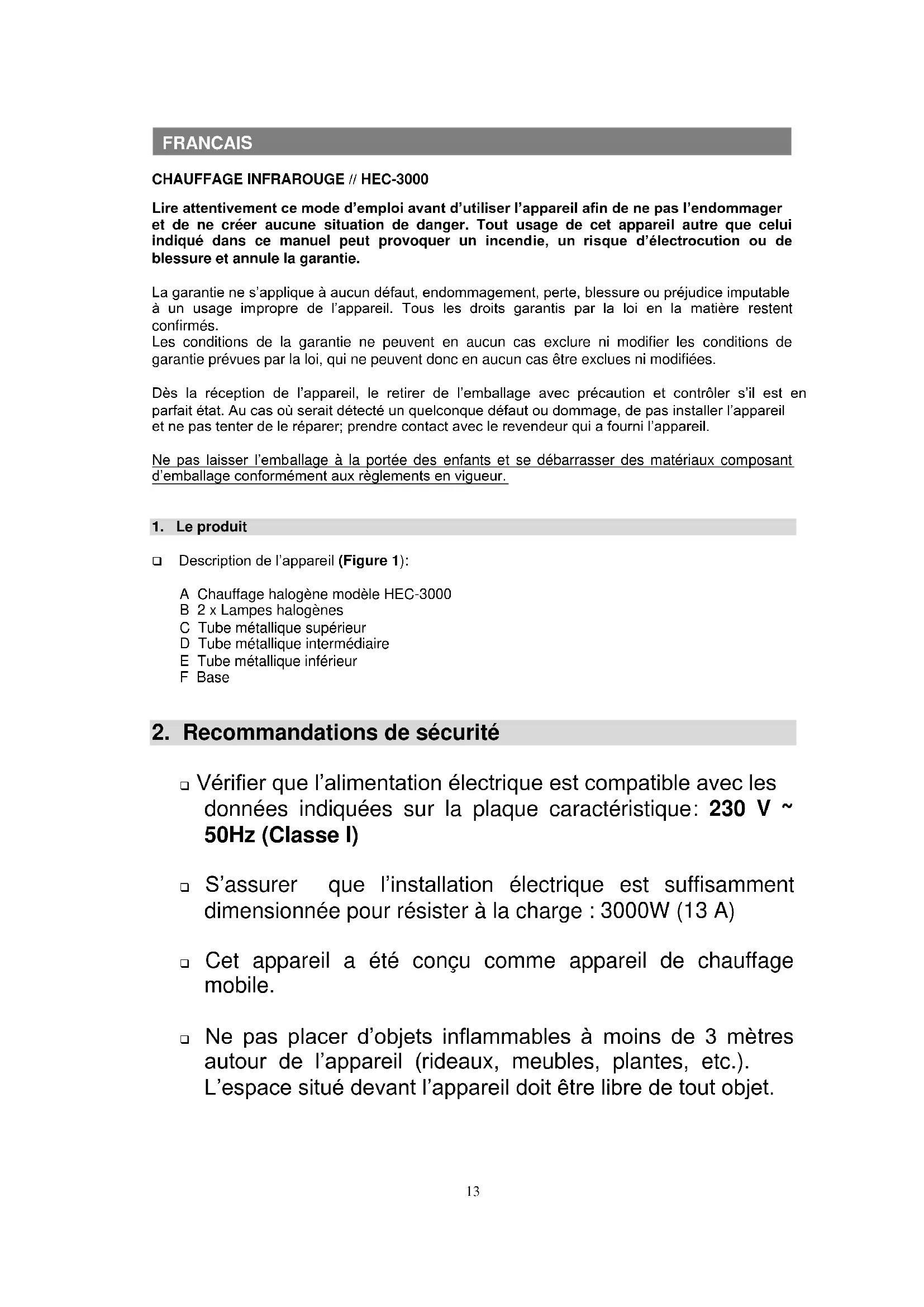 Vérifier que l’alimentation électrique est compatible avec les données indiquées sur la plaque caractéristique: 230 V ~ 50Hz (Classe I) S’assurer que l’installation électrique est suffisamment dimensionnée pour résister à la charge : 3000W (13 A) Cet appareil a été conçu comme appareil de chauffage mobile. Ne pas placer d’objets inflammables à moins de 3 mètres autour de l’appareil (rideaux, meubles, plantes, etc.). L’espace situé devant l’appareil doit être libre de tout objet. FRANÇAIS14 Ne pas placer l’appareil directement sous un auvent ou matériau inflammable L’appareil peut fonctionner à l’extérieur à condition qu’il soit à l’abri des intempéries. Ne pas utiliser cet appareil à proximité d’une douche, d’une baignoire ou une piscine. Ne pas installer l’appareil sous une prise électrique. Ne pas utiliser l’appareil dans des locaux contenant des gaz explosifs ou des vapeurs générées par des solvants ou de la peinture, ou inflammables. S’assurer que le sol est plat et assez ferme pour empêcher tout mouvement ou vibration qui nuisent à la vie des lampes. L’alimentation électrique de l’appareil doit prévoir un système de protection électrique qui doit être installés conformément aux normes en vigueur du pays. Ce système doit comprendre un interrupteur omnipolaire ayant une distance minimale d’ouverture entre tous les contacts, d’au moins 3 mm afin de permettre une complète déconnection en accord avec les conditions de surtension Catégorie III. Ne jamais laisser fonctionner l’appareil quand vous quittez votre maison. Si vous sortez de votre maison, s’assurer toujours que l’appareil est déconnecté du réseau. Ne pas déplacer l’appareil lorsqu’il est raccordé au réseau électrique. L’appareil atteint des températures superficielles élevées. Ne pas le toucher, même après l’avoir déconnecté du réseau. Ne pas couvrir l’appareil, même après l’avoir déconnecté du réseau.15 Ne jamais laisser les enfants ou les animaux domestiques toucher ou jouer avec l’appareil. Attention! Durant son fonctionnement la grille frontale peut atteindre des températures très élevées. Cet appareil peut être utilisé par des enfants âgés de 8 ans et plus, Cet appareil n’est pas prévu pour être utilisé par des personnes (y compris les enfants) dont les capacités physiques, sensorielles ou mentales sont réduites ou des personnes dénuées d’expérience ou de connaissance, sauf si elles ont pu bénéficier, par l’intermédiaire d’une personne responsable de leur sécurité, d’une surveillance ou d’instructions préalables concernant l’utilisation de l’appareil. Il convient de maintenir à distance les enfants de moins de 3 ans, à moins qu’ils ne soient sous surveillance continue. Les enfants âgés entre 3 ans et 8 ans doivent uniquement mettre l’appareil en marche ou à l’arrêt, à condition que ce dernier ait été placé ou installé dans une position normale prévue et que ces enfants disposent d’une surveillance ou aient reçu des instructions quant à l’utilisation de l’appareil en toute sécurité et en comprennent bien les dangers potentiels. Les enfants âgés entre 3 ans et 8 ans ne doivent ni brancher, ni régler, ni nettoyer l’appareil, ni réaliser l’entretien de l’utilisateur. ATTENTION - Certaines parties de ce produit peuvent devenir très chaudes et provoquer des brûlures. Il faut prêter une attention particulière en présence d’enfants et de personnes vulnérables. Ne pas nettoyer l’appareil s’il est en marche et ne jamais le plonger dans l’eau. Ne jamais toucher l'appareil avec les mains mouillées ou humides.16 Ne pas enrouler le câble d’alimentation autour ou au-dessus de l’appareil lorsqu’il est en marche. Éviter que le câble d’alimentation touche le corps de l’appareil pendant son fonctionnement. Si le câble d’alimentation est abimé, ne pas le remplacer soi- même. Il doit être remplacé par un professionnel qualifié afin d’éviter tout risque et dommage. Ne pas utiliser l’appareil pour sécher du linge ou des serviettes. Ne rien accrocher aux grilles de l’appareil. Une fois tous les composants assemblés et l’appareil situé à l’endroit d’utilisation, s’assurer que la partie chauffante est située à au moins 1,80 m au-dessous du sol. Cet appareil de chauffage ne dispose pas d’élément de contrôle de la température ambiante. A moins d’une surveillance permanente, cet appareil de chauffage ne doit pas être utilisé dans de petites pièces occupées par des personnes ne pouvant pas en sortir seules.