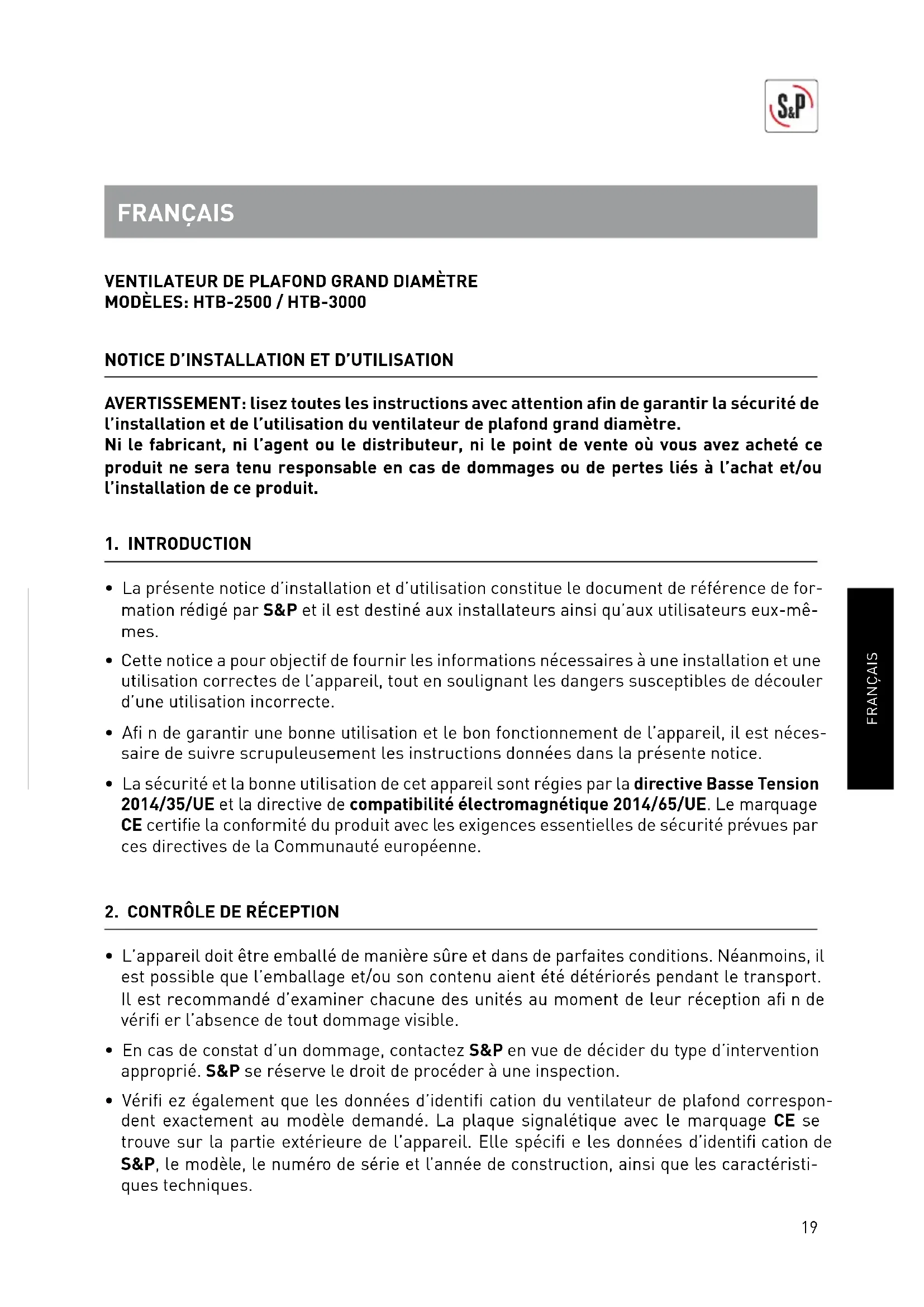 HTB2500 - Ventilateur Soler & Palau - Notice d'utilisation et mode d'emploi gratuit