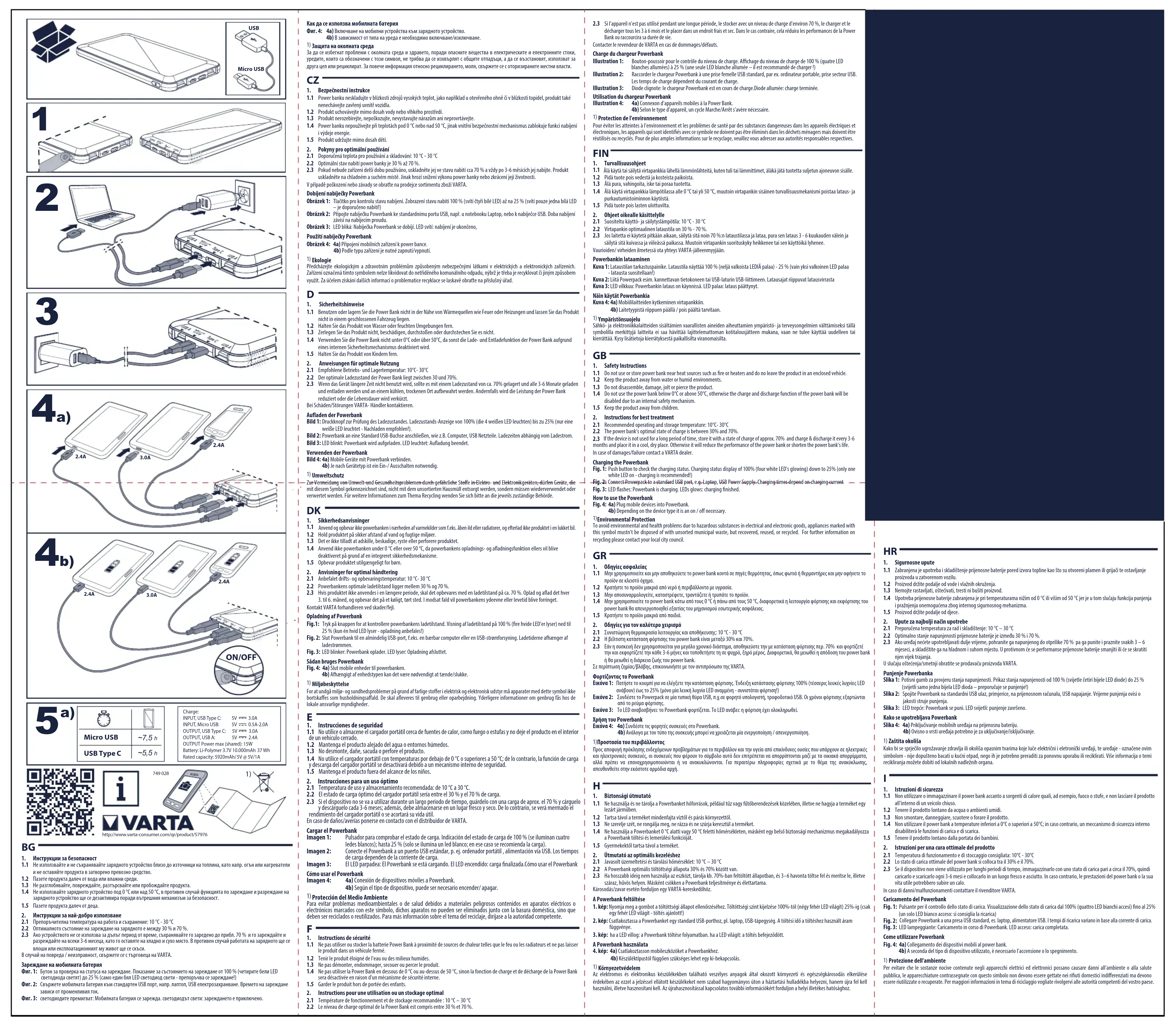 2.3 Si l'appareil n'est pas utilisé pendant une longue période, le stocker avec un niveau de charge d'environ 70 %, le charger et le décharger tous les 3 à 6 mois et le placer dans un endroit frais et sec. Dans le cas contraire, cela réduira les performances de la Power Bank ou raccourcira sa durée de vie. Contacter le revendeur de VARTA en cas de dommages/défauts. Charge du chargeur Powerbank Illustration 1: Bouton-poussoir pour le contrôle du niveau de charge. Achage du niveau de charge de 100 % (quatre LED blanches allumées) à 25 % (une seule LED blanche allumée – il est recommandé de charger !) Illustration 2: Raccorder le chargeur Powerbank à une prise femelle USB standard, par ex. ordinateur portable, prise secteur USB. Les temps de charge dépendent du courant de charge. Illustration 3: Diode clignote: le chargeur Powerbank est en cours de charge.Diode allumée: charge terminée. Utilisation du chargeur Powerbank Illustration 4: 4a) Connexon d'appareils mobiles à la Power Bank. 4b) Selon le type d'appareil, un cycle Marche/Arrêt s'avère nécessaire.