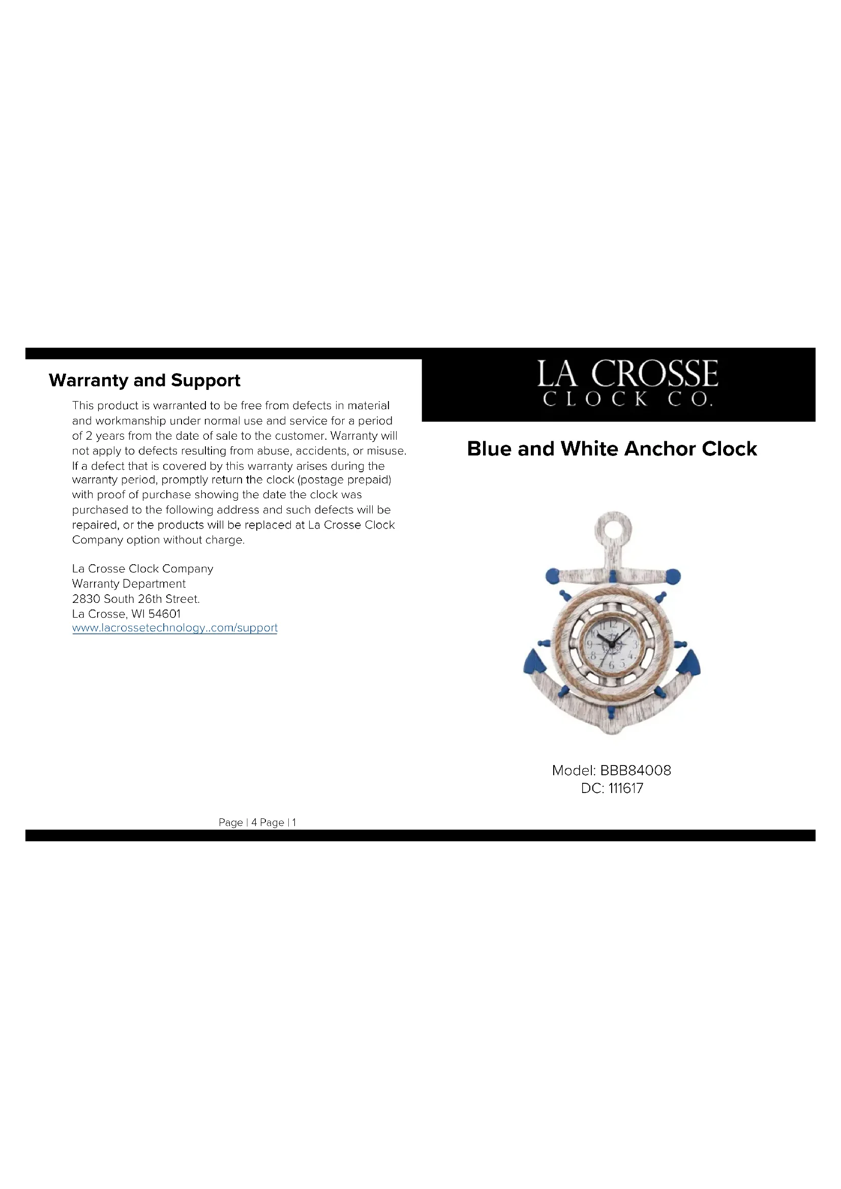 Page | 2 Page | 3Ce produit est garanti contre tout défaut de matériaux ou de fabrication dans des conditions d’utilisation normales et de service pendant une période de 2 ans à compter de la date de la vente au client. La garantie ne s’applique pas aux défauts résultant d’abus, d’accidents ou de mauvaise utilisation. Si un défaut couvert par cette garantie survient pendant la période de garantie, renvoyer aussitôt que possible l’horloge (aranchie) avec une preuve d’achat indiquant la date à laquelle l’horloge a été achetée à l’adresse suivante et ces défauts seront réparés ou le produit sera remplacé par La Crosse Clock Company sans frais. La Crosse Clock Company Département Garantie 2830 South 26th Street. La Crosse, WI 54601 www.lacrossetechnology..com/support Garantie limitée Horloge murale Modèle: BBB84008 DC: 111617 Page | 4 Page | 1 Fabriqué en Chine -- Imprimé en Chine• Acheter toujours la bonne taille et la meilleure qualité de pile adaptée à l’usage prévu.