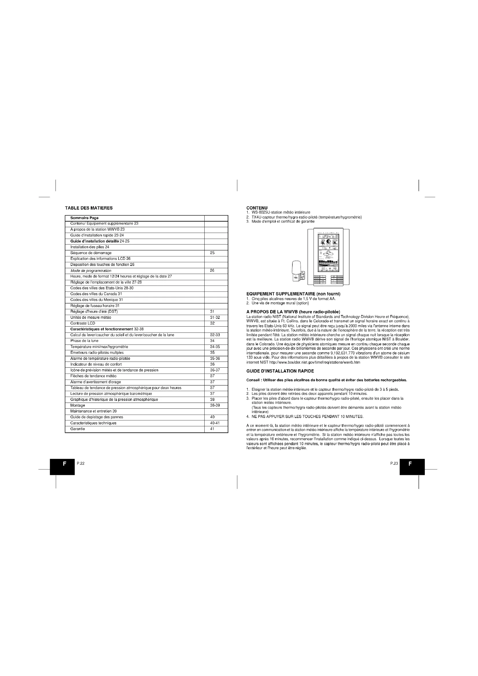 Sommaire Page Contenu/ Equipement supplémentaire 23 A propos de la station WWVB 23 Guide d'installation rapide 23-24 Guide d'installation détaillé 24-25 Installation des piles 24 Séquence de démarrage 25 Explication des informations LCD 26 Disposition des touches de fonction 26 Mode de programmation