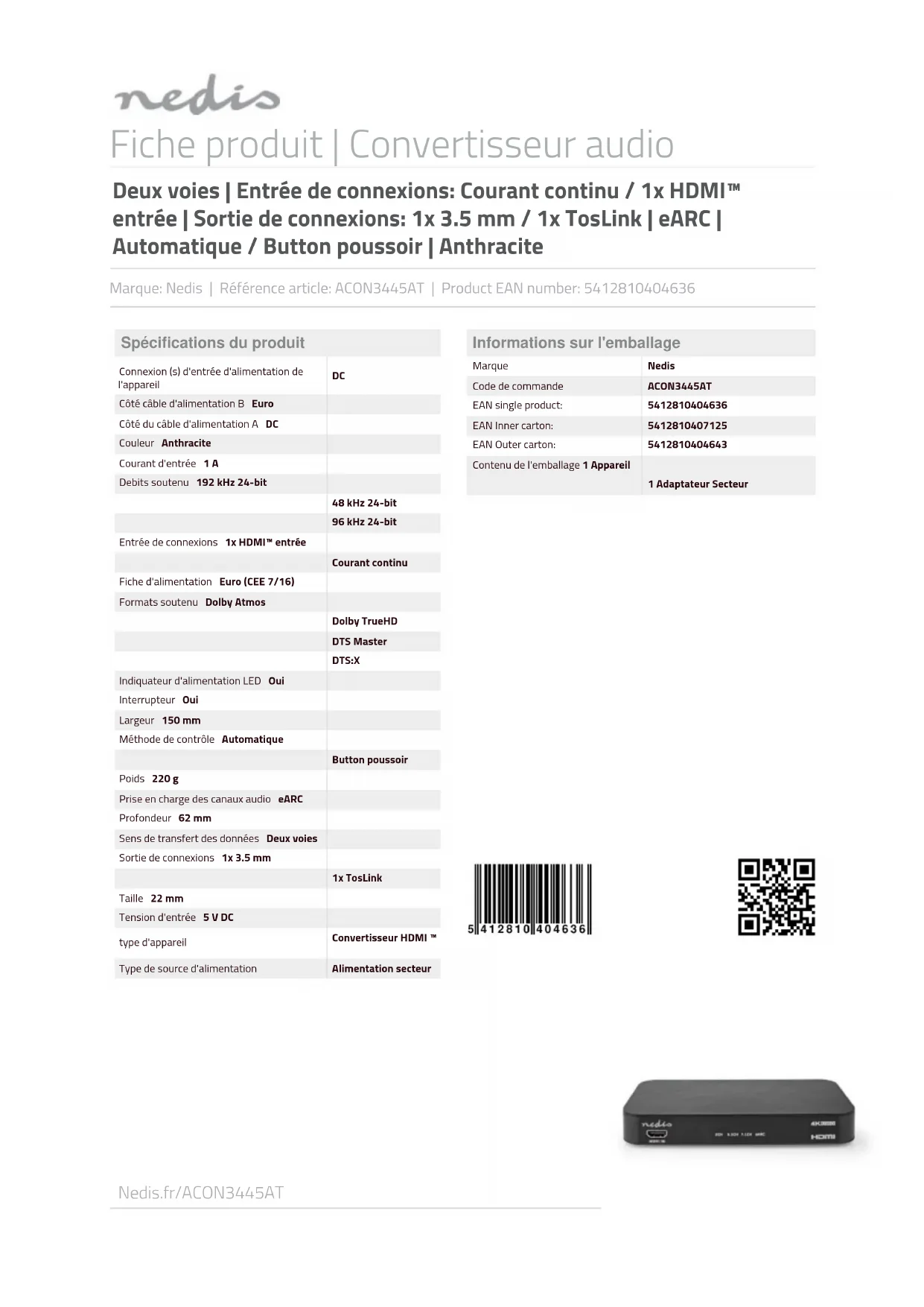 Nedis.fr/ACON3445AT Fiche produit | Convertisseur audio Deux voies | Entrée de connexions: Courant continu / 1x HDMI™ entrée | Sortie de connexions: 1x 3.5 mm / 1x TosLink | eARC | Automatique / Button poussoir | Anthracite Marque: Nedis | Référence article: ACON3445AT | Product EAN number: 5412810404636 Spécifications du produit Connexion (s) d'entrée d'alimentation de l'appareil