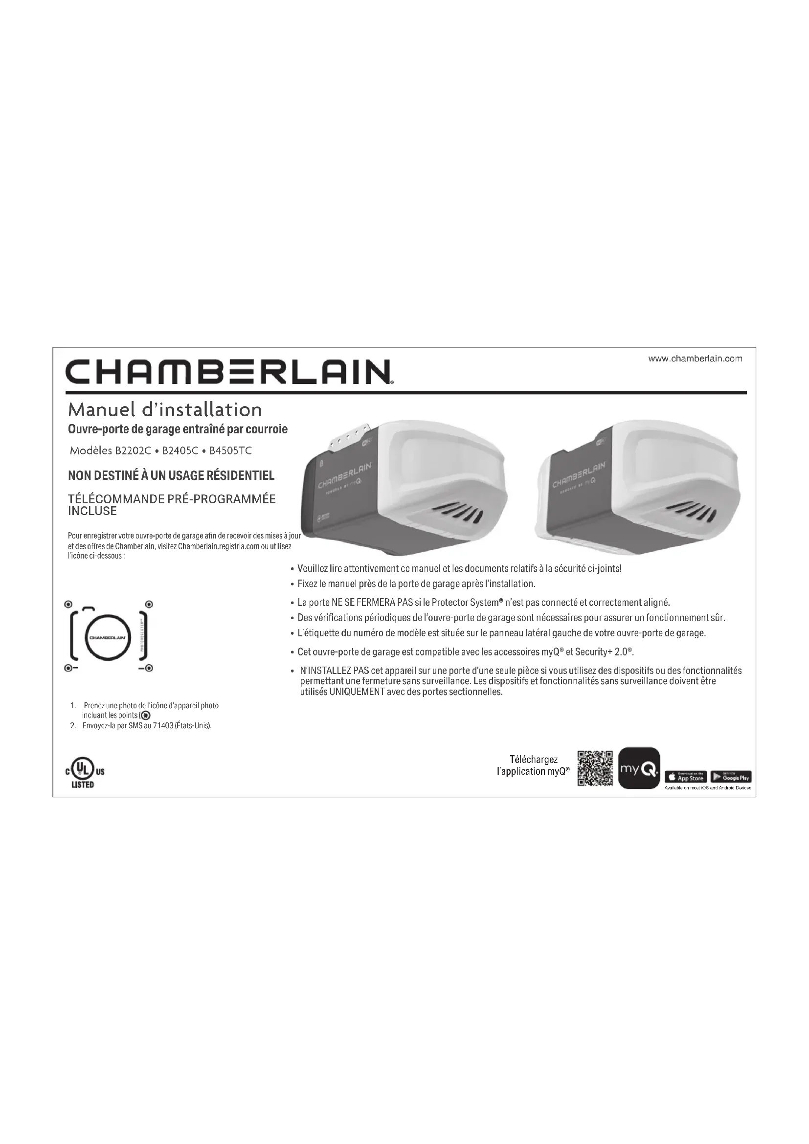 INCLUSE Pour enregistrer votre ouvre-porte de garage an de recevoir des mises à jour et des ores de Chamberlain, visitez Chamberlain.registria.com ou utilisez l’icône ci-dessous: