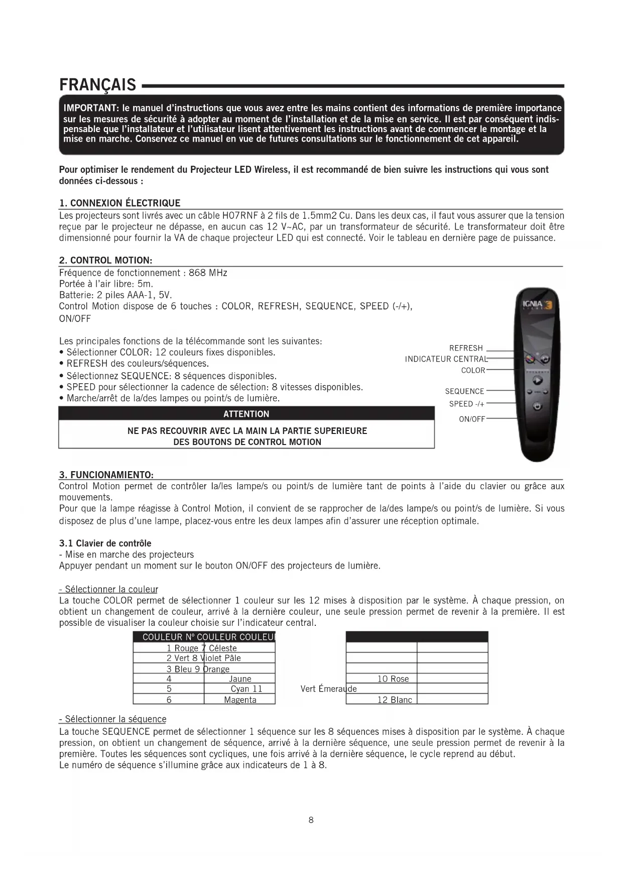 - SPEED pour sélectionner la cadence de sélection: 8 vitesses disponibles. Marche/arrêt de la/des lampes ou point/s de lumière.