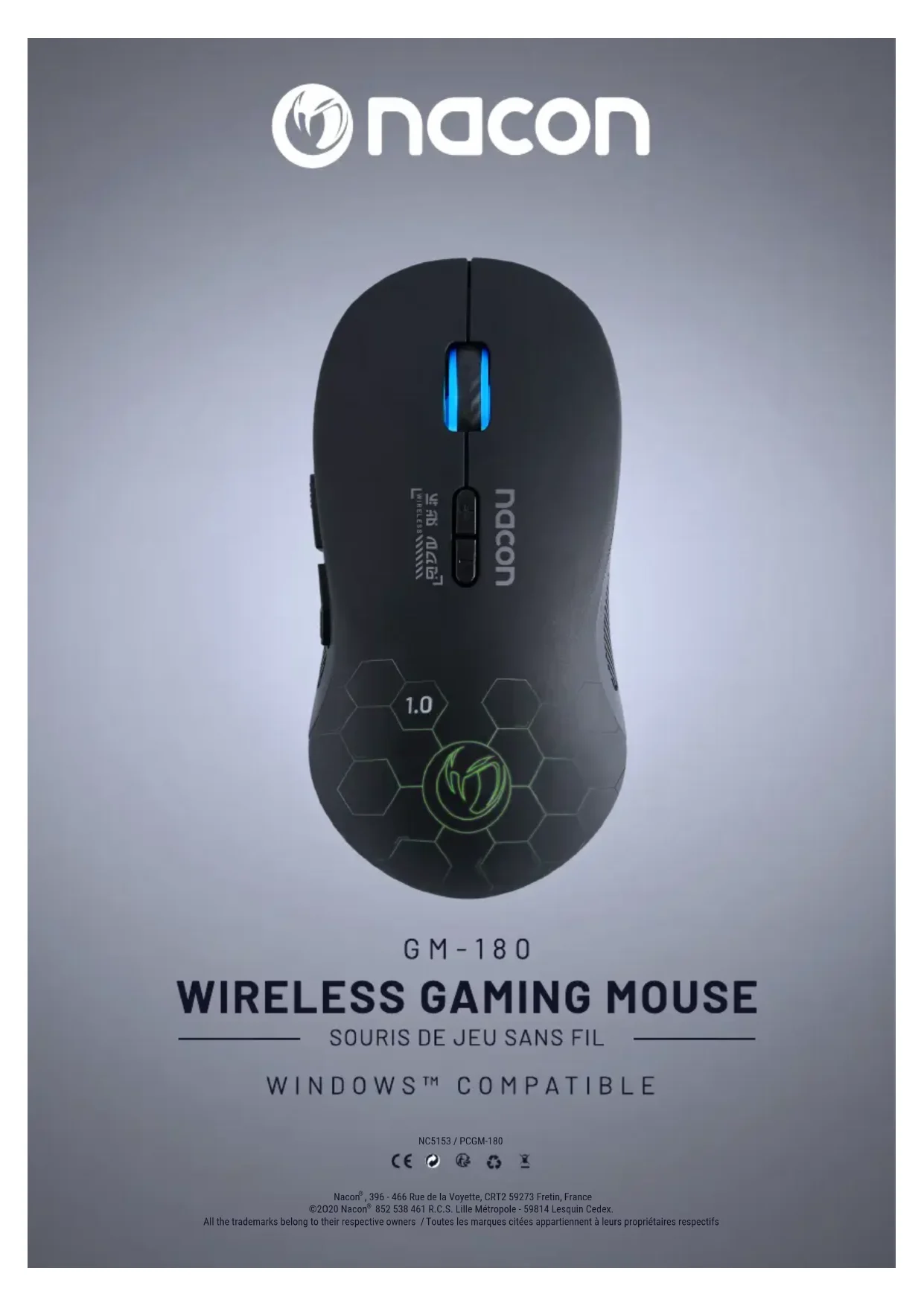 Merci d’avoir acheté ce produit NACON®. Ce produit a été conçu pour améliorer votre expérience de jeu. Veuillez conserver ce manuel d’utilisation en lieu sûr an de pouvoir vous y reporter en cas de besoin. I Garantie Ce produit portant la marque NACON® est garanti par le fabricant pendant une période de 2 ans à compter de la date d’achat. Au cours de cette période, en cas de vice de matériau ou de fabrication, ledit produit sera remplacé gratuitement par le même modèle ou un article similaire, et ce, à notre seule et entière discrétion. Pour toute réclamation ou demande relative à la garantie, veuillez conserver votre preuve d’achat en lieu sûr pendant toute la durée de la garantie. Sans ce document, nous ne serons pas en mesure de traiter votre demande. Pour tout achat à distance (vente par correspondance et par Internet), veuillez conserver l’emballage d’origine. Cette garantie ne couvre pas les défauts survenant à la suite de dommages accidentels, d’un usage abusif ou d’une usure normale. Ces dispositions ne modient en rien vos droits statutaires. Pour accéder à la déclaration de conformité, veuillez-vous rendre sur : https://www.nacongaming.com I Caractéristiques du produit Périphérique USB Plug'n'Play compatible avec Windows 7/8/10 Capteur optique avec une résolution max de 2200 DPI 6 boutons dont 2 latéraux Grips latéraux Rétroéclairage RVB I Contenu de l'emballage 1 Souris optique NACON GM-180 1 Récepteur USB 1 Câble USB A vers micro USB, noir, 70cm 1 Batterie rechargeable AA 3.7V 500mAh 1 Quick IBFR / I Éléments de contrôle