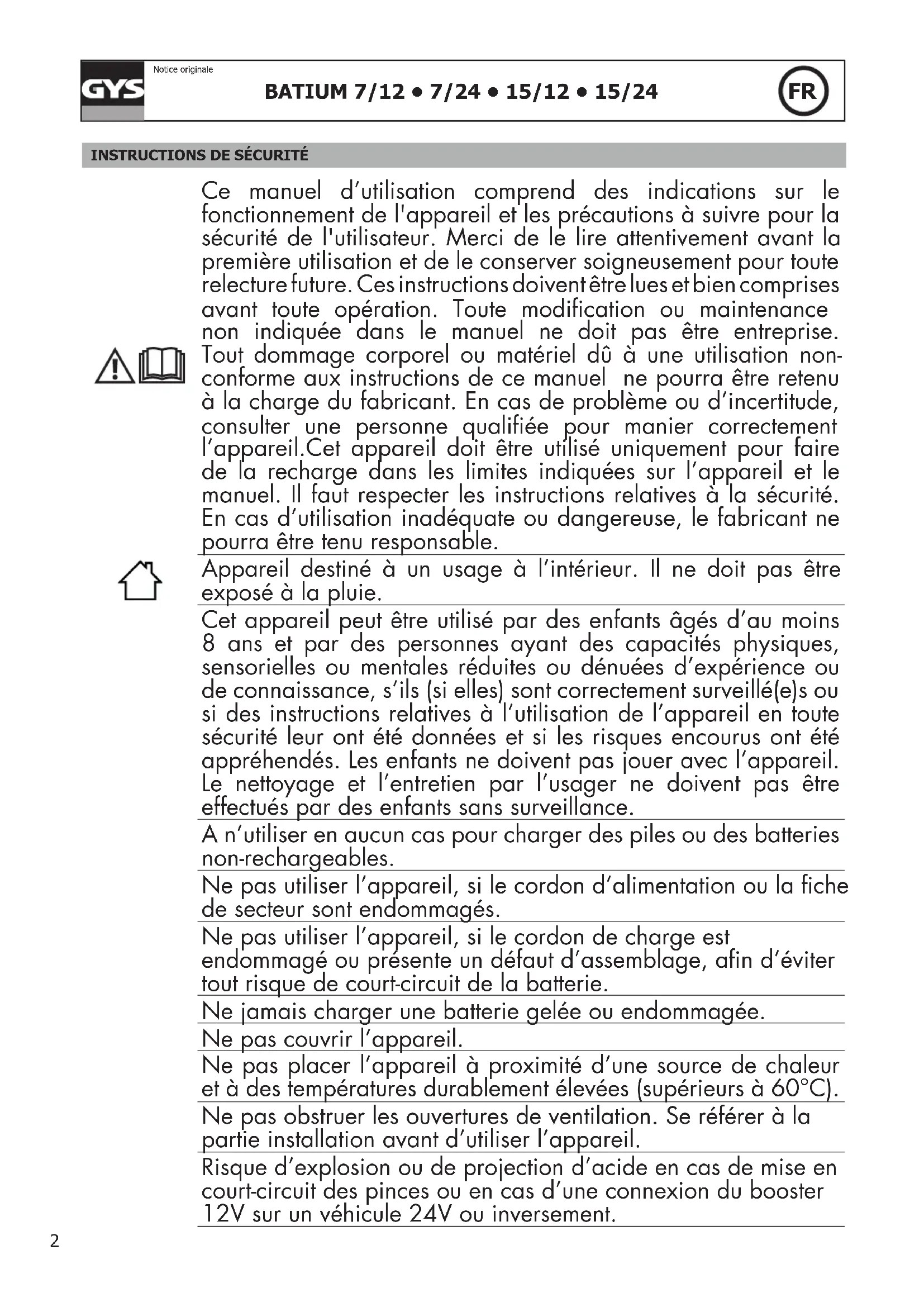 Ce manuel d’utilisation comprend des indications sur le fonctionnement de l'appareil et les précautions à suivre pour la sécurité de l'utilisateur. Merci de le lire attentivement avant la première utilisation et de le conserver soigneusement pour toute relecture future. Ces instructions doivent être lues et bien comprises avant toute opération. Toute modication ou maintenance non indiquée dans le manuel ne doit pas être entreprise. Tout dommage corporel ou matériel dû à une utilisation non- conforme aux instructions de ce manuel ne pourra être retenu à la charge du fabricant. En cas de problème ou d’incertitude, consulter une personne qualiée pour manier correctement l’appareil.Cet appareil doit être utilisé uniquement pour faire de la recharge dans les limites indiquées sur l’appareil et le manuel. Il faut respecter les instructions relatives à la sécurité. En cas d’utilisation inadéquate ou dangereuse, le fabricant ne pourra être tenu responsable. Appareil destiné à un usage à l’intérieur. Il ne doit pas être exposé à la pluie. Cet appareil peut être utilisé par des enfants âgés d’au moins 8 ans et par des personnes ayant des capacités physiques, sensorielles ou mentales réduites ou dénuées d’expérience ou de connaissance, s’ils (si elles) sont correctement surveillé(e)s ou si des instructions relatives à l’utilisation de l’appareil en toute sécurité leur ont été données et si les risques encourus ont été appréhendés. Les enfants ne doivent pas jouer avec l’appareil. Le nettoyage et l’entretien par l’usager ne doivent pas être effectués par des enfants sans surveillance. A n’utiliser en aucun cas pour charger des piles ou des batteries non-rechargeables. Ne pas utiliser l’appareil, si le cordon d’alimentation ou la che de secteur sont endommagés. Ne pas utiliser l’appareil, si le cordon de charge est endommagé ou présente un défaut d’assemblage, an d’éviter tout risque de court-circuit de la batterie. Ne jamais charger une batterie gelée ou endommagée. Ne pas couvrir l’appareil. Ne pas placer l’appareil à proximité d’une source de chaleur et à des températures durablement élevées (supérieurs à 60°C). Ne pas obstruer les ouvertures de ventilation. Se référer à la partie installation avant d’utiliser l’appareil. Risque d’explosion ou de projection d’acide en cas de mise en court-circuit des pinces ou en cas d’une connexion du booster 12V sur un véhicule 24V ou inversement.BATIUM 7/12 • 7/24 • 15/12 • 15/24