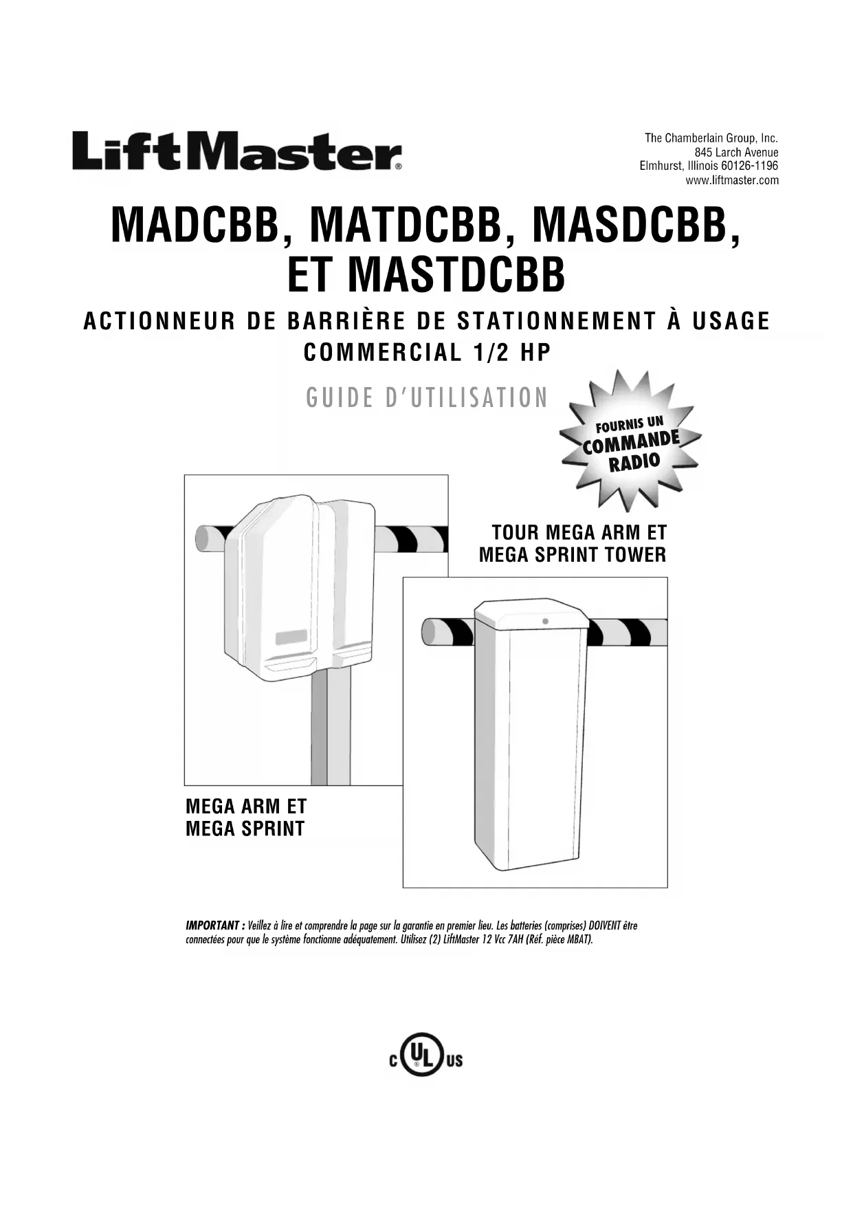Passport ™ pouvant satisfaire à toutes vos exigences. Bouton simple à quatre boutons, sur visière ou sur porte-clés. En outre, les télécommandes Passport™ s’intègrent parfaitement aux systèmes d’accès par téléphone et de contrôle d’accès. Adressez-vous à un détaillant LiftMaster agréé pour plus de détails. DIVERS© 2011, The Chamberlain Group, Inc. 01-60162HFR Tous droits réservés (VOUS DEVEZ LIRE, COMPRENDRE ET ACCEPTER TOUS LES TERMES DE LA GARANTIE LIMITÉE) LiftMaster garantit que le MEGA ARM - UL sera exempt de toute défectuosité au niveau de la main d’oeuvre et des matériaux pour une période de 2 ans en ce qui a trait aux composants électroniques et mécaniques et comprend une garantie de 10 ans contre les perforations de l’enveloppe et du châssis. La garantie débutera à partir de la date d’achat. LiftMaster se réserve le droit de déterminer l’existence et les causes d’une défectuosité ou d’une défaillance. Toutes les pièces trouvées défectueuses et retournées à LiftMaster durant la période de garantie seront, à notre choix, réparées ou remplacées sans frais en usine. Le transport n’est pas compris pour les bras de barrière et châssis. SEULEMENT un transport par UPS est inclus durant la première année de garantie. La garantie ne s’appliquera pas aux circonstances suivantes qui sont considérées comme hors de notre contrôle. Mauvaise utilisation, vandalisme, accident, négligence, réparations ou modifications non autorisées, actes de Dieu (foudre, inondations, dommages dus aux insectes, etc.) surtensions, appareils laissés dans un environnement corrosif, installation ou application incorrecte, batteries ou installation des batteries incorrecte, fonctionnement n’utilisant pas le type de batterie approprié, dommage au support de bras et/ou au réducteur d’embrayage à cause de l’utilisation d’un bras incorrect. La garantie décrite dans les présentes est entièrement exclusive et il n’existe aucune autre garantie, qu’elle soit écrite ou orale, expresse ou implicite. LiftMaster désavoue spécifiquement toute garantie implicite, garantie de mise en marché ou d’adaptation à des fins particulières. Il est de la responsabilité exclusive de l’acheteur de déterminer si l’équipement est approprié ou non à des fins particulières. En aucun cas LiftMaster inc. ne peut être tenue responsable de tout dommage direct, indirect, accessoire, spécial, consécutif ou à toute perte de profit qu’ils soient basés sur un contrat, un tort ou toute autre théorie légale dans le cadre de la garantie ou en tout temps par la suite. L’installateur et/ou l’utilisateur final acceptent d’assumer l’entière responsabilité de toute disposition d’utilisation de ce produit, libérant LiftMaster de toute responsabilité. AVERTISSEMENT! MEGA ARM N’EST PAS DESTINÉ À UNE UTILISATION AVEC DES BICYCLETTES OU DES PIÉTONS. VOUS DEVEZ INSTALLER UNE SIGNALISATION APPROPRIÉE AVANT D’ACTIVER L’APPAREIL. NE LAISSEZ JAMAIS LES ENFANTS JOUER À CÔTÉ OU FAIRE FONCTIONNER LES BARRIÈRES AUTOMATIQUES. POUR POUVOIR INSTALLER ET UTILISER LE MEGA ARM, VOUS DEVEZ COMPRENDRE ET ACCEPTER CETTE ENTENTE AVEC TOUTES LES DISPOSITIONS QU’ELLE DÉCRIT. SI VOUS N’ÊTES PAS ENTIÈREMENT D’ACCORD, NE METTEZ PAS EN SERVICE L’APPAREIL. SI L’ACTIONNEUR EST MIS EN MARCHE, CE SERA UNE CONFIRMATION QUE VOUS ÊTES ENTIÈREMENT D’ACCORD AVEC TOUTES LES DISPOSITIONS CI-DESSUS. Les matériaux, composants, fonctions et spécifications sont sujets à modification sans préavis.
