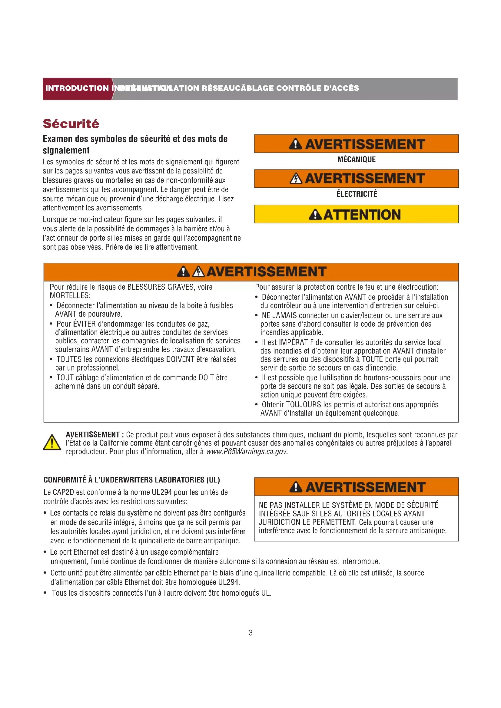 - Obtenir TOUJOURS les permis et autorisations appropriés AVANT d’installer un équipement quelconque. Sécurité Examen des symboles de sécurité et des mots de signalement Les symboles de sécurité et les mots de signalement qui figurent sur les pages suivantes vous avertissent de la possibilité de blessures graves ou mortelles en cas de non-conformité aux avertissements qui les accompagnent. Le danger peut être de source mécanique ou provenir d’une décharge électrique. Lisez attentivement les avertissements. Lorsque ce mot-indicateur figure sur les pages suivantes, il vous alerte de la possibilité de dommages à la barrière et/ou à l’actionneur de porte si les mises en garde qui l’accompagnent ne sont pas observées. Prière de les lire attentivement. MÉCANIQUE ÉLECTRICITÉ PRÉ-INSTALLATION RÉSEAUCÂBLAGE CONTRÔLE D’ACCÈS INTRODUCTION INSTALLATION INTRODUCTION PRÉ-INSTALLATION RÉSEAUCÂBLAGE CONTRÔLE D’ACCÈS INSTALLATION INTRODUCTION PRÉ-INSTALLATION RÉSEAUCÂBLAGE CONTRÔLE D’ACCÈS INSTALLATION INTRODUCTION PRÉ-INSTALLATION RÉSEAUCÂBLAGE CONTRÔLE D’ACCÈS INSTALLATION INTRODUCTION PRÉ-INSTALLATION RÉSEAUCÂBLAGE CONTRÔLE D’ACCÈS INSTALLATION INTRODUCTION PRÉ-INSTALLATION RÉSEAUCÂBLAGE CONTRÔLE D’ACCÈS INSTALLATION CONFORMITÉ À L’UNDERWRITERS LABORATORIES (UL) Le CAP2D est conforme à la norme UL294 pour les unités de contrôle d’accès avec les restrictions suivantes: