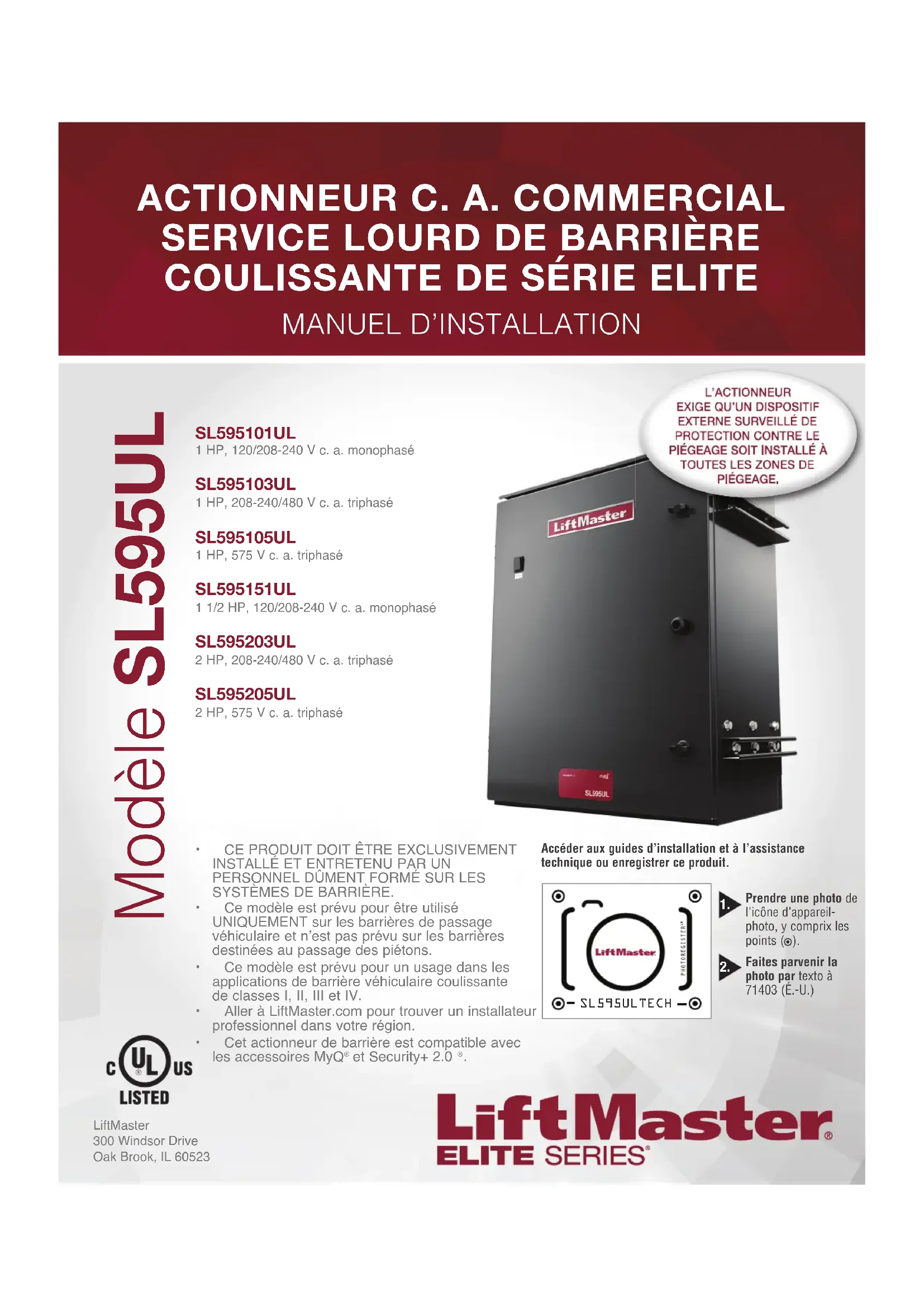 LiftMaster300 Windsor DriveOak Brook, IL 60523• CE PRODUIT DOIT ÊTRE EXCLUSIVEMENT INSTALLÉ ET ENTRETENU PAR UN PERSONNEL DÛMENT FORMÉ SUR LES SYSTÈMES DE BARRIÈRE. • Ce modèle est prévu pour être utilisé UNIQUEMENT sur les barrières de passage véhiculaire et n’est pas prévu sur les barrières destinées au passage des piétons. • Ce modèle est prévu pour un usage dans les applications de barrière véhiculaire coulissante de classes I, II, III et IV.• Aller à LiftMaster.com pour trouver un installateur professionnel dans votre région.• Cet actionneur de barrière est compatible avec les accessoires MyQ et Security+ 2.0