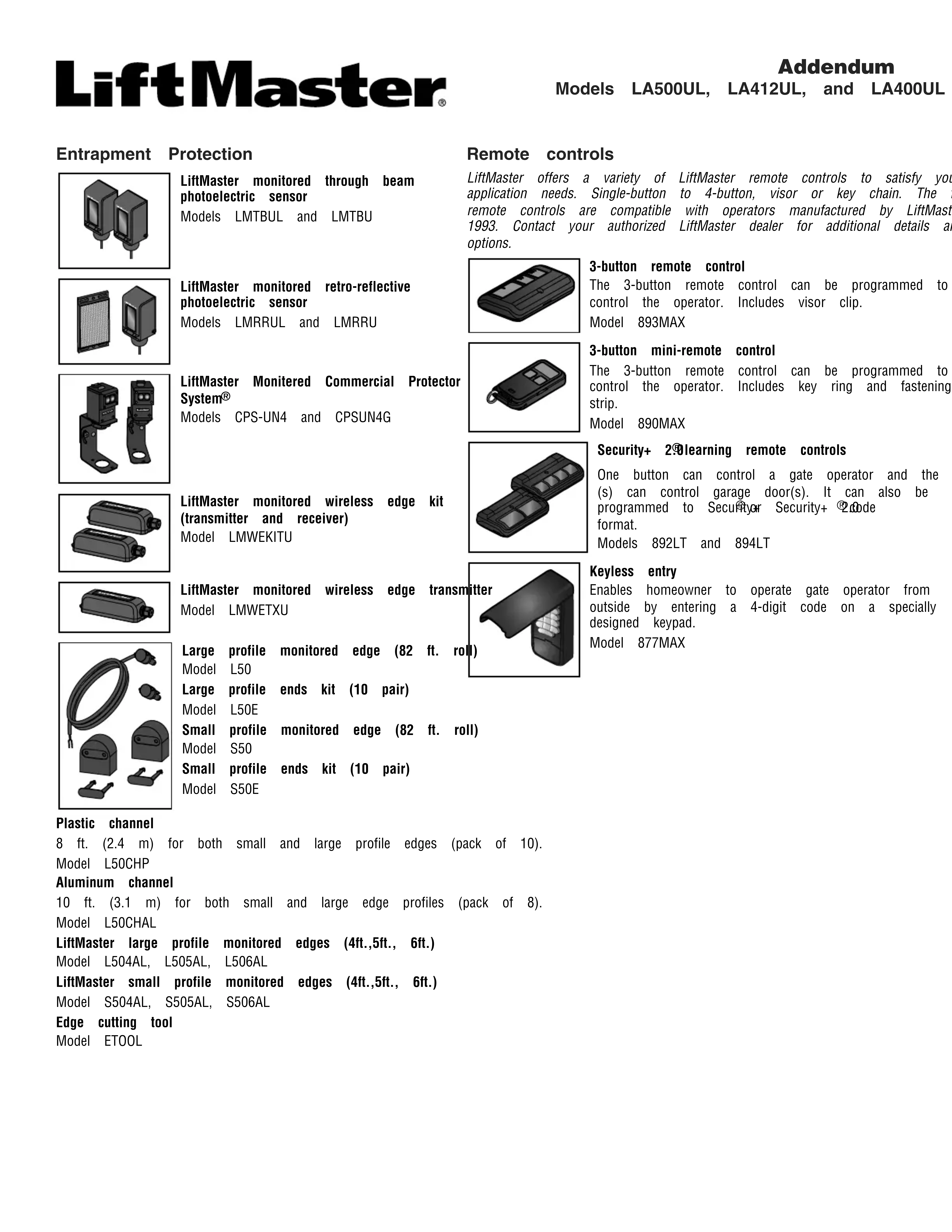code format. Models 892LT and 894LT Keyless entry Enables homeowner to operate gate operator from outside by entering a 4-digit code on a specially designed keypad. Model 877MAXAddendum Modèles LA500UL, LA412UL, et LA400UL Protection contre le piégeage Surveillé LiftMaster par capteur à faisceau photoélectrique Modèles LMTBUL et LMTBU Capteur rétroréfléchissant à cellule photoélectrique surveillé Modèles LMRRUL et LMRRU Protector System surveillé commercial LiftMaster