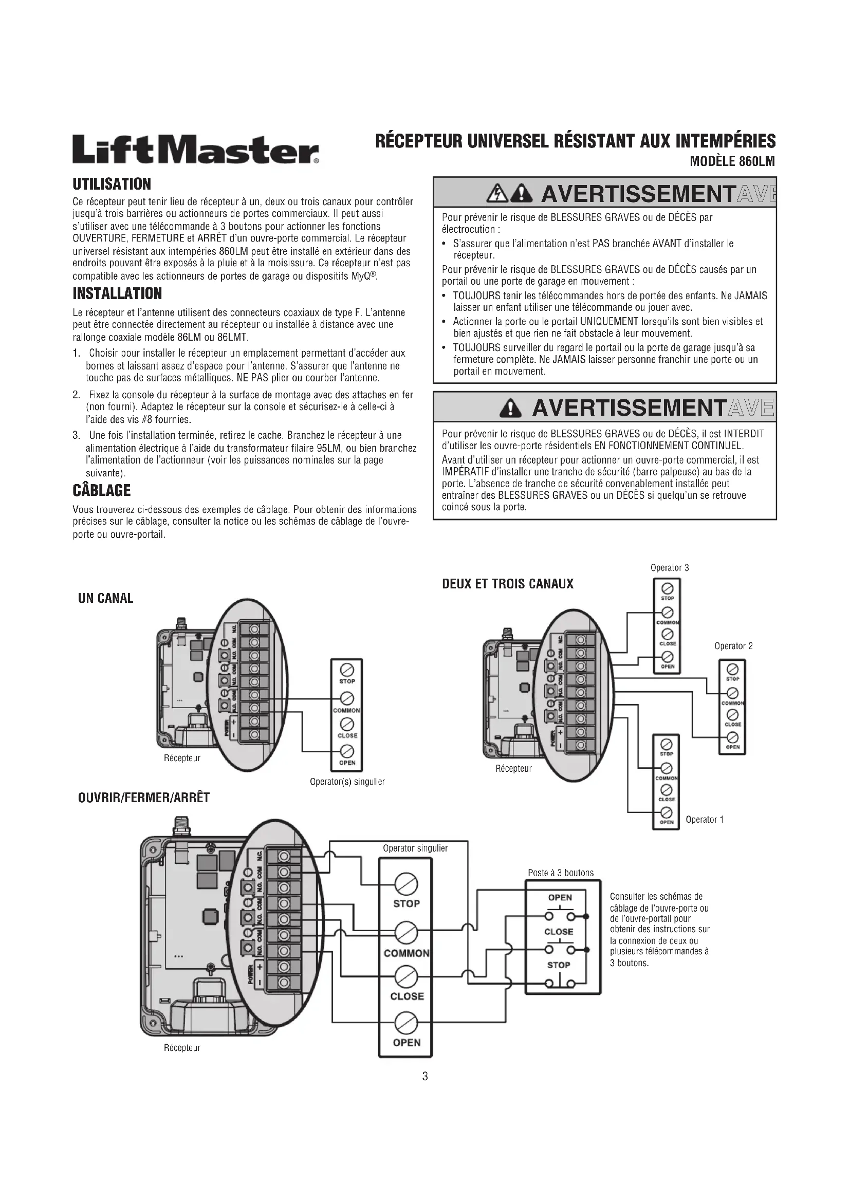 UTILISATION Ce récepteur peut tenir lieu de récepteur à un, deux ou trois canaux pour contrôler jusqu’à trois barrières ou actionneurs de portes commerciaux. Il peut aussi s’utiliser avec une télécommande à 3 boutons pour actionner les fonctions OUVERTURE, FERMETURE et ARRÊT d’un ouvre-porte commercial. Le récepteur universel résistant aux intempéries 860LM peut être installé en extérieur dans des endroits pouvant être exposés à la pluie et à la moisissure. Ce récepteur n’est pas compatible avec les actionneurs de portes de garage ou dispositifs MyQ