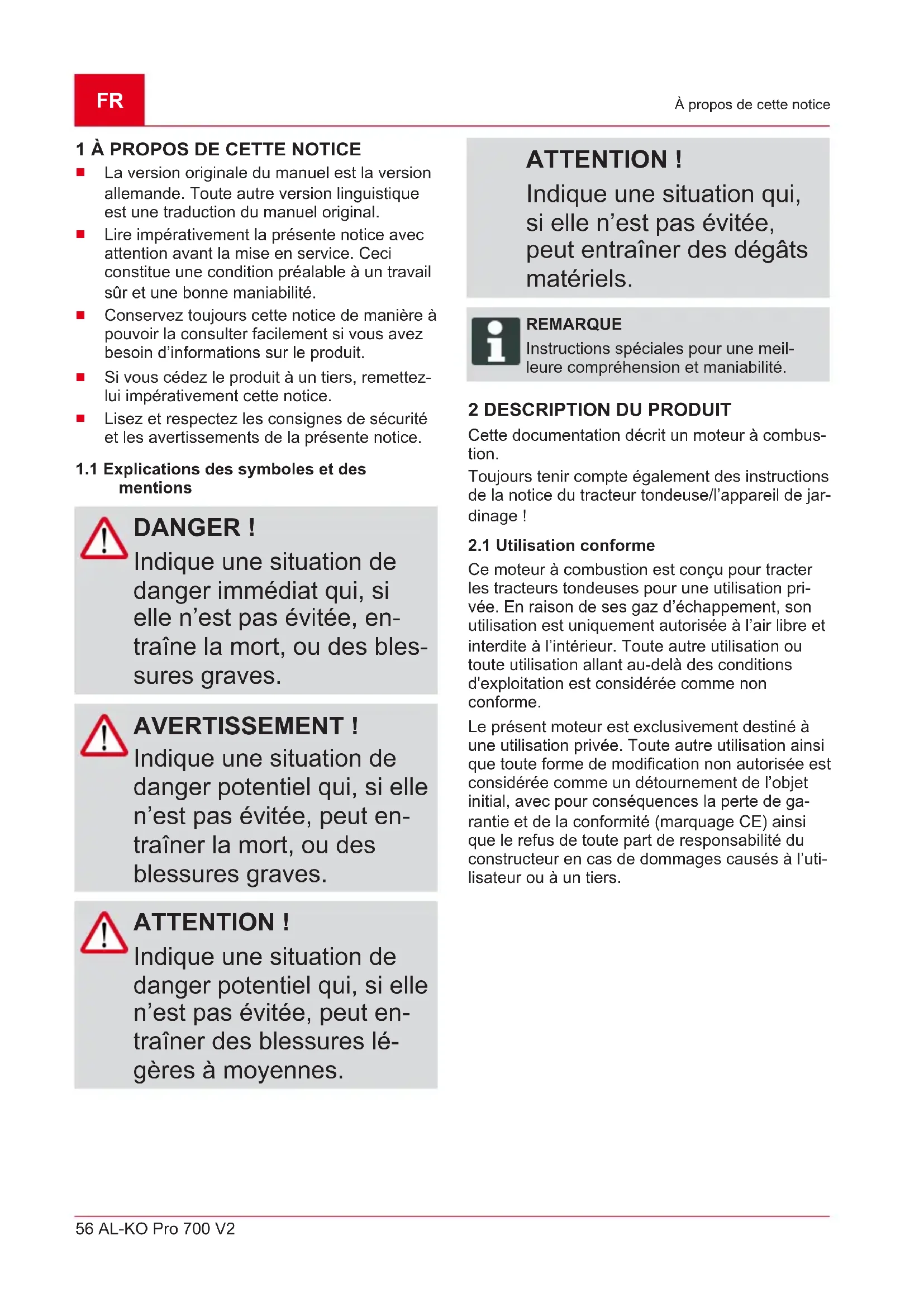 Conservez tous les do- cuments fournis en vue d’une utilisation ulté- rieure.FR 58 AL-KO Pro 700 V2 Consignes de sécurité DANGER! Danger de mort par in- toxication Les fumées dégagées par le moteur contiennent du monoxyde de carbone qui peut entraîner la mort d’une personne en quelques minutes seule- ment.