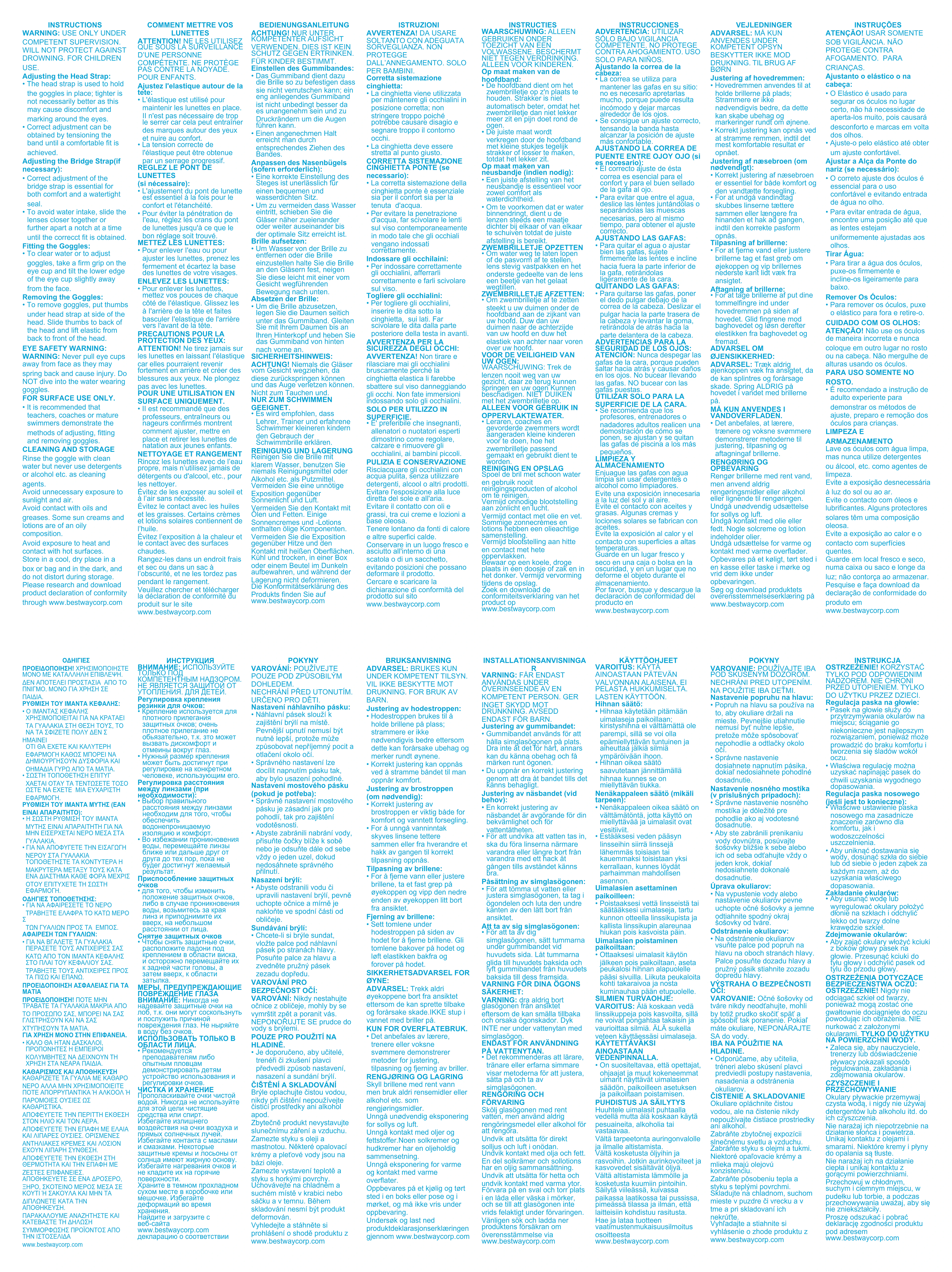 PROTECTION DES YEUX: ATTENTION! Ne tirez jamais sur les lunettes en laissant I'élastique car elles pourraient revenir fortement en arrière et créer des blessures aux yeux. Ne plongez pas avec les lunettes.