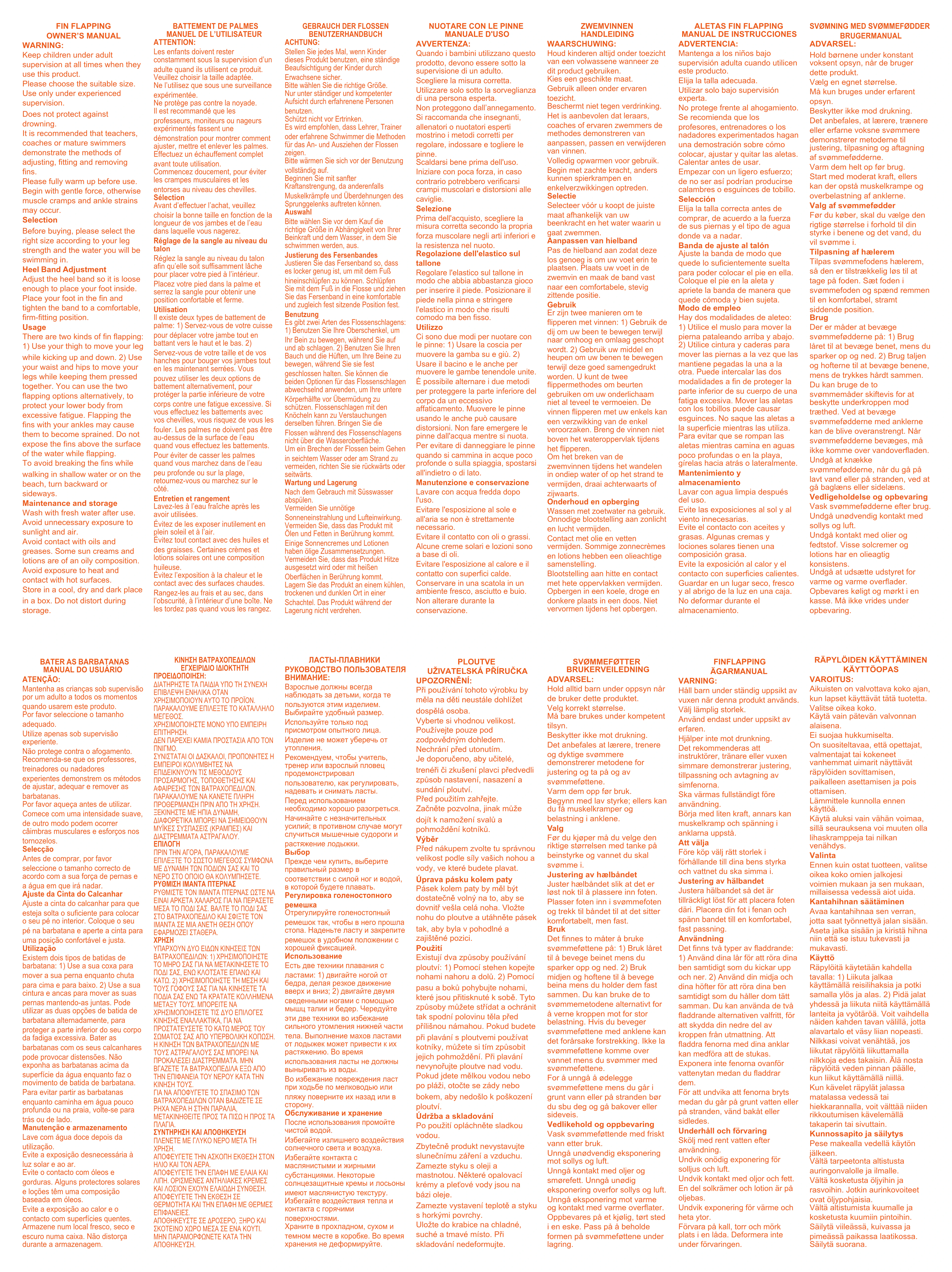 ATTENTION: Les enfants doivent rester constamment sous la supervision d’un adulte quand ils utilisent ce produit. Veuillez choisir la taille adaptée. Ne l’utilisez que sous une surveillance expérimentée. Ne protège pas contre la noyade. Il est recommandé que les professeurs, moniteurs ou nageurs expérimentés fassent une démonstration pour montrer comment ajuster, mettre et enlever les palmes. Effectuez un échauffement complet avant toute utilisation. Commencez doucement, pour éviter les crampes musculaires et les entorses au niveau des chevilles. Sélection Avant d’effectuer l’achat, veuillez choisir la bonne taille en fonction de la longueur de vos jambes et de l’eau dans laquelle vous nagerez. Réglage de la sangle au niveau du talon Réglez la sangle au niveau du talon afin qu’elle soit suffisamment lâche pour placer votre pied à l’intérieur. Placez votre pied dans la palme et serrez la sangle pour obtenir une position confortable et ferme. Utilisation Il existe deux types de battement de palme: 1) Servez-vous de votre cuisse pour déplacer votre jambe tout en battant vers le haut et le bas. 2) Servez-vous de votre taille et de vos hanches pour bouger vos jambes tout en les maintenant serrées. Vous pouvez utiliser les deux options de battement alternativement, pour protéger la partie inférieure de votre corps contre une fatigue excessive. Si vous effectuez les battements avec vos chevilles, vous risquez de vous les fouler. Les palmes ne doivent pas être au-dessus de la surface de l’eau quand vous effectuez les battements. Pour éviter de casser les palmes quand vous marchez dans de l’eau peu profonde ou sur la plage, retournez-vous ou marchez sur le côté. Entretien et rangement Lavez-les à l’eau fraîche après les avoir utilisées. Évitez de les exposer inutilement en plein soleil et à l’air. Évitez tout contact avec des huiles et des graisses. Certaines crèmes et lotions solaires ont une composition huileuse. Évitez l’exposition à la chaleur et le contact avec des surfaces chaudes. Rangez-les au frais et au sec, dans l’obscurité, à l’intérieur d’une boîte. Ne les tordez pas quand vous les rangez.