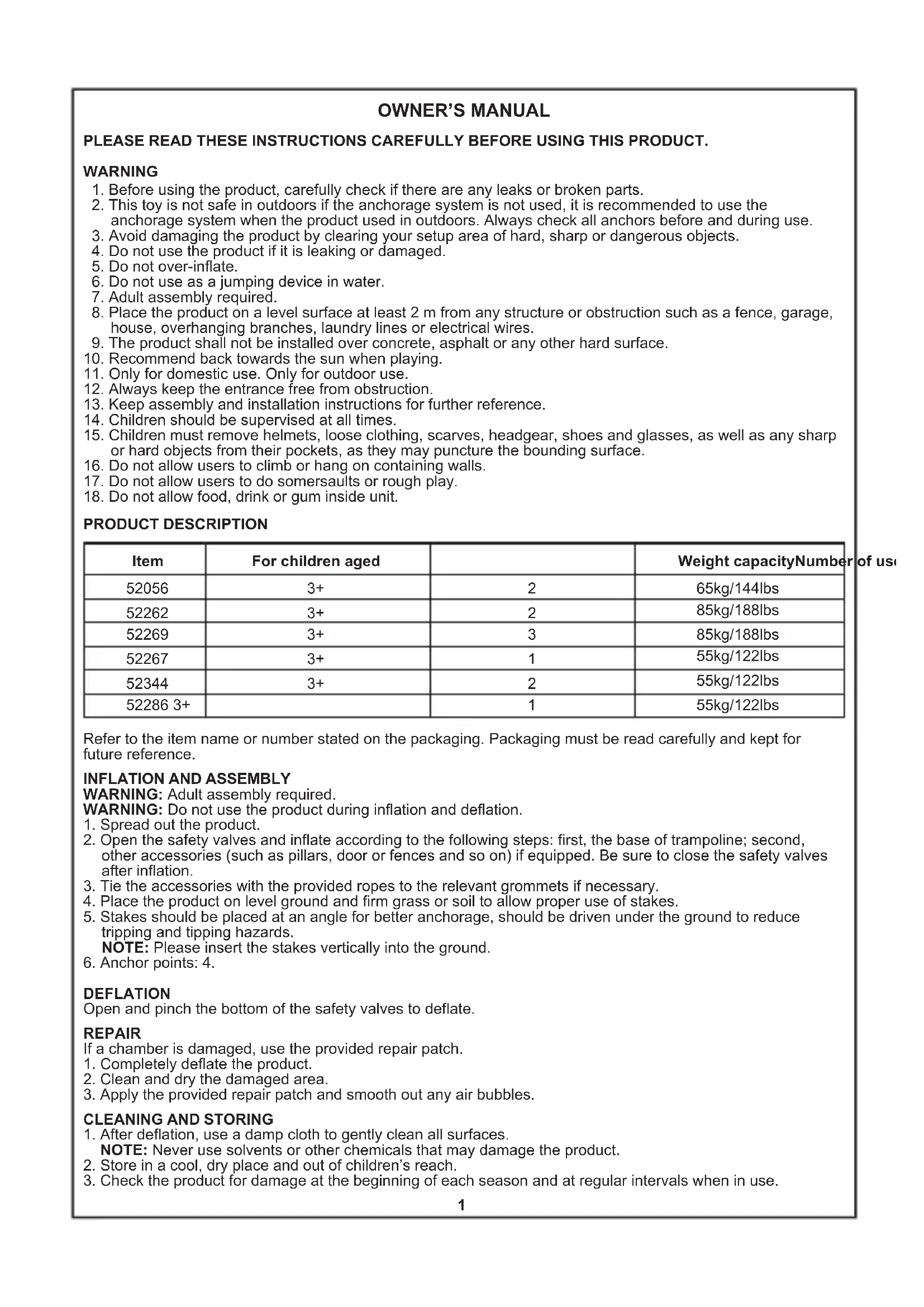 ATTENTION : Le montage doit être effectué par un adulte. ATTENTION : n’utilisez pas le produit durant le gonflage et le dégonflage.