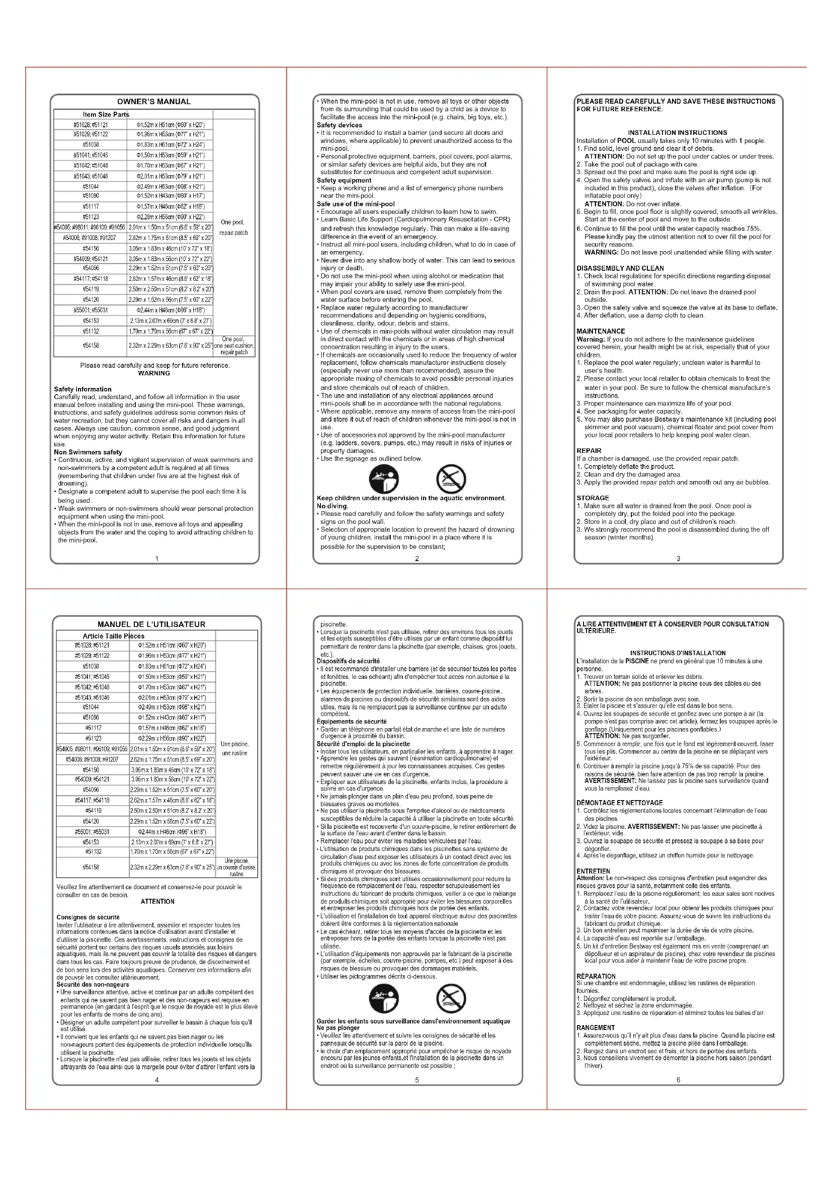 Veuillez lire attentivement ce document et conservez-le pour pouvoir le consulter en cas de besoin. ATTENTION Consignes de sécurité Inviter l'utilisateur à lire attentivement, assimiler et respecter toutes les informations contenues dans la notice d'utilisation avant d'installer et d'utiliser la piscinette. Ces avertissements, instructions et consignes de sécurité portent sur certains des risques usuels associés aux loisirs aquatiques, mais ils ne peuvent pas couvrir la totalité des risques et dangers dans tous les cas. Faire toujours preuve de prudence, de discernement et de bon sens lors des activités aquatiques. Conserver ces informations afin de pouvoir les consulter ultérieurement. Sécurité des non-nageurs