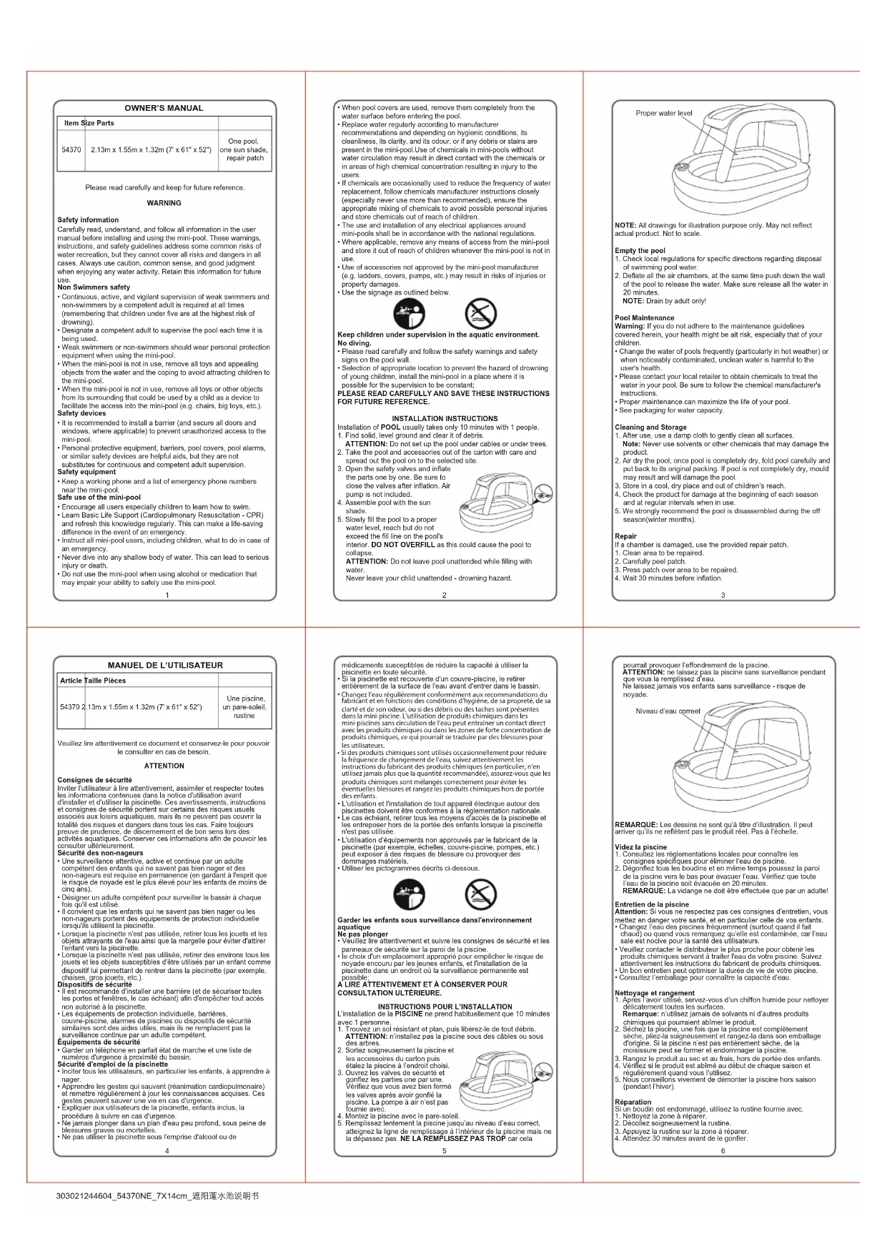 Veuillez lire attentivement ce document et conservez-le pour pouvoir le consulter en cas de besoin. ATTENTION Consignes de sécurité Inviter l'utilisateur à lire attentivement, assimiler et respecter toutes les informations contenues dans la notice d'utilisation avant d'installer et d'utiliser la piscinette. Ces avertissements, instructions et consignes de sécurité portent sur certains des risques usuels associés aux loisirs aquatiques, mais ils ne peuvent pas couvrir la totalité des risques et dangers dans tous les cas. Faire toujours preuve de prudence, de discernement et de bon sens lors des activités aquatiques. Conserver ces informations afin de pouvoir les consulter ultérieurement. Sécurité des non-nageurs