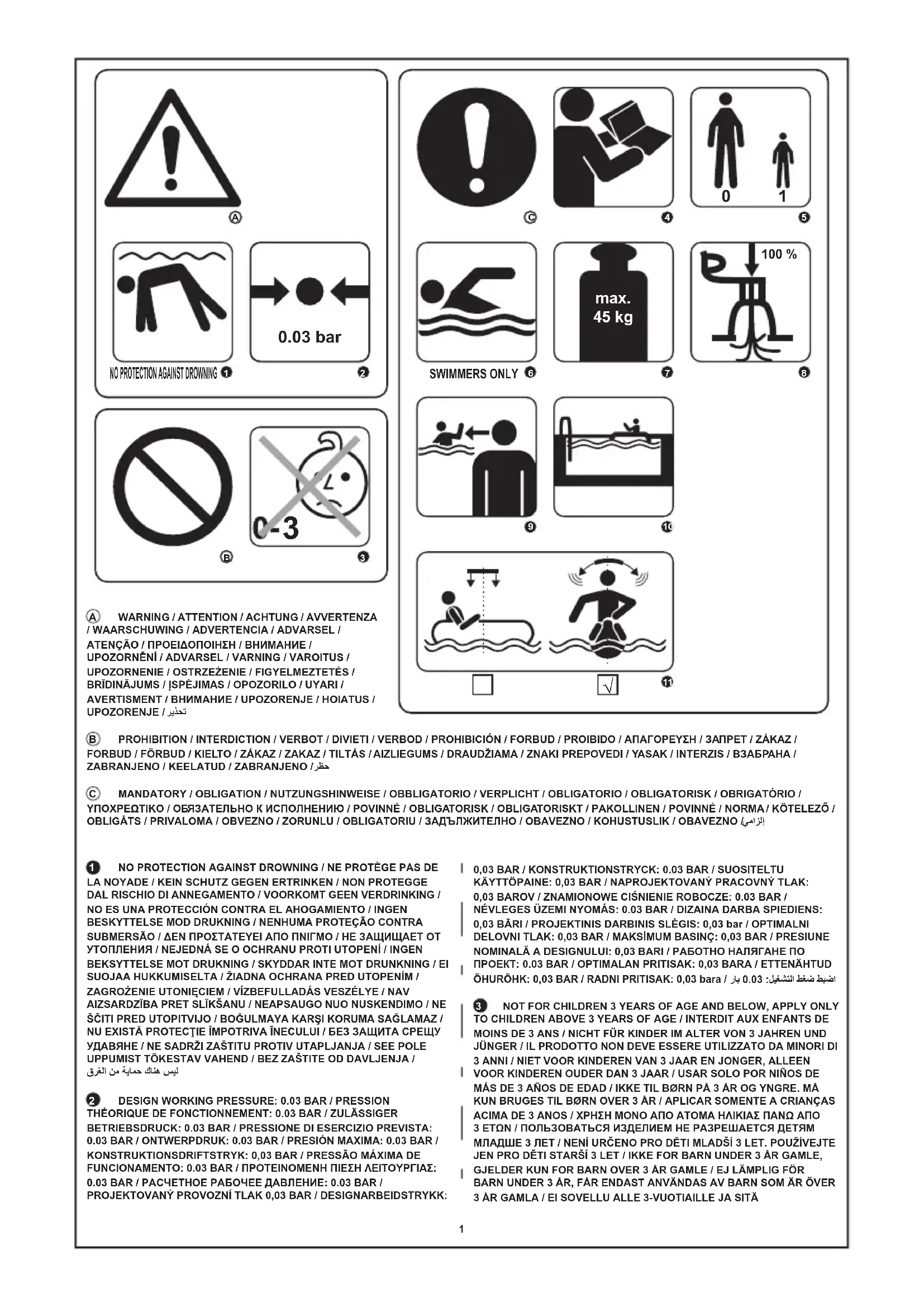 - Distribuez uniformément les charges lors de l’utilisation du produit. Une distribution inégale des charges peut entraîner un basculement et la noyade. GONFLAGE 1. Avant d’utiliser ce produit, contrôlez soigneusement s’il y a des fuites ou des parties cassées. Ouvrez la soupape de sécurité et gonflez à l'aide de la pompe à air (non comprise) pour obtenir la pression de service maximale du produit. 2. Remplissez les chambres jusqu’à la disparition de la plupart des plis et jusqu’à ce qu’elles soient fermes au toucher, mais PAS dures. Si vous utilisez un autre manomètre, la pression ne doit pas dépasser la pression indiquée sur le produit ou sur les instructions. Ne pas surgonfler le produit. Ne pas utiliser de compresseur à air. Remarque: Un surgonflage et un sous-gonflage du produit peuvent provoquer des dangers pour la sécurité. Il vaut mieux contrôler la pression du produit avant chaque utilisation. 3. Contrôlez que les soupapes sont bien fermées après le gonflage, appuyez sur les soupapes de sécurité après le gonflage. Remarque: Ne restez pas debout sur le produit et n’y posez pas d’objets pendant le gonflage. Contrôlez toujours s'il y a des fuites avant l'utilisation. DÉGONFLAGE Ouvrez et pincez le sommet des soupapes pour dégonfler.