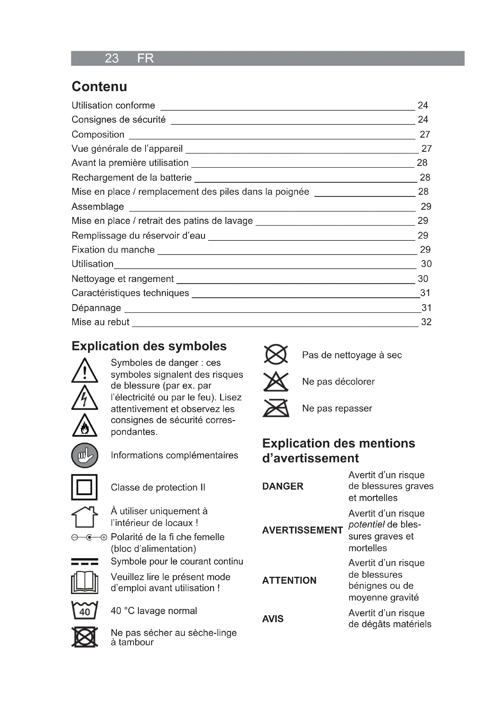 All rights reserved.23 FR Contenu Utilisation conforme ________________________________________________ 24 Consignes de sécurité ______________________________________________ 24 Composition ______________________________________________________ 27 Vue générale de l’appareil ____________________________________________ 27 Avant la première utilisation __________________________________________ 28 Rechargement de la batterie __________________________________________ 28 Mise en place / remplacement des piles dans la poignée ___________________ 28 Assemblage ______________________________________________________ 29 Mise en place / retrait des patins de lavage ______________________________ 29 Remplissage du réservoir d’eau _______________________________________ 29 Fixation du manche _________________________________________________ 29 Uti lisati on _________________________________________________________ 3 0 Nettoyage et rangement _____________________________________________ 30 Caractéristiques techniques ___________________________________________31 Dépannage ________________________________________________________31 Mise au rebut ______________________________________________________ 32 Explication des symboles Symboles de danger : ces symboles signalent des risques de blessure (par ex. par l’électricité ou par le feu). Lisez attentivement et observez les consignes de sécurité corres- pondantes. Informations complémentaires Classe de protection II À utiliser uniquement à l’intérieur de locaux ! Polarité de la fi che femelle (bloc d’alimentation) Symbole pour le courant continu Veuillez lire le présent mode d’emploi avant utilisation ! 40 °C lavage normal Ne pas sécher au sèche-linge à tambour Pas de nettoyage à sec Ne pas décolorer Ne pas repasser Explication des mentions d’avertissement DANGER Avertit d’un risque de blessures graves et mortelles AVERTISSEMENT Avertit d’un risque potentiel de bles- sures graves et mortelles ATTENTION Avertit d’un risque de blessures bénignes ou de moyenne gravité AVIS Avertit d’un risque de dégâts matérielsFR 24 Utilisation conforme