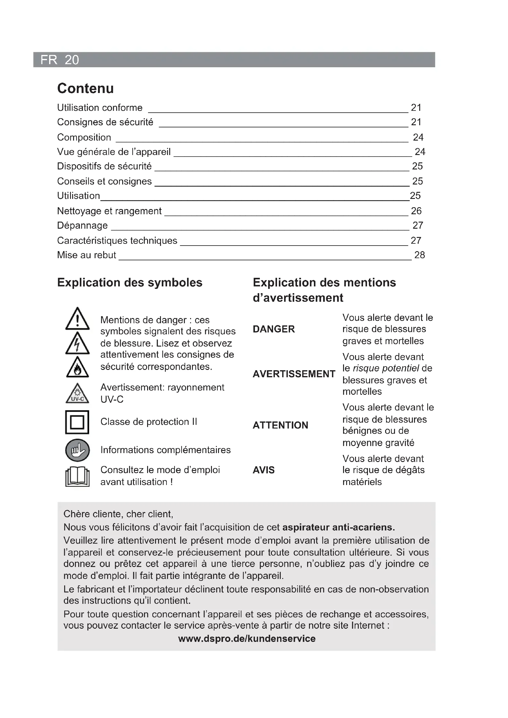 UV-C Classe de protection II Informations complémentaires Consultez le mode d’emploi avant utilisation ! Explication des mentions d’avertissement DANGER Vous alerte devant le risque de blessures graves et mortelles AVERTISSEMENT Vous alerte devant le risque potentiel de blessures graves et mortelles ATTENTION Vous alerte devant le risque de blessures bénignes ou de moyenne gravité AVIS Vous alerte devant le risque de dégâts matériels Contenu Utilisation conforme ________________________________________________ 21 Consignes de sécurité ______________________________________________ 21 Composition ______________________________________________________ 24 Vue générale de l’appareil ____________________________________________ 24 Dispositifs de sécurité _______________________________________________ 25 Conseils et consignes _______________________________________________ 25 Uti lisati on _________________________________________________________ 25 Nettoyage et rangement _____________________________________________ 26 Dépannage _______________________________________________________ 27 Caractéristiques techniques __________________________________________ 27 Mise au rebut ______________________________________________________ 2821 FR Utilisation conforme