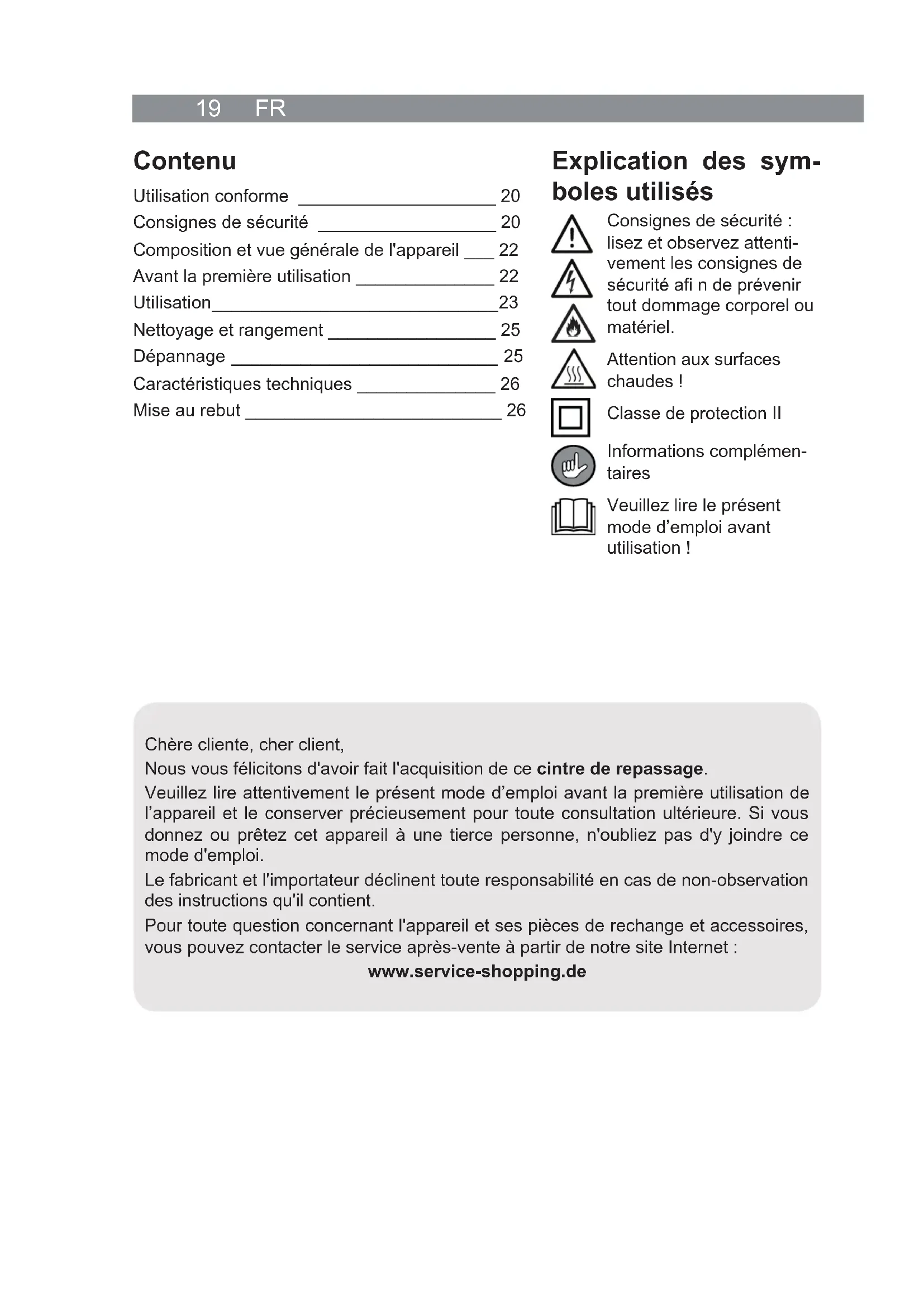 - You might notice a slight odour caused by production res- idues the fi rst time you use the device. However, this is harmless and will cease as you use the device.EN 18 Technical Data Article number: 00348 Model number: EL17001-00100 Voltage supply: 220 – 240 V ~ 50 Hz Power: 1800 W Protection class: II Disposal The packaging material is recyclable. Dispose of the packaging in an environ- mentally friendly manner and take it to a recycling centre. Dispose of the device in an environmentally friendly manner. It should not be disposed of in the normal domestic waste. Dispose of the device at a recycling centre for used electrical and electronic devices. More information is available from your local authorities. Customer Service / Importer: DS Produkte GmbH Am Heisterbusch 1 19258 Gallin Germany Tel.: +49 38851 314650 (Calls to German landlines are subject to charges. The cost varies depending on the service provider.) All rights reserved.19 FR Contenu Utilisation conforme ____________________ 20 Consignes de sécurité __________________ 20 Composition et vue générale de l'appareil ___ 22 Avant la première utilisation ______________ 22 Uti lisati on _____________________________ 23 Nettoyage et rangement _________________ 25 Dépannage ___________________________ 25 Caractéristiques techniques ______________ 26 Mise au rebut __________________________ 26 Explication des sym- boles utilisés Consignes de sécurité : lisez et observez attenti- vement les consignes de sécurité afi n de prévenir tout dommage corporel ou matériel. Attention aux surfaces chaudes ! Classe de protection II Informations complémen- taires Veuillez lire le présent mode d’emploi avant utilisation ! Chère cliente, cher client, Nous vous félicitons d'avoir fait l'acquisition de ce cintre de repassage. Veuillez lire attentivement le présent mode d’emploi avant la première utilisation de l’appareil et le conserver précieusement pour toute consultation ultérieure. Si vous donnez ou prêtez cet appareil à une tierce personne, n'oubliez pas d'y joindre ce mode d'emploi. Le fabricant et l'importateur déclinent toute responsabilité en cas de non-observation des instructions qu'il contient. Pour toute question concernant l'appareil et ses pièces de rechange et accessoires, vous pouvez contacter le service après-vente à partir de notre site Internet : www.service-shopping.deFR 20 Utilisation conforme