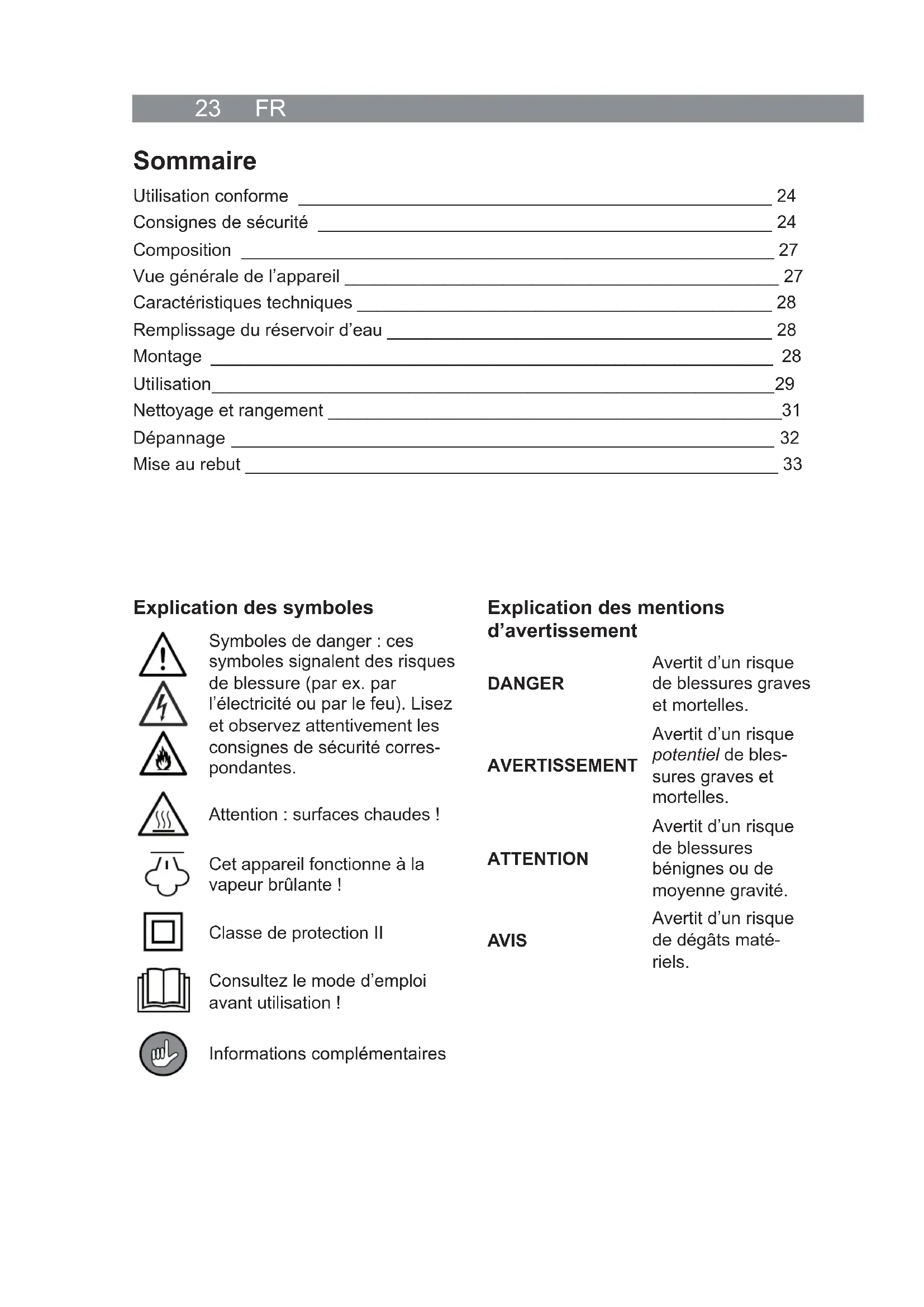 Utilisation conforme 24 Consignes de sécurité 24 Composition 27 Vue générale de l'appareil 27 Caractéristiques techniques 28 Remplissage du réservoir d'eau 28 Montage 28 Utilisation 29 Nettoyage et rangement 31 Dépannage 32 Mise au rebut 33