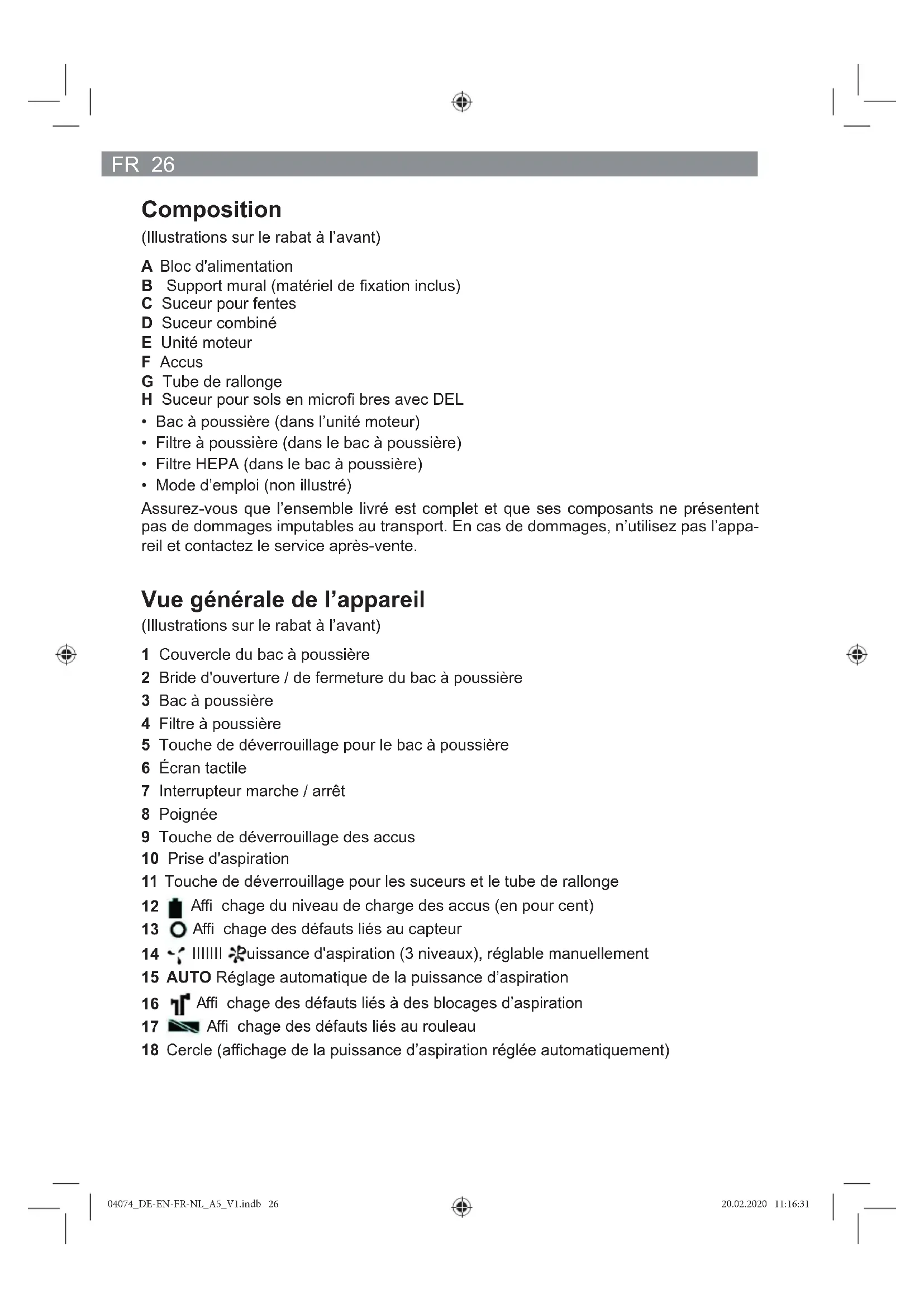 Bloc d'alimentation et de com- mutation Isolation électrique sûre Consultez le mode d'emploi avant utilisation ! Explication des mentions d’avertissement DANGER Avertit d’un risque de blessures graves et mortelles AVERTISSEMENT Avertit d’un risque potentiel de bles- sures graves et mortelles ATTENTION Avertit d’un risque de blessures bénignes ou de moyenne gravité AVIS Avertit d’un risque de dégâts matériels 04074_DE-EN-FR-NL_A5_V1.indb 2504074_DE-EN-FR-NL_A5_V1.indb 25 20.02.2020 11:16:3120.02.2020 11:16:31FR 26 Composition (Illustrations sur le rabat à l’avant) A Bloc d'alimentation B Support mural (matériel de fi xation inclus) C Suceur pour fentes D Suceur combiné E Unité moteur F Accus G Tube de rallonge H Suceur pour sols en microfi bres avec DEL