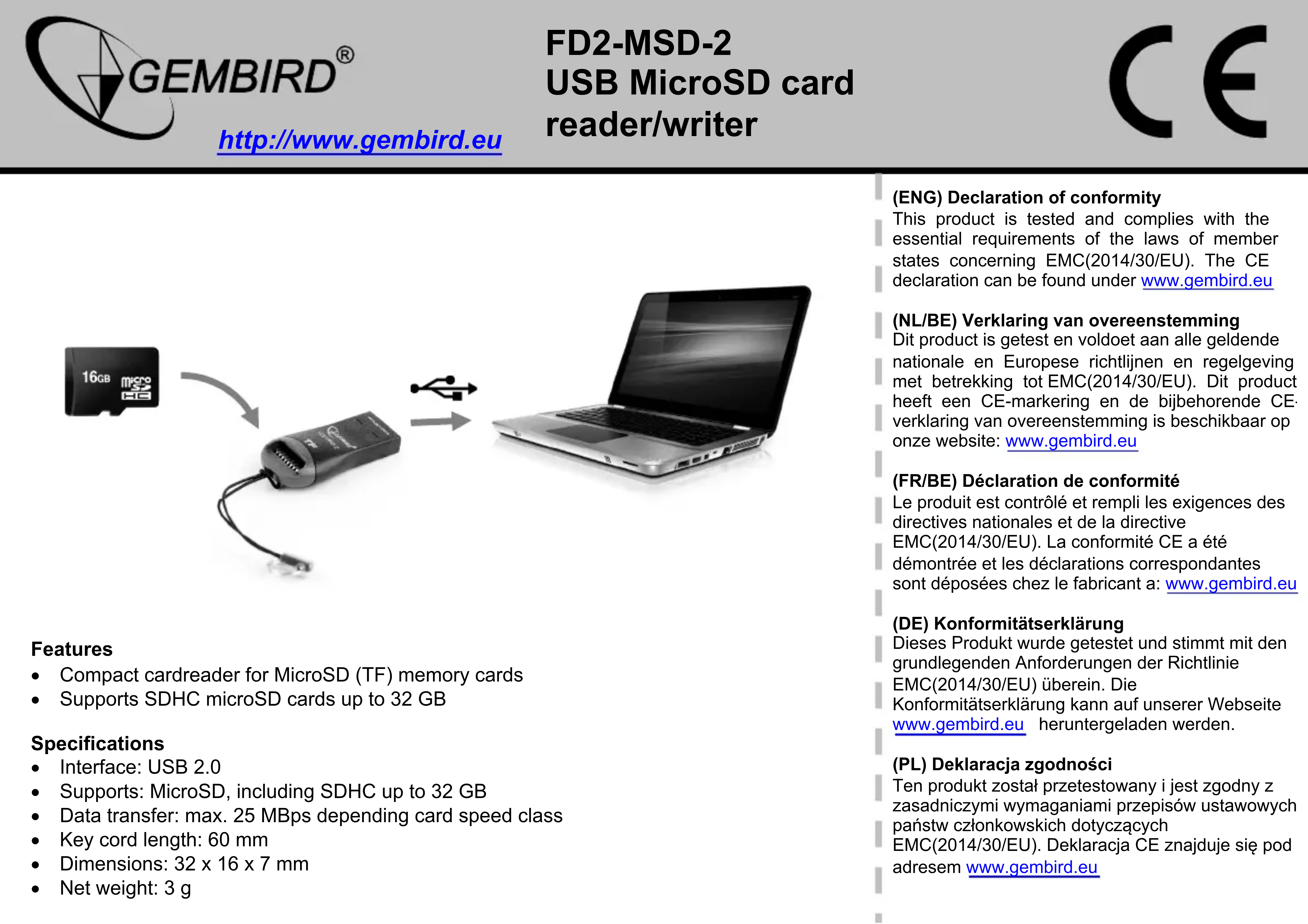 FD2MSD3 - Lecteur de carte mémoire USB Gembird - Notice d'utilisation et mode d'emploi gratuit
