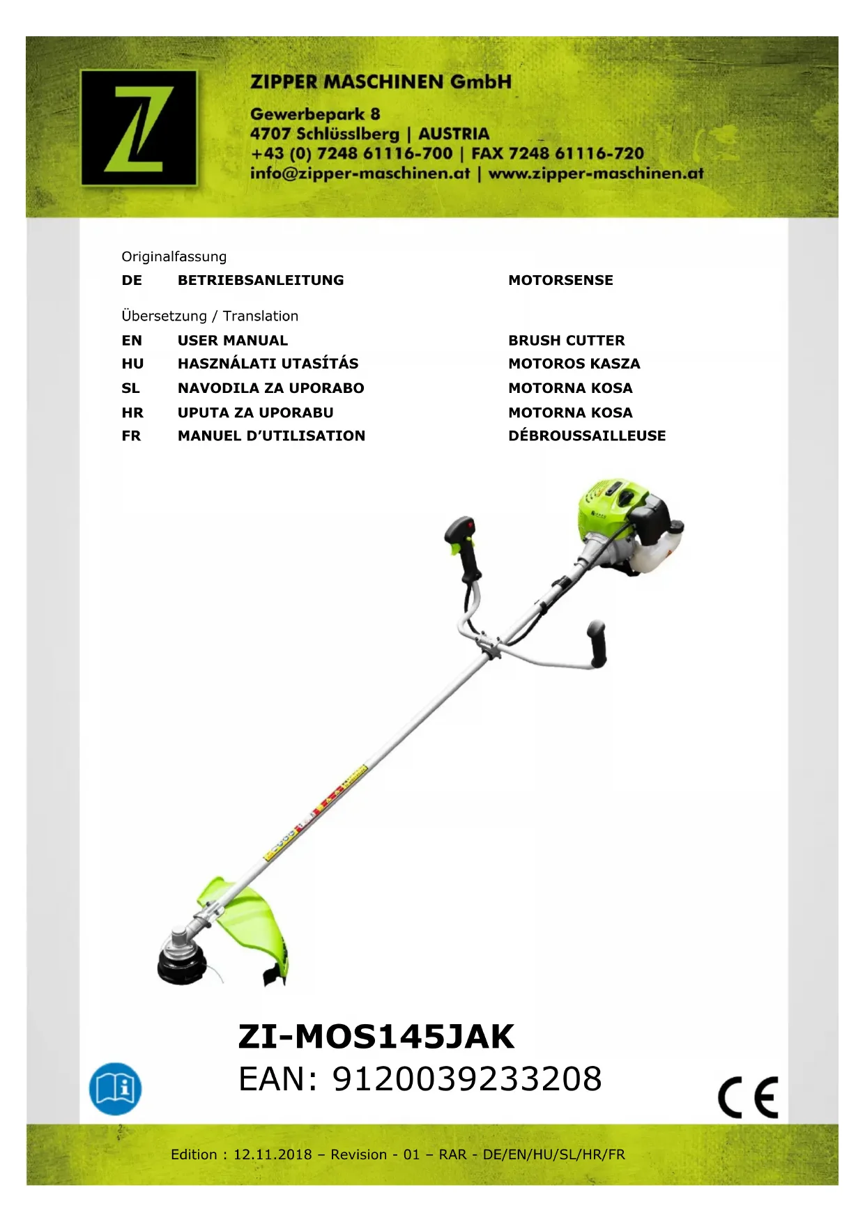 NAPOMENA Ako niste u stanju uredno provesti potrebne popravke ili nemate za to propisanu obuku, za uklanjanje problema uvijek potražite specijaliziranu radionicu.AVANT-PROPOS (FR) ZIPPER MASCHINEN GmbH www.Zipper-Maschinen.at 54 ZI-MOS145JAK 35 AVANT-PROPOS (FR) Cher client, chère cliente, Le présent manuel d’exploitation contient des informations et des recommandations importantes relatives à la mise en service et à la manipulation de la débroussailleuse ZI-MOS145JAK. Ci-après, la désignation commerciale courante de la machine (voir page de garde) du présent manuel d’exploitation est remplacée par la dénomination « machine ». Le manuel d’exploitation fait partie intégrante de la machine et ne doit pas être éliminé. Conservez- le pour un usage ultérieur et incluez ce manuel de la machine lorsque vous transmettez la machine à une tierce personne ! Veuillez respecter les consignes de sécurité ! Avant la mise en service, veuillez lire minutieusement le présent manuel. La manipulation correcte vous facilitera la prévention de malentendus et dommages causés possibles. Respectez les consignes de sécurité et les avertissements. Toute inobservation peut occasionner de graves blessures. Nos produits peuvent légèrement diverger des illustrations et des contenus en raison du développement constant. Si vous décelez des erreurs, veuillez nous en informer. Sous réserve de modifications techniques ! Droits d’auteur © 2018 Cette documentation est protégée par droit d’auteur. Les droits constitutionnels ainsi réservés ! En particulier, la réimpression, la traduction et l’extrait de photographies et d'illustrations feront l'objet de poursuites judiciaires. Le tribunal compétent est le tribunal régional de Linz ou le tribunal compétent pour 4707 Schlüsslberg.