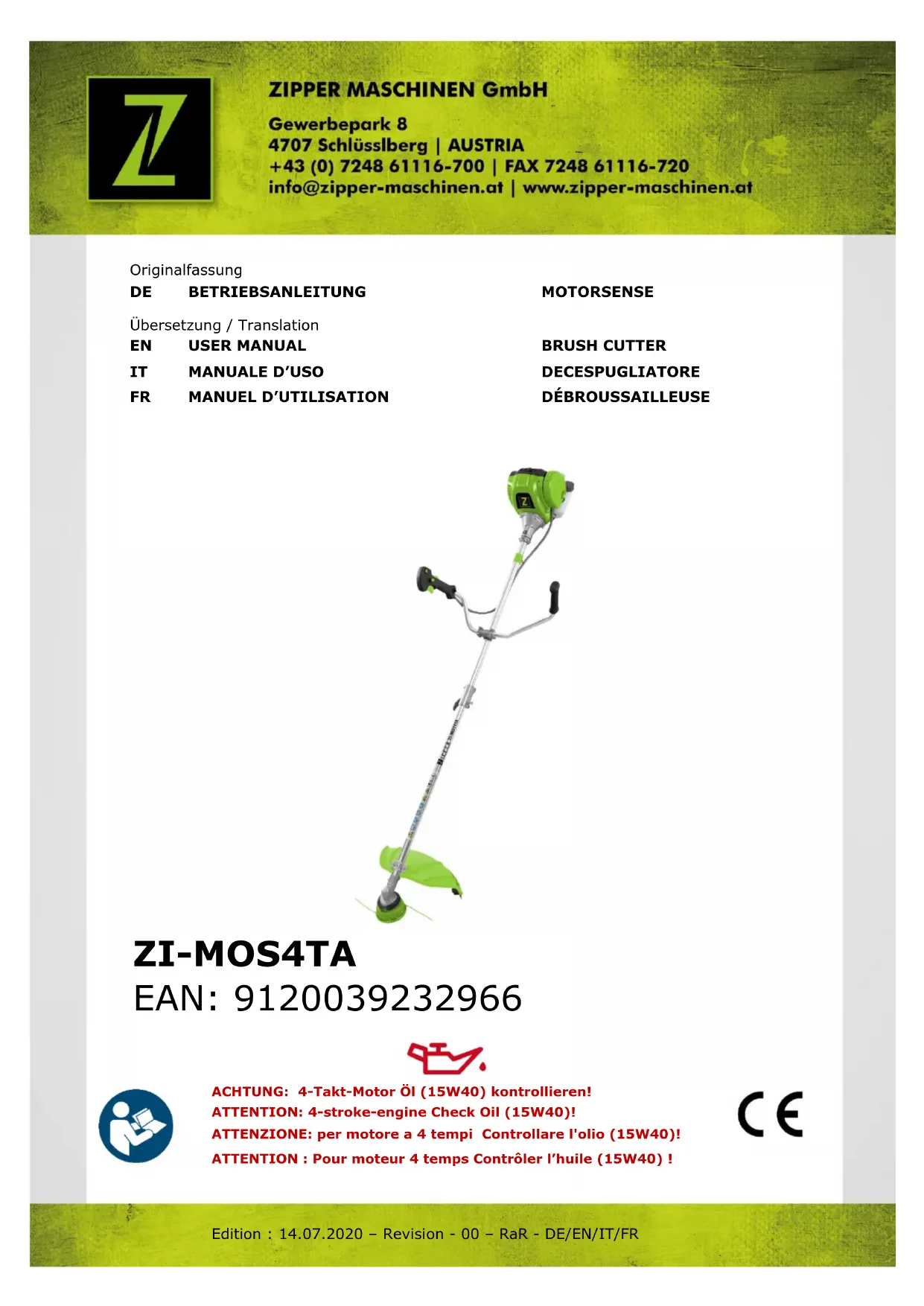 NOTA Se ritieni di non essere in grado di eseguire correttamente le riparazioni necessarie o se non hai la formazione richiesta per farlo, porta sempre un'officina per riparare il problema.INHALT / INDEX / INDICE/ ZIPPER MASCHINEN GmbH www.Zipper-Maschinen.at 40 ZI-MOS4TA 22 AVANT-PROPOS (FR) Cher client, chère cliente, Le présent manuel d’exploitation contient des informations et des recommandations importantes relatives à la mise en service et à la manipulation de la débroussailleuse ZI-MOS145A / ZI-MOS4TA. Ci-après, la désignation commerciale courante de la machine (voir page de garde) du présent manuel d’exploitation est remplacée par la dénomination « machine ». Le manuel d’exploitation fait partie intégrante de la machine et ne doit pas être éliminé. Conservez- le pour un usage ultérieur et incluez ce manuel de la machine lorsque vous transmettez la machine à une tierce personne ! Veuillez respecter les consignes de sécurité ! Avant la mise en service, veuillez lire minutieusement le présent manuel. La manipulation correcte vous facilitera la prévention de malentendus et dommages causés possibles. Respectez les consignes de sécurité et les avertissements. Toute inobservation peut occasionner de graves blessures. Nos produits peuvent légèrement diverger des illustrations et des contenus en raison du développement constant. Si vous décelez des erreurs, veuillez nous en informer. Sous réserve de modifications techniques ! Droits d’auteur © 2017 Cette documentation est protégée par droit d’auteur. Les droits constitutionnels ainsi réservés ! En particulier, la réimpression, la traduction et l’extrait de photographies et d'illustrations feront l'objet de poursuites judiciaires. Le tribunal compétent est le tribunal régional de Linz ou le tribunal compétent pour 4707 Schlüsslberg.