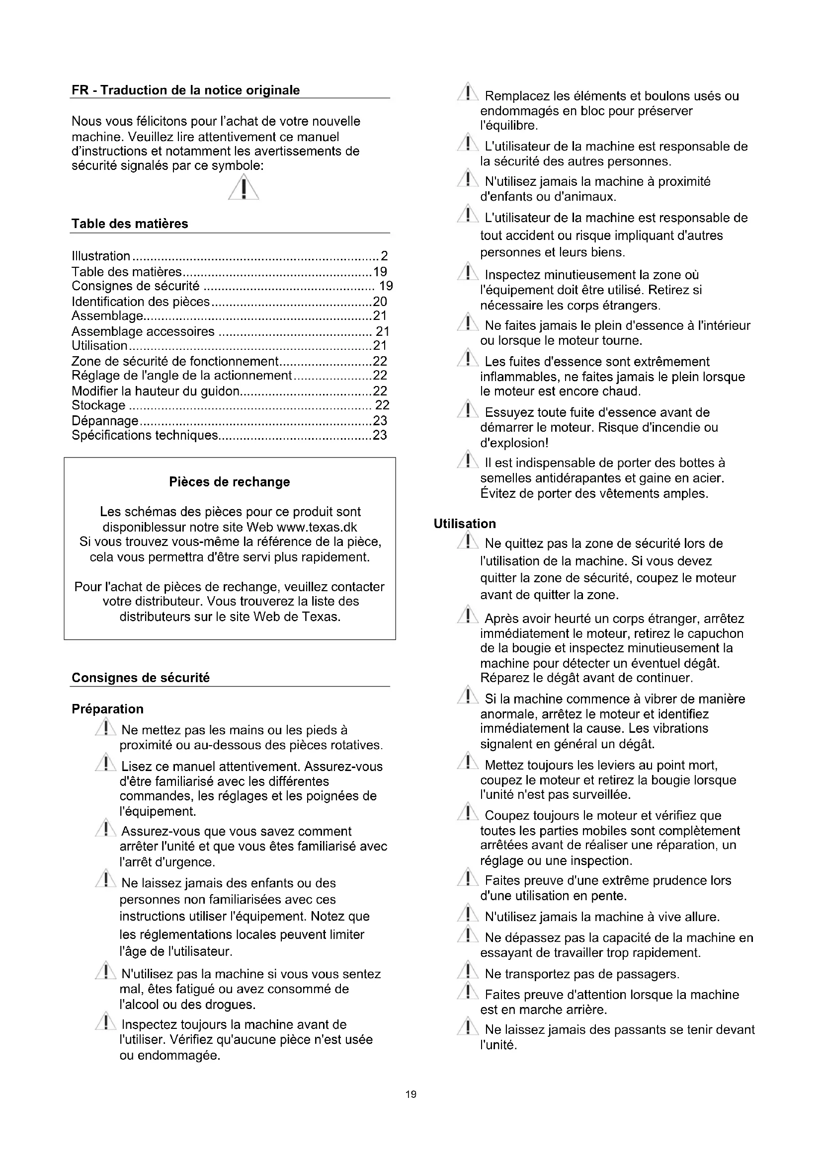 Pièces de rechange Les schémas des pièces pour ce produit sont disponiblessur notre site Web www.texas.dk Si vous trouvez vous-même la référence de la pièce, cela vous permettra d'être servi plus rapidement. Pour l'achat de pièces de rechange, veuillez contacter votre distributeur. Vous trouverez la liste des distributeurs sur le site Web de Texas.
