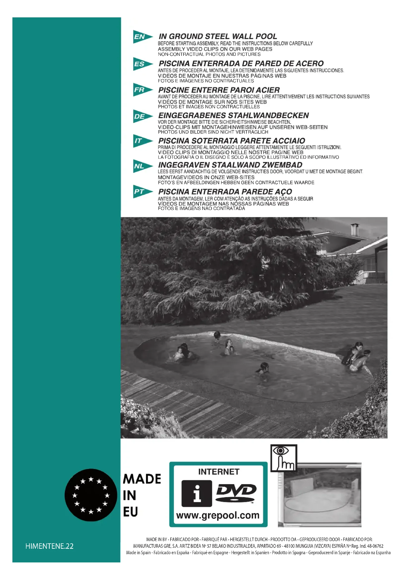 - Dommages provoqués par une mauvaise manipulation ou un montage non conforme. IMPORTANT : La société Manufacturas Gre eectue des échanges de composants contre reprise pour expertise. Si , après expertise, aucune anomalie ou dysfonctionnement n’est avéré, la société Manufac- turas Gre se réserve le droit de facturer les frais de port et autres frais divers au client. DURÉE DE LA GARANTIE : Les piscines Gre sont soumises à la garantie légale établie par la loi générale concernant la protection des consommateurs et utilisateurs, c’est-à-dire 2 années depuis la date d’achat et d’après les conditions de cette dernière. Nous vous rappelons que pour que la garantie soit applicable, il est nécessaire de présenter le document certiant l’achat et/ou la livraison du produit. Manufacturas Gre fournit par ailleurs une garantie commerciale de 2 années supplémentai- res pour ce modèle de piscine, ce qui représente un total de 4 années, uniquement en ce qui concerne les pièces métalliques de la structure de la piscine. Cette garantie commerciale supplémentaire n’a aucun eet sur les droits du consommateur par rapport à la garantie légale. Les éléments exclus des deux garanties sont les suivants :