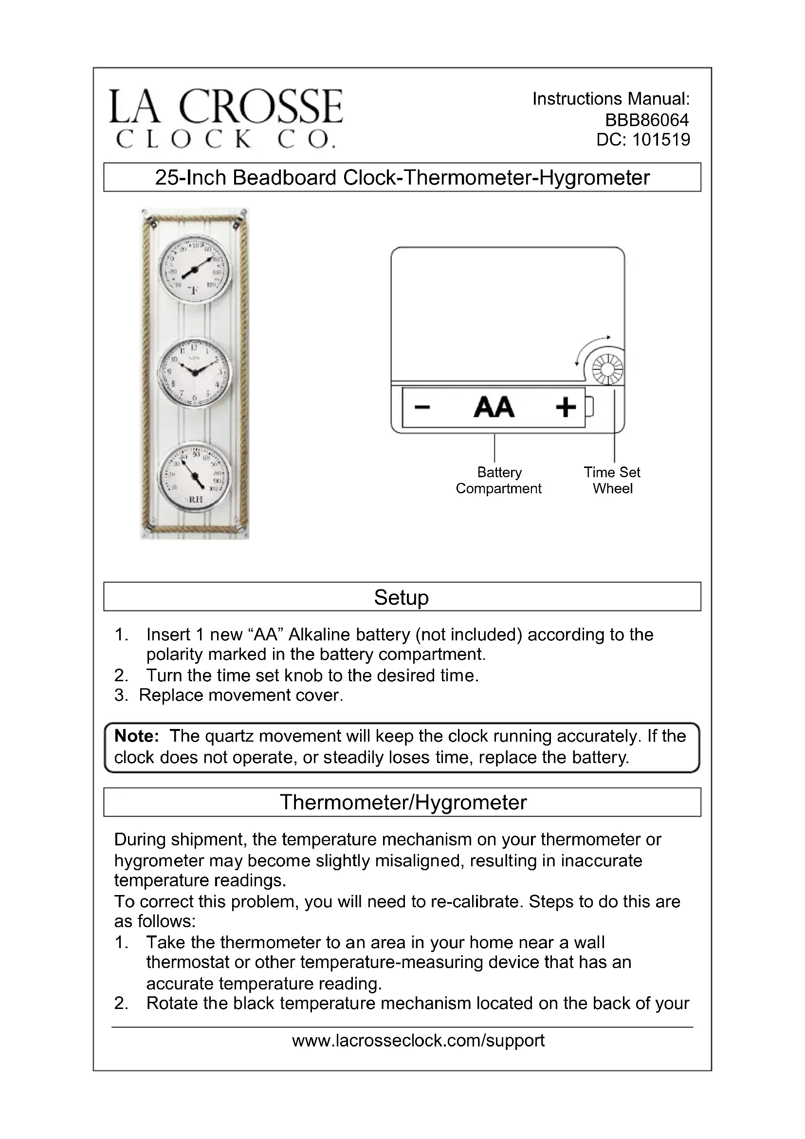 Garantie Limitée Ce produit est garanti exempt de défauts de matériaux et de fabrication, en utilisation normale et de service pour une période de 1 an à compter de la date de la vente au client. La garantie ne s'applique pas aux défauts résultant d'abus, d'accidents, ou d'abus. Si un défaut auquel cette garantie s'applique se pose au cours de la période de garantie, retourner l'horloge immédiatement (port payé) avec une preuve d'achat indiquant la date où l'horloge a été acheté à l'adresse suivante et ces défauts seront réparés ou les produits seront remplacés sans frais à la discrétion de La Crosse Clock Company. La Crosse Clock Company Département de garantie 2830 South 26th Street La Crosse, WI 54601 www.lacrosseclock.com/support Caractéristiques Alimentation: 1 batterie AA LR6 alcaline Autonomie de la batterie: plus de 12 mois Dimensions: 25.10”H x 8.00”W x 0.57”D (63.75 cm x 20.32 cm H x P 1.46cm) Entretien et maintenance