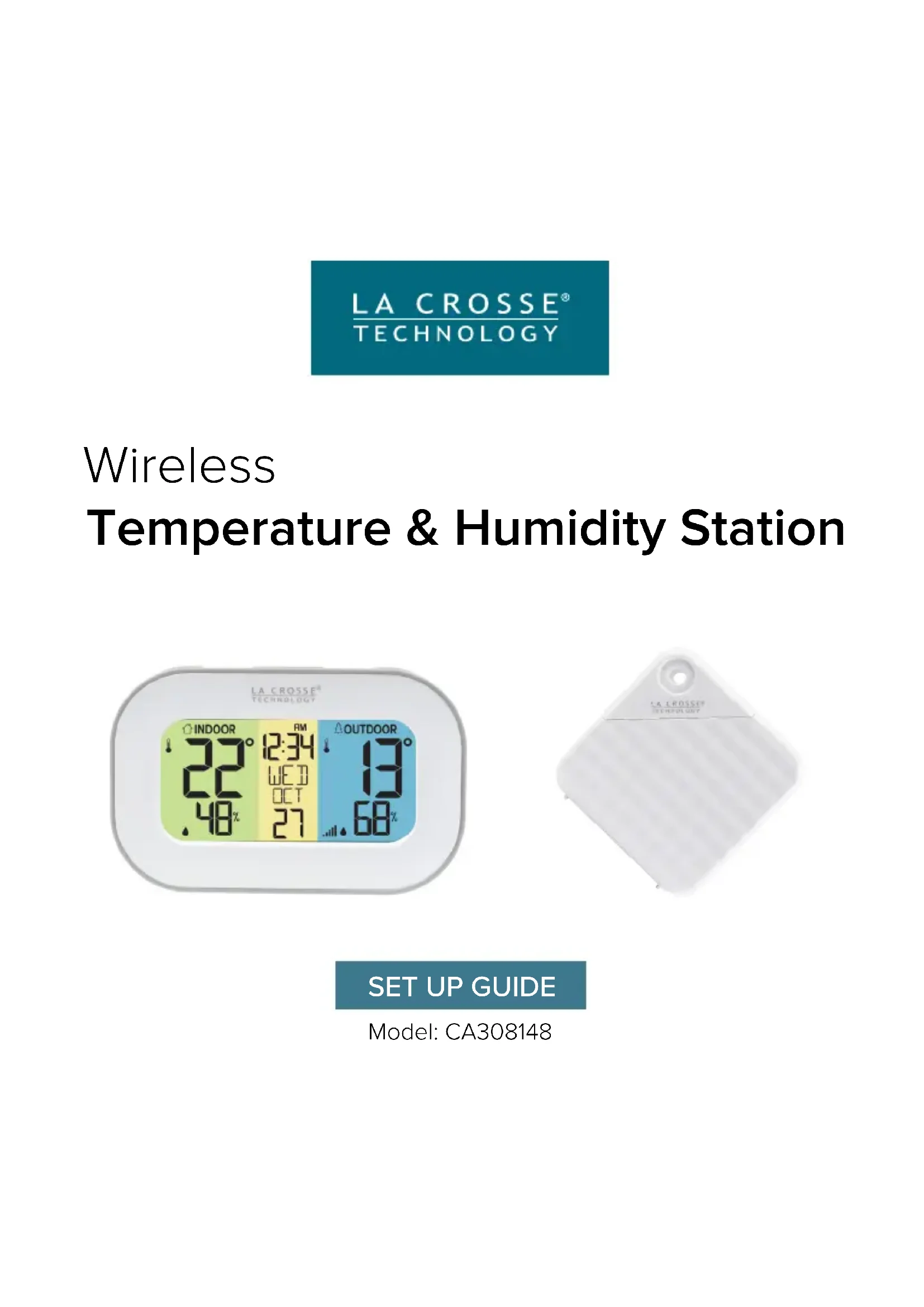 - Si vous n’arrivez toujours pas à rétablir la connexion, consultez notre page de soutien ici : bit.ly/basic_restart pour obtenir plus d’information sur les mesures de dépannage.7 Station (CA308148) Alimentation : 2 piles AAA (non incluses) Durée de vie des piles : jusqu’à 12 mois Plage de températures : de 0 ºC à 50 ºC (de 32 ºF à 122 ºF) Plage du taux d’humidité : de 10 % à 99 % H.R. Dimensions : 11,75 cm L x 2,02 cm P x 7,43 cm H (4,63 po L x 0,79 po P x 2,93 po H) Capteur (TX147TH) Alimentation : 2 piles AAA (non incluses) Durée de vie des piles : jusqu’à 12 mois Plage de températures : de -40 ºC à 60 ºC (de -40 ºF à 140 ºF) Plage du taux d’humidité : de 10 % à 99 % H.R. Portée de transmission : 100 mètres (330 pieds) en champ libre, 433 MHz Intervalle d’actualisation : toutes les 51 secondes environ Dimensions : 6,52 cm L x 1,98 cm La x 6,6 cm H (2,57 po L x 0,78 po La x 2,6 po H) Ce produit fonctionne avec des piles alcalines. Cependant, il est suggéré d’utiliser des piles au lithium dans les zones où les températures sont constamment inférieures à -30 °C (-22 °F) CARACTÉRISTIQUES Posez des questions, regardez des vidéos d’installation et faites part de vos opinions et observations sur les réseaux sociaux! Suivez La Crosse Technology sur YouTube, Twitter, Facebook et Instagram.