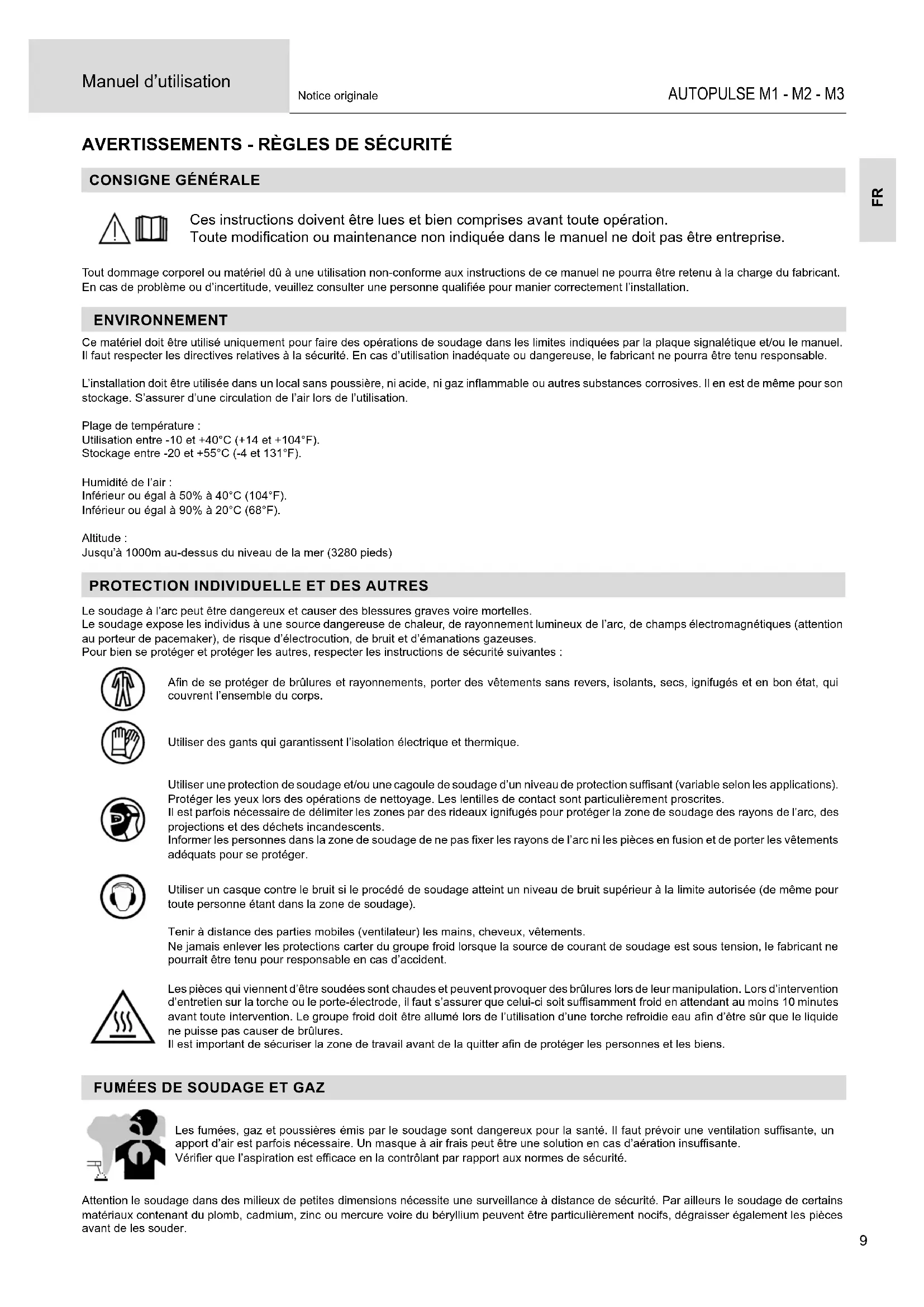 Le réseau électrique utilisé doit impérativement avoir une mise à la terre. Utiliser la taille de fusible recommandée sur le tableau signalétique. Une décharge électrique peut être une source d’accident grave direct ou indirect, voire mortel. Ne jamais toucher les parties sous tension à l’intérieur comme à l’extérieur de la source de courant sous-tension (Torches, pinces, câbles, électrodes) car celles-ci sont branchées au circuit de soudage. Avant d’ouvrir la source de courant de soudage, il faut la déconnecter du réseau et attendre 2 minutes. an que l’ensemble des condensateurs soit déchargé. Ne pas toucher en même temps la torche ou le porte-électrode et la pince de masse. Veiller à changer les câbles, torches si ces derniers sont endommagés, par des personnes qualiées et habilitées. Dimensionner la section des câbles en fonction de l’application. Toujours utiliser des vêtements secs et en bon état pour s’isoler du circuit de soudage. Porter des chaussures isolantes, quel que soit le milieu de travail. CLASSIFICATION CEM DU MATERIEL (VERSION 230 V) Ce matériel de Classe A n’est pas prévu pour être utilisé dans un site résidentiel où le courant électrique est fourni par le réseau public d’alimentation basse tension. Il peut y avoir des dicultés potentielles pour assurer la compatibilité électromagnétique dans ces sites, à cause des perturbations conduites, aussi bien que rayonnées à fréquence radioélectrique. Ce matériel est conforme à la CEI 61000-3-12. Sous réserve que l’impédance de réseau public d’alimentation basse tension au point de couplage commun soit inférieure à Zmax = 0.349 Ohms, ce matériel est conforme à la CEI 61000-3-11 et peut être connecté aux réseaux publics d’alimentation basse tension. Il est de la responsabilité de l’installateur ou de l’utilisateur du matériel de s’assurer, en consultant l’opérateur du réseau de distribution si nécessaire, que l’impédance de réseau est conforme aux restrictions d’impédance. EMISSIONS ELECTRO-MAGNETIQUES Le courant électrique passant à travers n’importe quel conducteur produit des champs électriques et magnétiques (EMF) localisés. Le courant de soudage produit un champ électromagnétique autour du circuit de soudage et du matériel de soudage. Les champs électromagnétiques EMF peuvent perturber certains implants médicaux, par exemple les stimulateurs cardiaques. Des mesures de protection doivent être prises pour les personnes portant des implants médicaux. Par exemple, restrictions d’accès pour les passants ou une évaluation de risque individuelle pour les soudeurs.FR