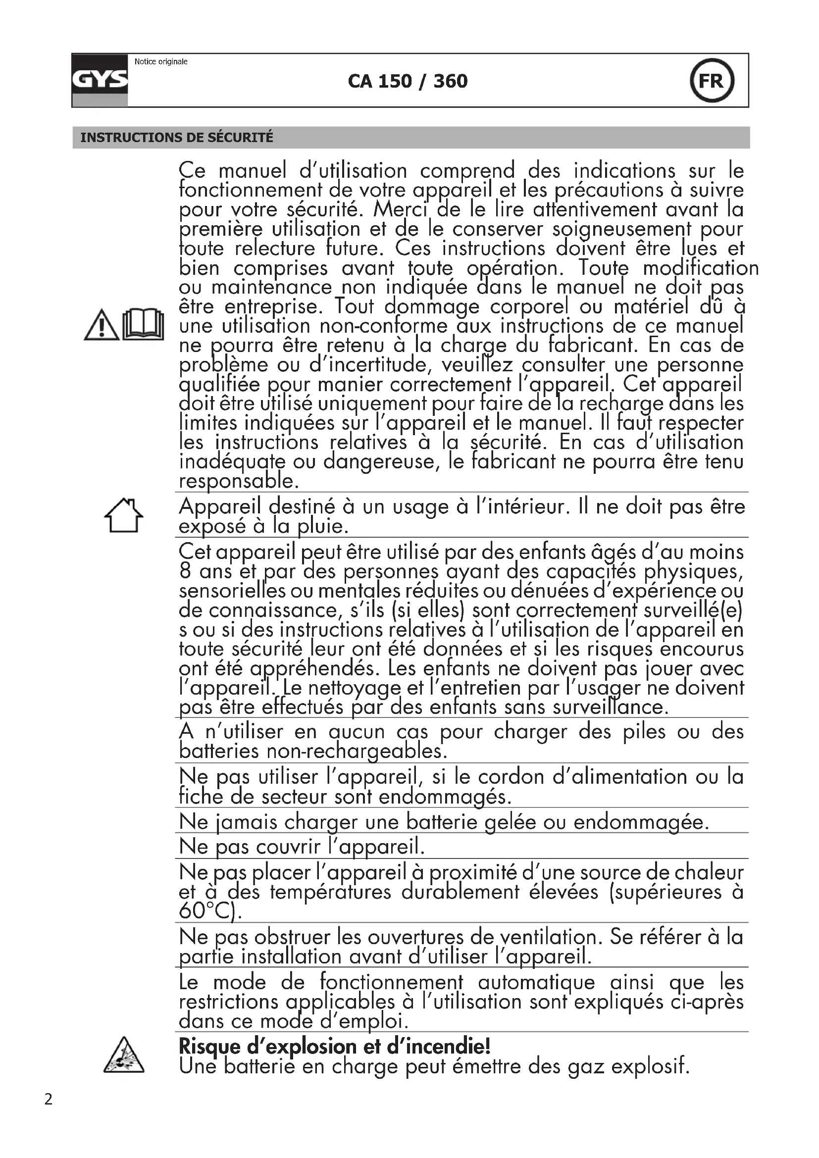 Ce manuel d’utilisation comprend des indications sur le fonctionnement de votre appareil et les précautions à suivre pour votre sécurité. Merci de le lire attentivement avant la première utilisation et de le conserver soigneusement pour toute relecture future. Ces instructions doivent être lues et bien comprises avant toute opération. Toute modication ou maintenance non indiquée dans le manuel ne doit pas être entreprise. Tout dommage corporel ou matériel dû à une utilisation non-conforme aux instructions de ce manuel ne pourra être retenu à la charge du fabricant. En cas de problème ou d’incertitude, veuillez consulter une personne qualiée pour manier correctement l’appareil. Cet appareil doit être utilisé uniquement pour faire de la recharge dans les limites indiquées sur l’appareil et le manuel. Il faut respecter les instructions relatives à la sécurité. En cas d’utilisation inadéquate ou dangereuse, le fabricant ne pourra être tenu responsable. Appareil destiné à un usage à l’intérieur. Il ne doit pas être exposé à la pluie. Cet appareil peut être utilisé par des enfants âgés d’au moins 8 ans et par des personnes ayant des capacités physiques, sensorielles ou mentales réduites ou dénuées d’expérience ou de connaissance, s’ils (si elles) sont correctement surveillé(e) s ou si des instructions relatives à l’utilisation de l’appareil en toute sécurité leur ont été données et si les risques encourus ont été appréhendés. Les enfants ne doivent pas jouer avec l’appareil. Le nettoyage et l’entretien par l’usager ne doivent pas être effectués par des enfants sans surveillance. A n’utiliser en aucun cas pour charger des piles ou des batteries non-rechargeables. Ne pas utiliser l’appareil, si le cordon d’alimentation ou la che de secteur sont endommagés. Ne jamais charger une batterie gelée ou endommagée. Ne pas couvrir l’appareil. Ne pas placer l’appareil à proximité d’une source de chaleur et à des températures durablement élevées (supérieures à 60°C). Ne pas obstruer les ouvertures de ventilation. Se référer à la partie installation avant d’utiliser l’appareil. Le mode de fonctionnement automatique ainsi que les restrictions applicables à l’utilisation sont expliqués ci-après dans ce mode d’emploi. Risque d’explosion et d’incendie! Une batterie en charge peut émettre des gaz explosif.3 CA 150 / 360